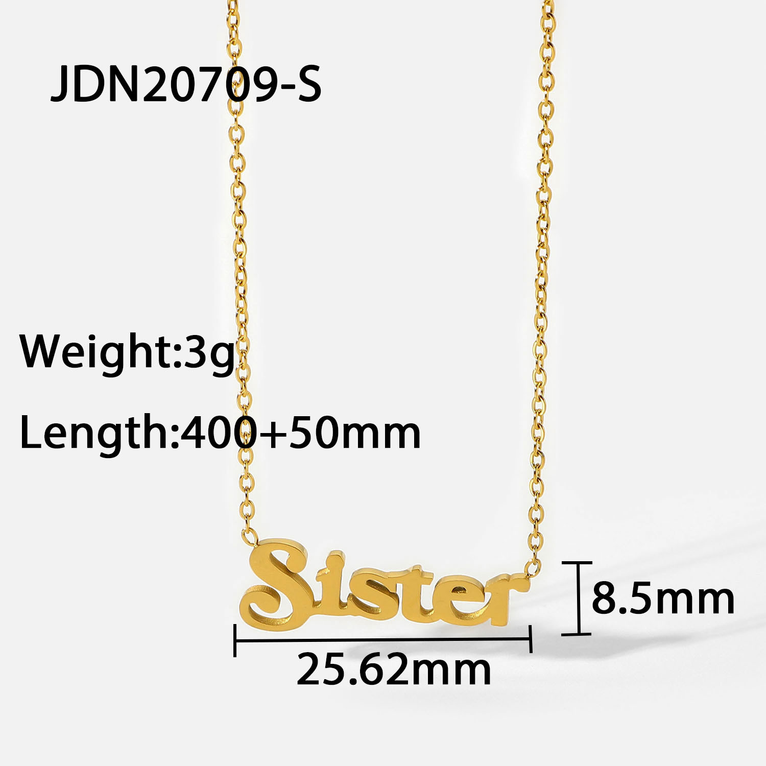 描述:风格:简约,材质:不锈钢,处理工艺:电镀,品牌:Youthway,生产编号:JDN20709-S,销售序列号:JDN20709-S,种类:项坠、吊坠,样式:女式,造型:字母,包装:独立包装,适用送礼场合:婚庆,旅游纪念,员工福利,加工定制:是,货号:JDN20709-S,产地:浙江义乌,链子样式:圆珠链,是否多层:是,是否带坠:是,延长链:10cm以下,坠子材质:钛钢,周长:21cm(含)-50cm(含),系列:吊坠项链,形象:字母项链,主要下游平台:ebay,亚马逊,wish,速卖通,独立站,LAZADA,颜色:JDN20709-S,主要销售地区:非洲,欧洲,南美,东南亚,北美,东北亚,中东,有可授权的自有品牌:是,是否跨境出口专供货源:是,流行元素:金属,复古,链条,几何,上市年份/季节:2021年秋季,