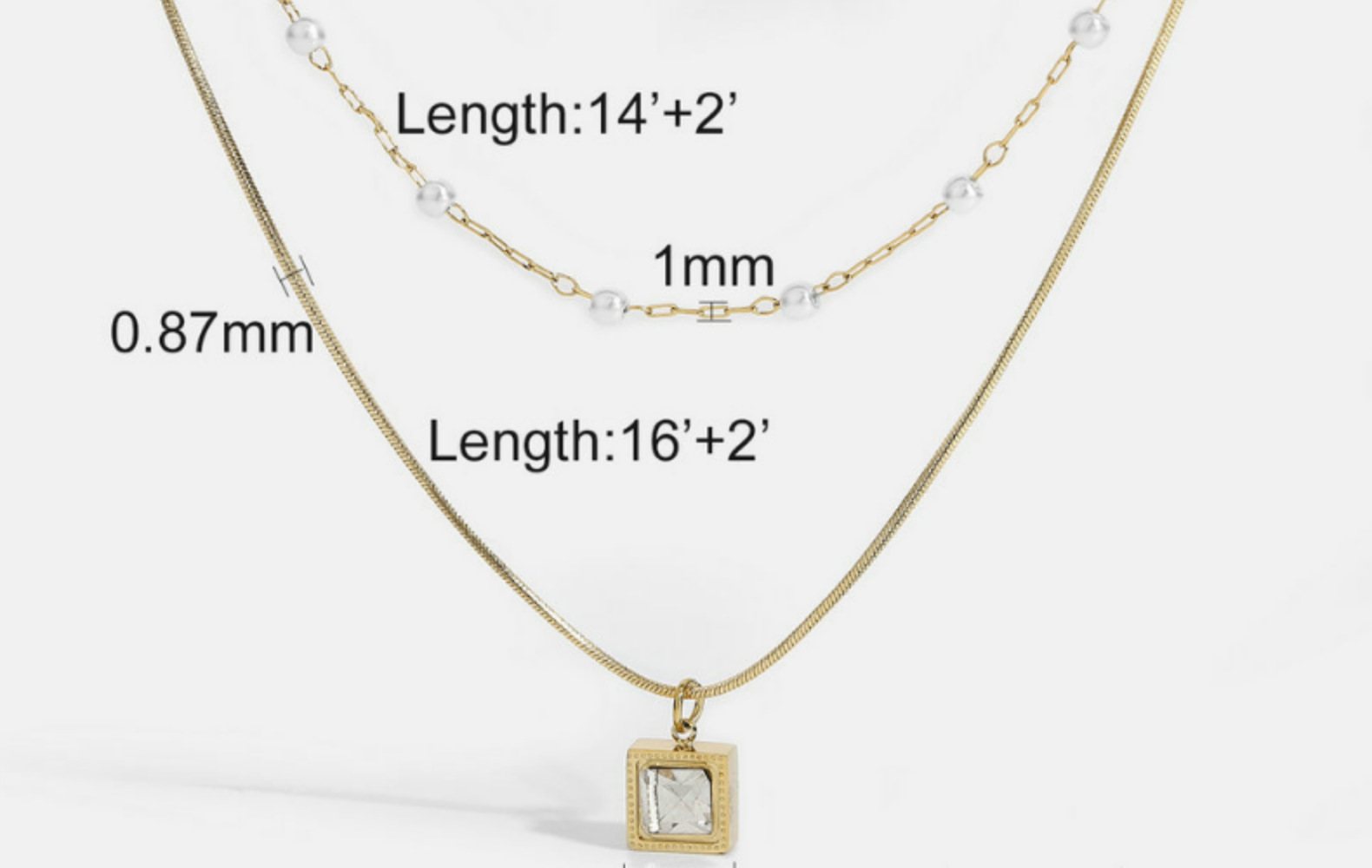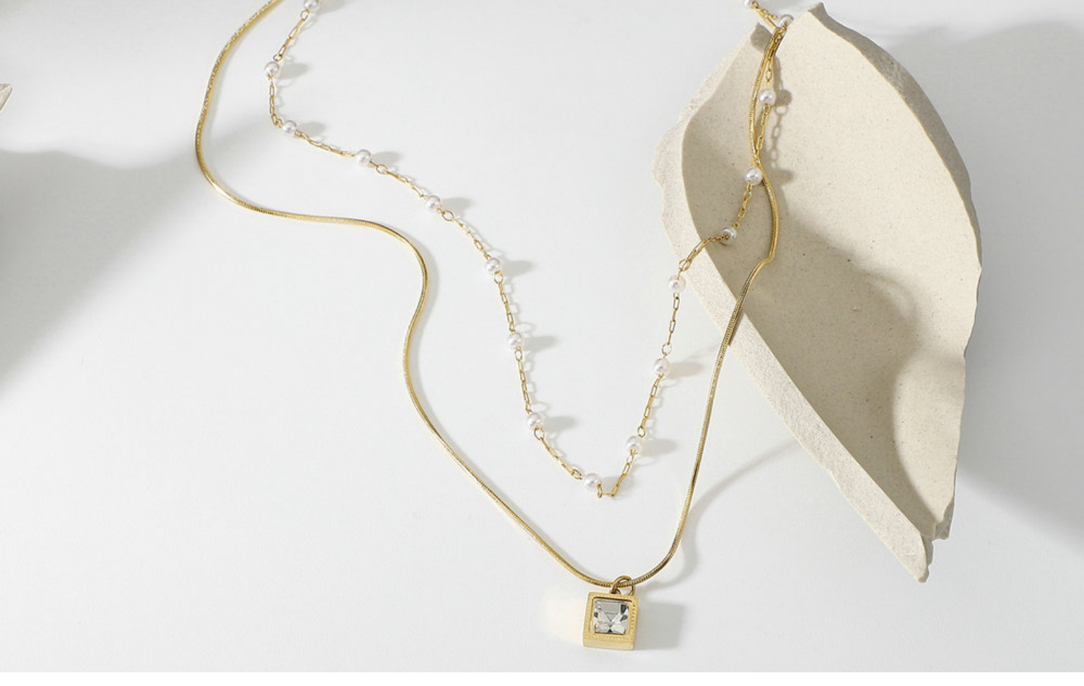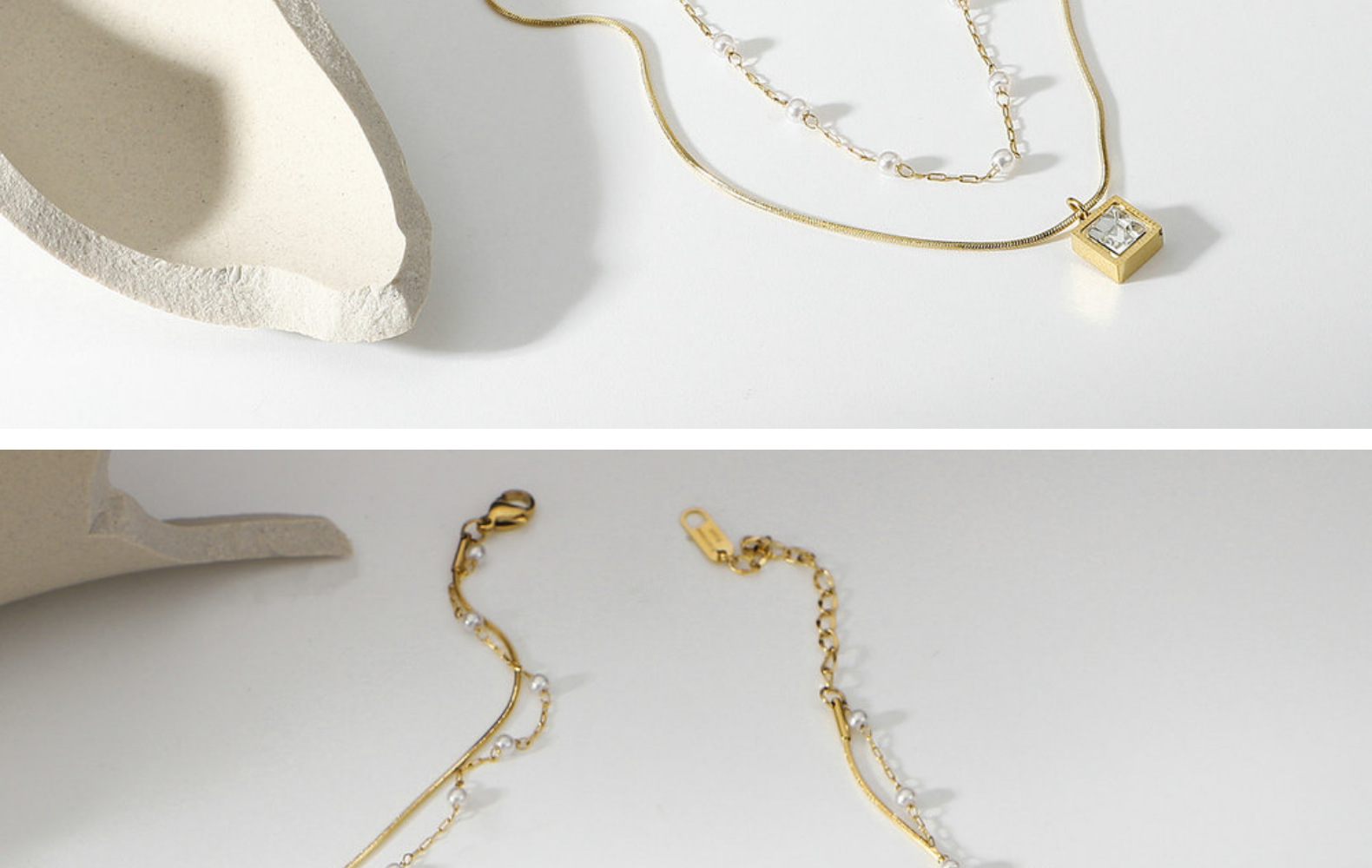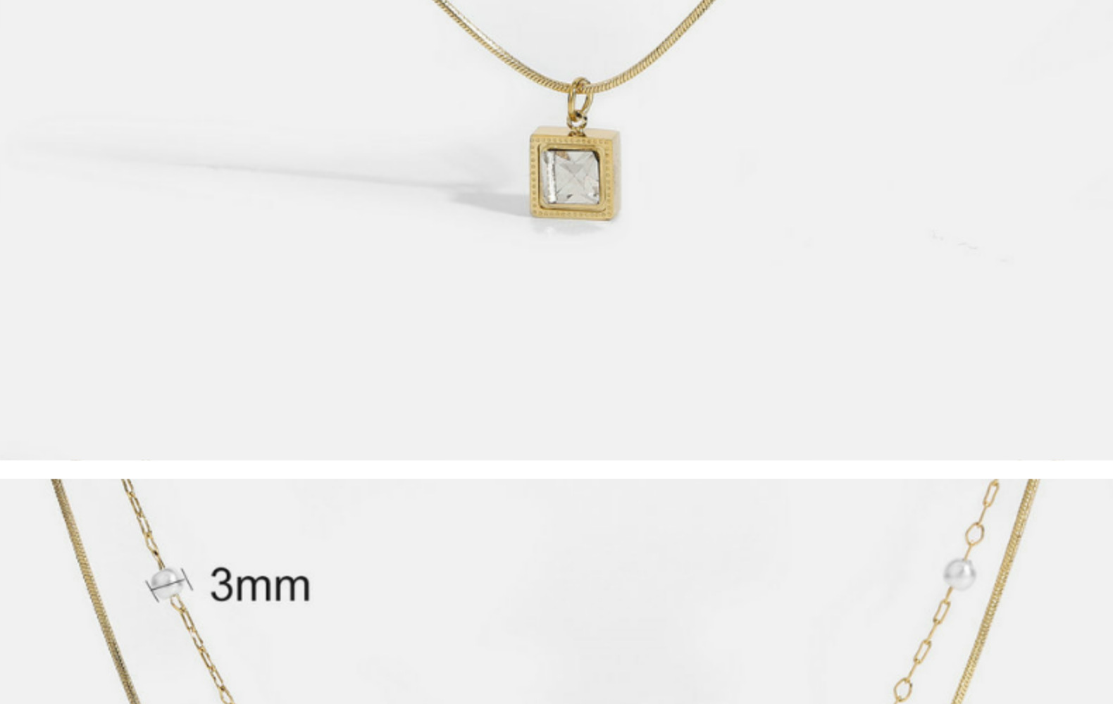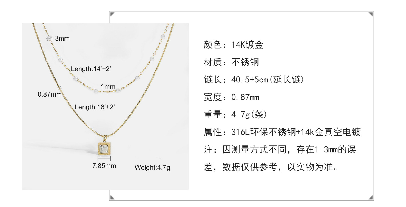 标题:欧美网红同款项链 14K金色方形锆石吊坠高层小珍珠精细项链饰品女