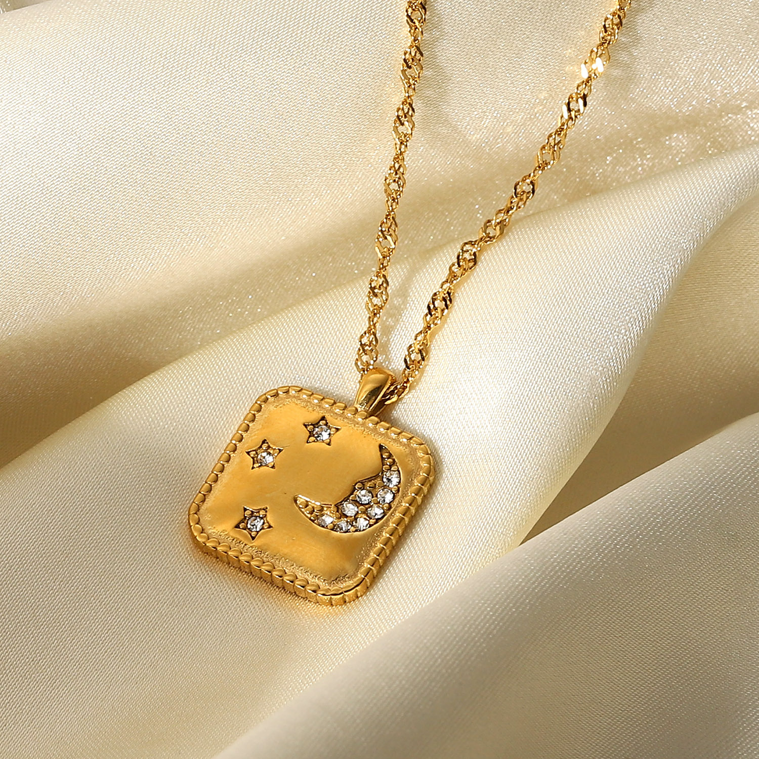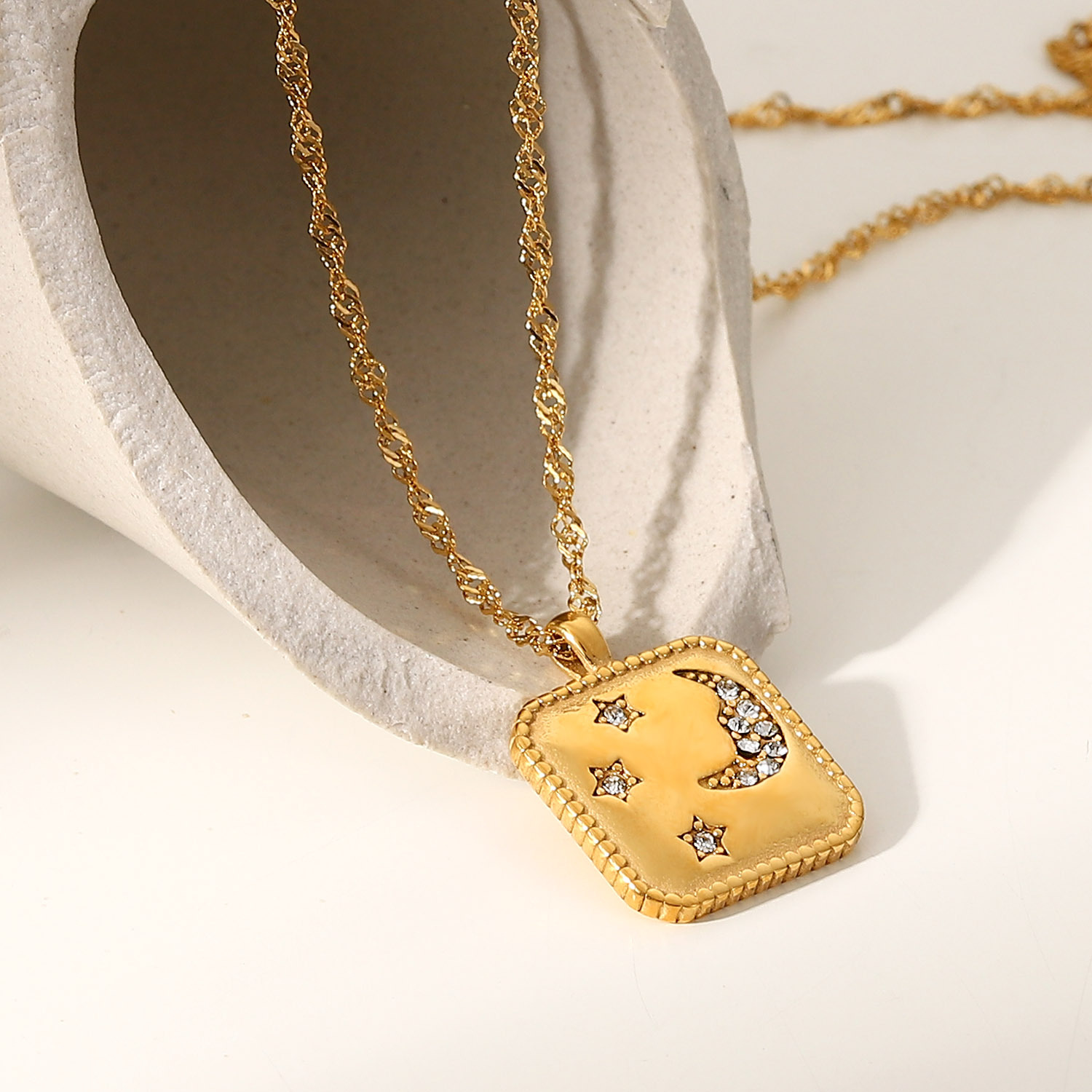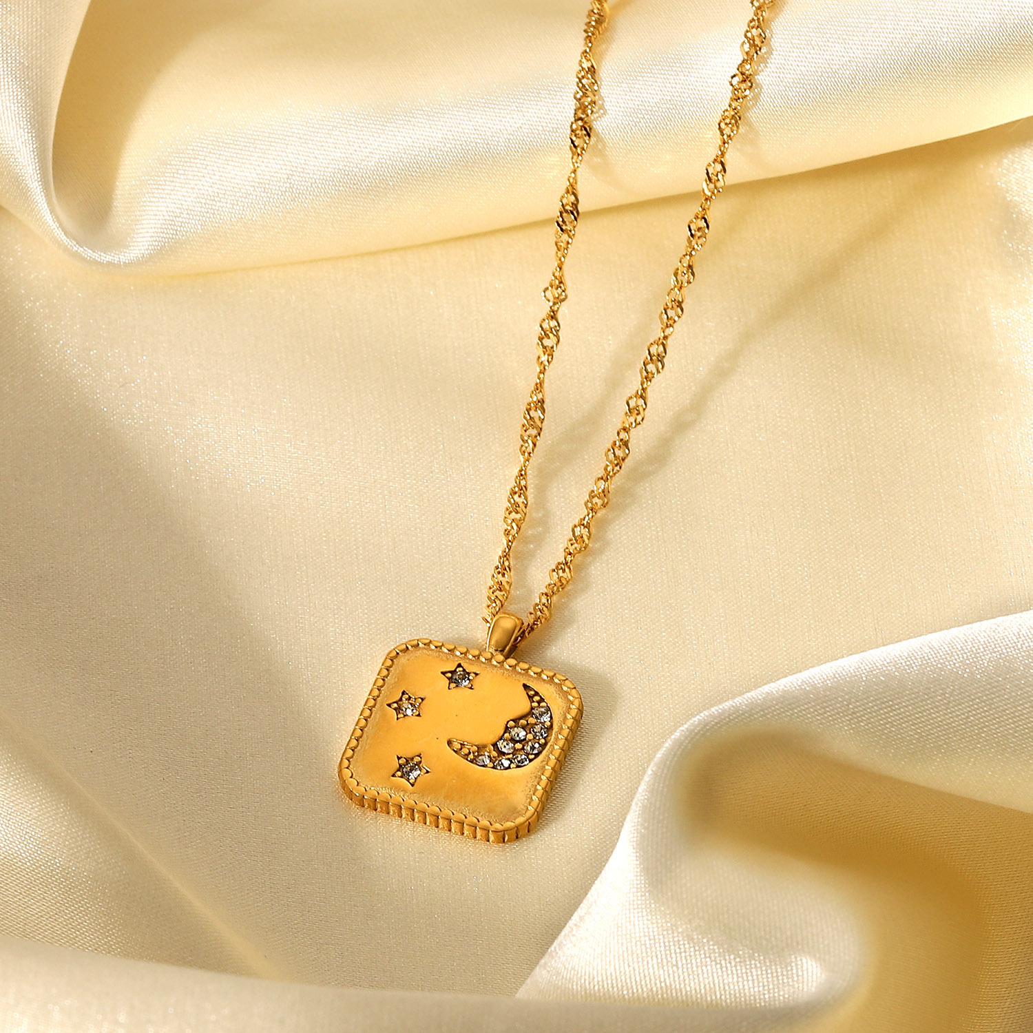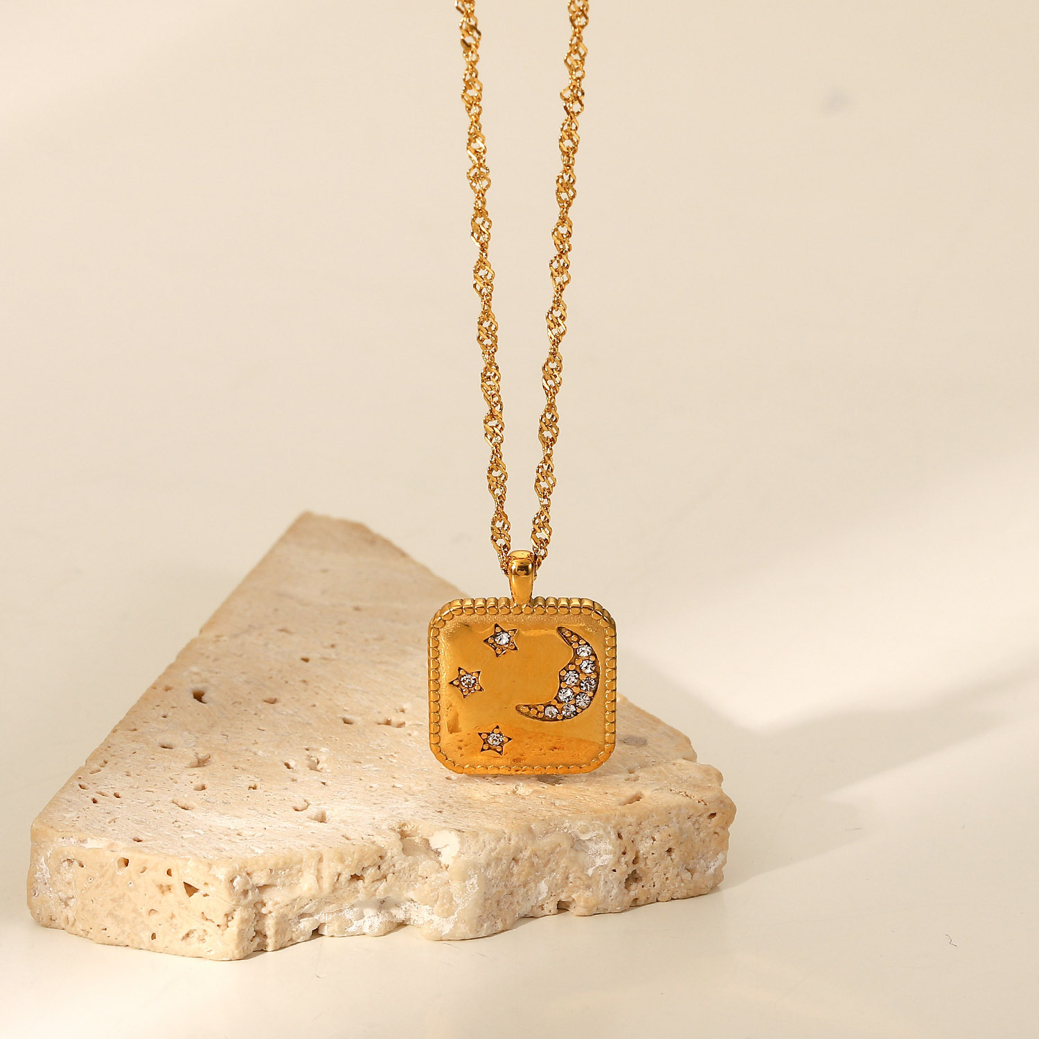 标题:欧美INS风新款不锈钢项链18K金方形吊牌镶锆星月吊坠项链饰品女式