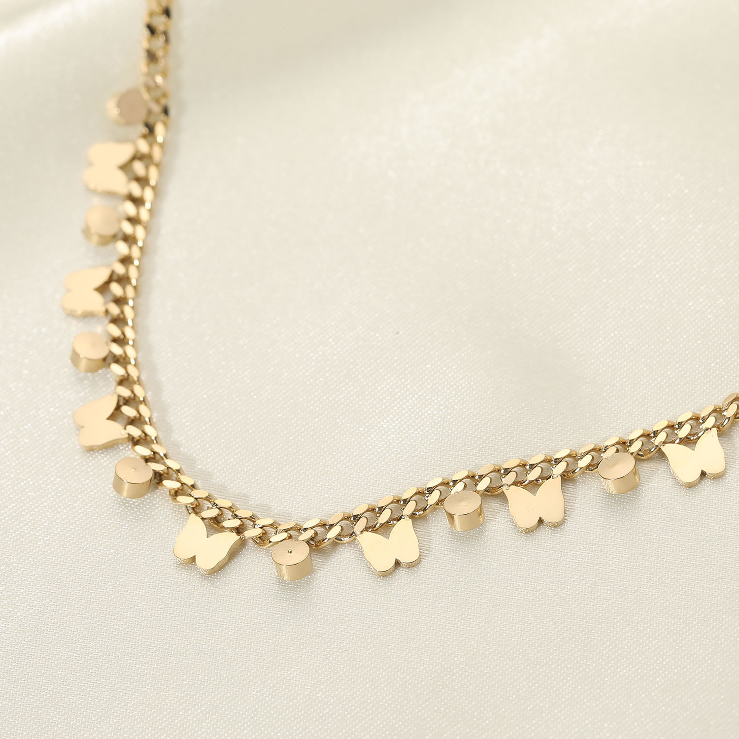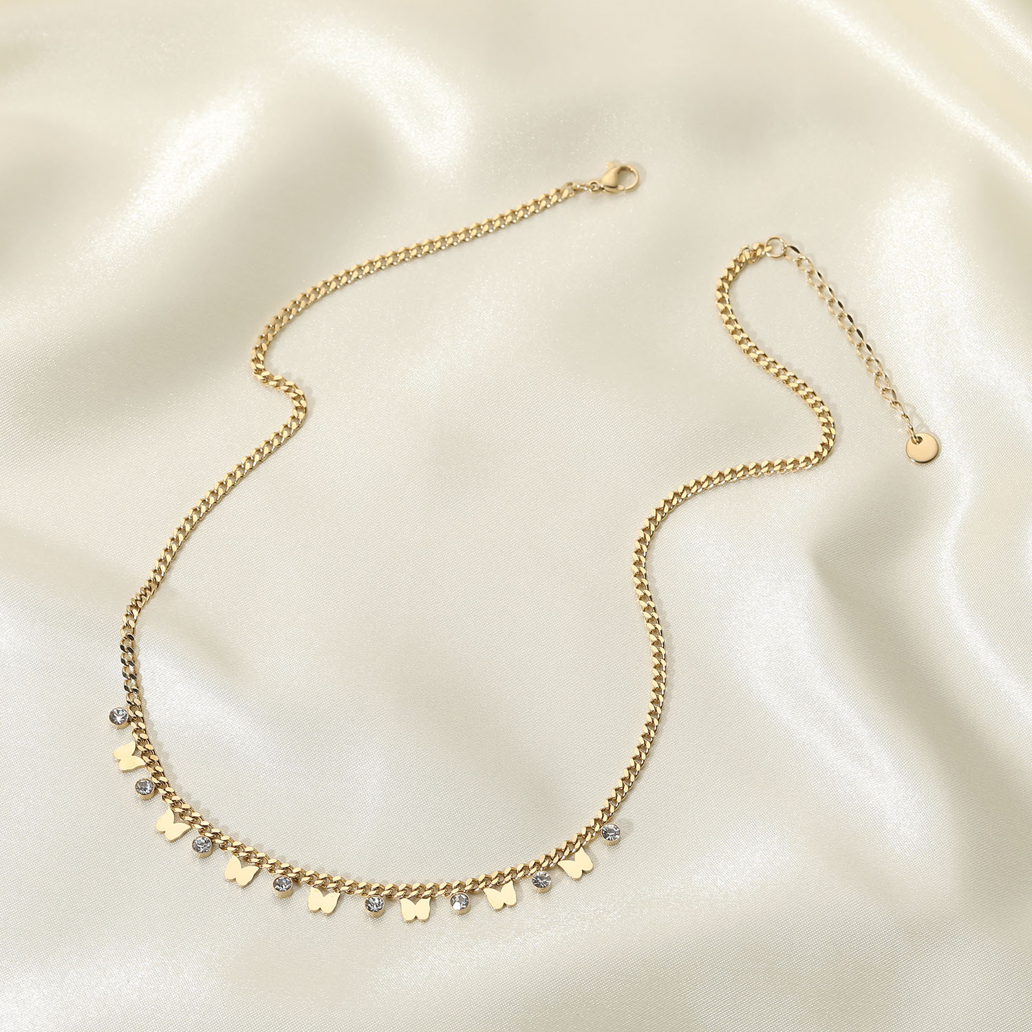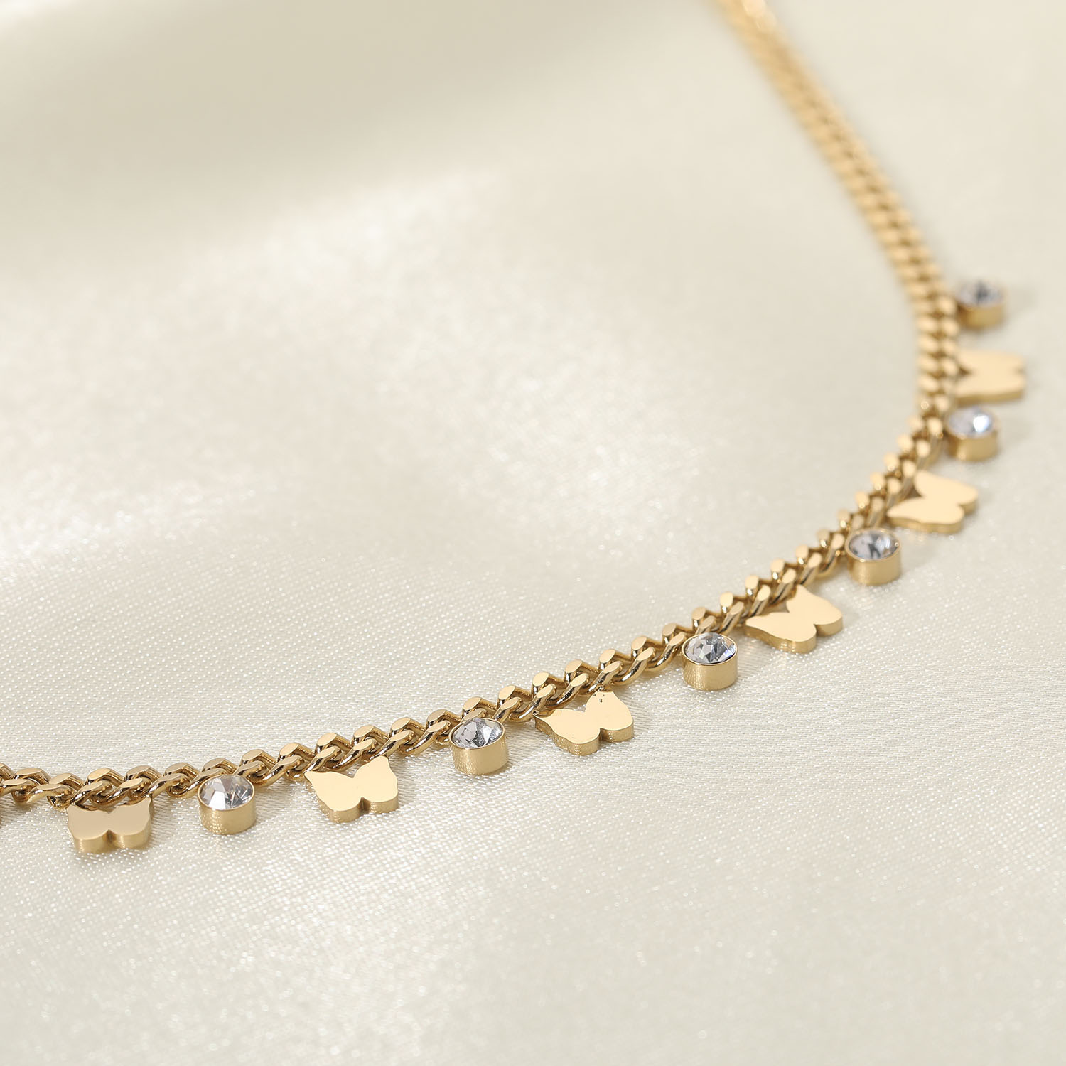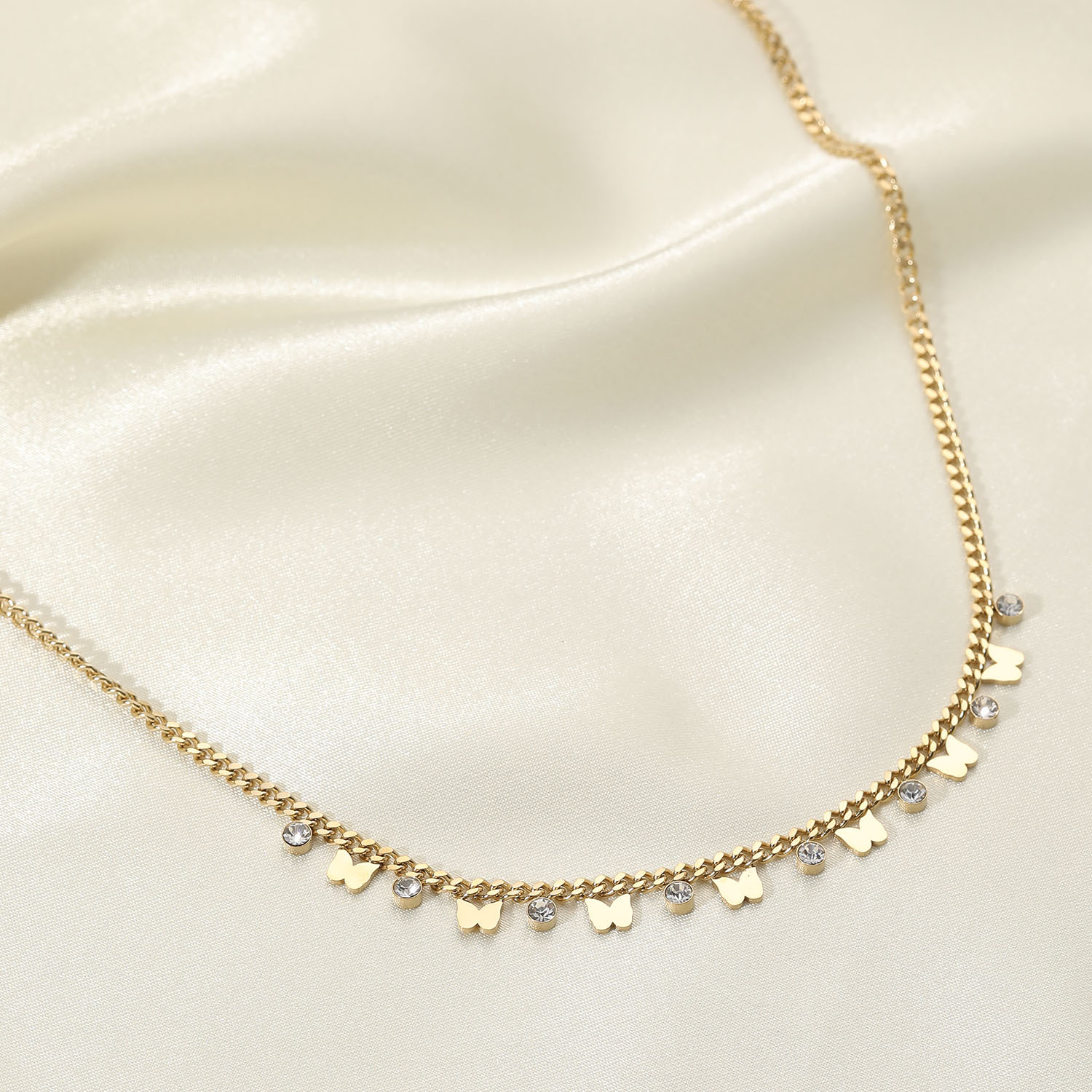 标题:欧美金属蝴蝶项链不锈钢14K金色小蝴蝶锆石相间流苏吊坠项链女士