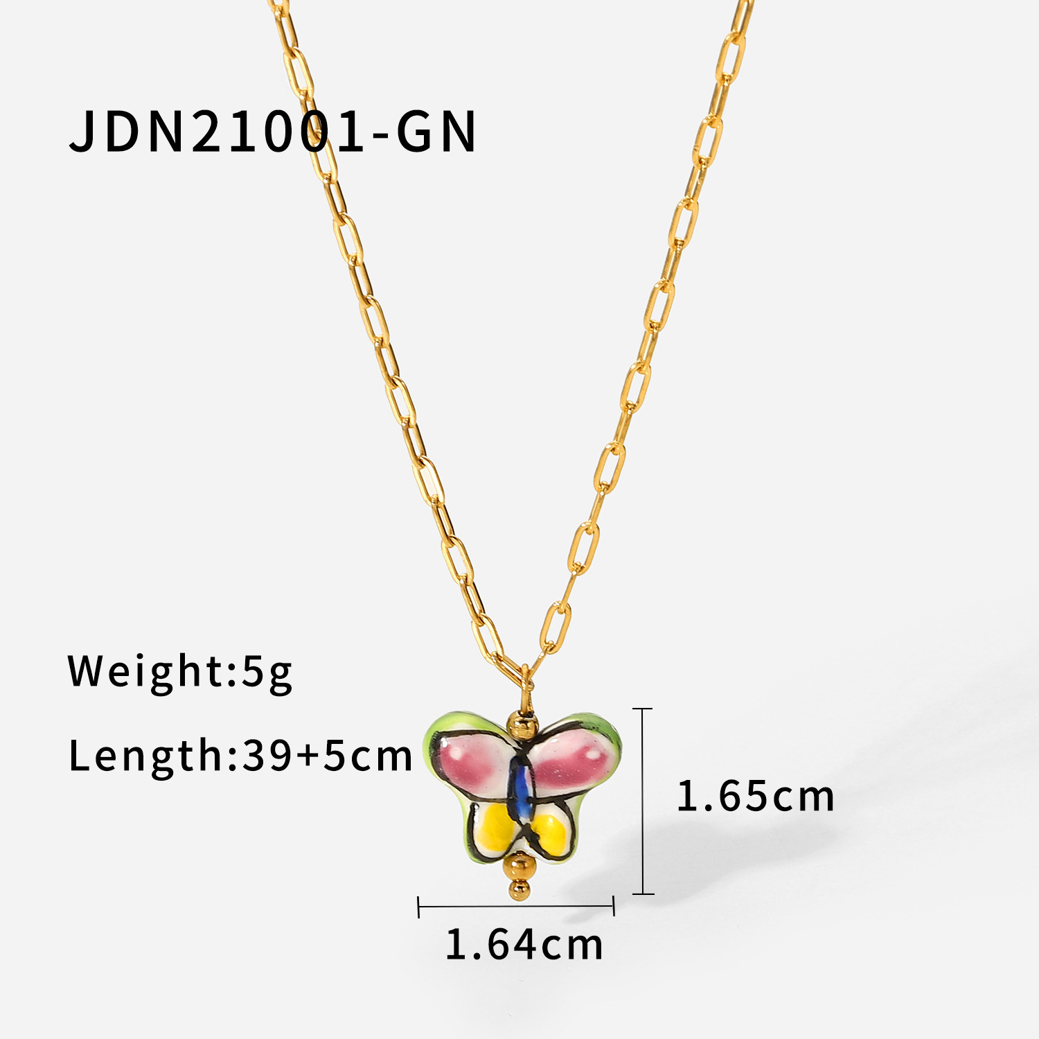 描述:风格:欧美,材质:不锈钢,处理工艺:电镀,品牌:Youthway,生产编号:JDN21001,销售序列号:JDN21001,种类:项坠、吊坠,样式:女式,造型:几何型,包装:独立包装,适用送礼场合:婚庆,旅游纪念,员工福利,加工定制:是,货号:JDN21001,产地:浙江义乌,链子样式:十字链,是否多层:是,是否带坠:是,延长链:10cm以下,坠子材质:钛钢,周长:21cm(含)-50cm(含),系列:不锈钢,形象:十字链项链,主要下游平台:淘宝,京东,ebay,PDD,亚马逊,wish,快手,LINIO,SHEIN,速卖通,天猫,独立站,LAZADA,拼多多,shopee,抖音,垂类电商,颜色:JDN21001-BE,JDN21001-GN,JDN21001-WT,主要销售地区:非洲,欧洲,南美,东南亚,北美,东北亚,中东,有可授权的自有品牌:是,是否跨境出口专供货源:是,流行元素:金属,复古,蝴蝶,链条,几何,上市年份/季节:2022年春季,