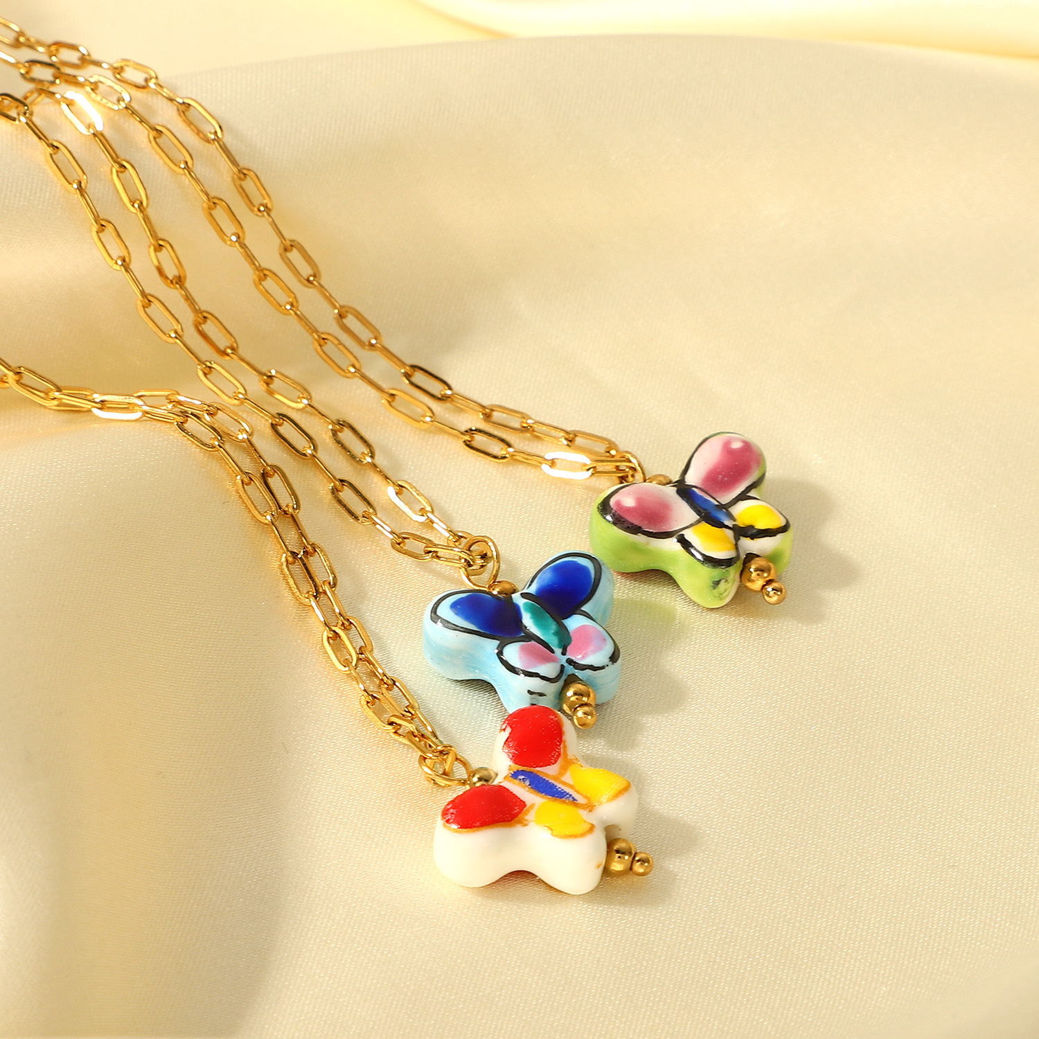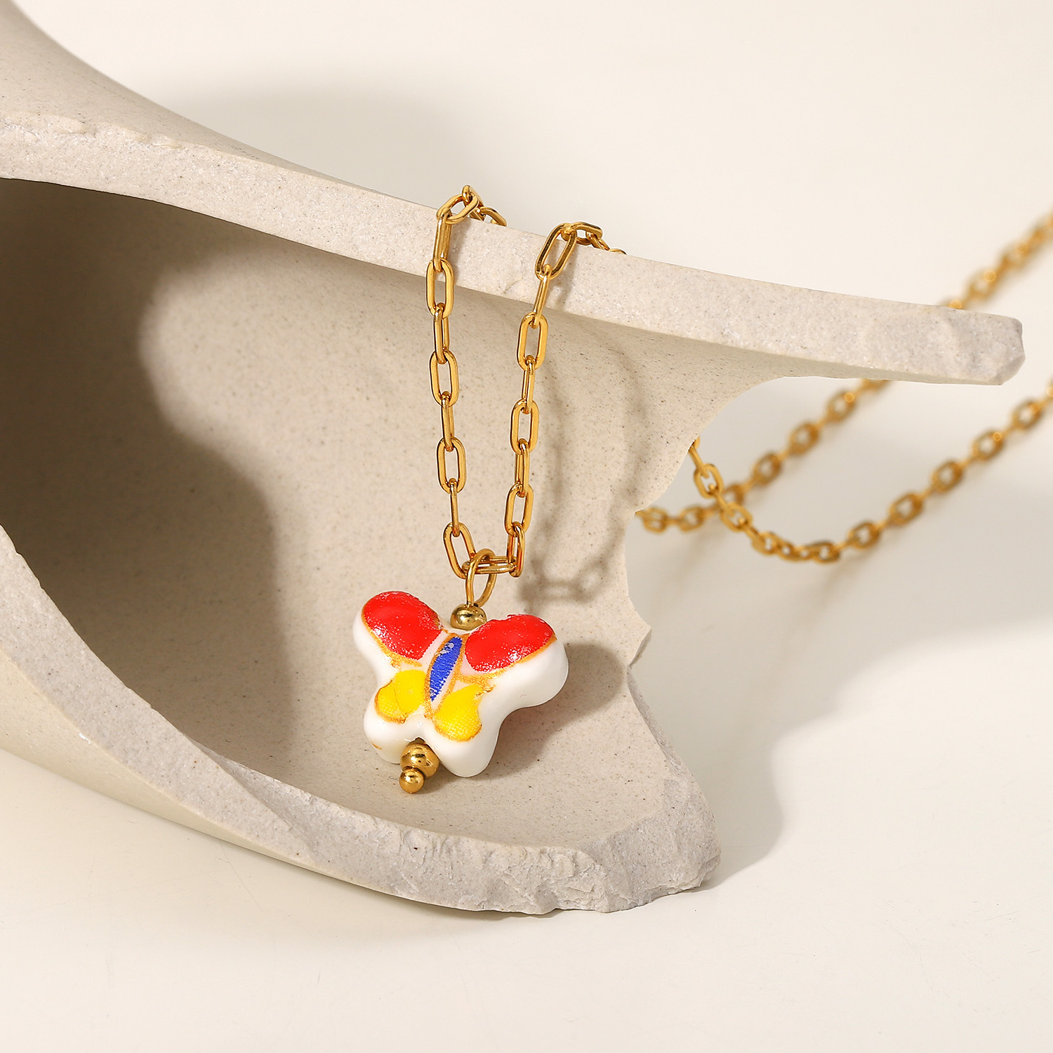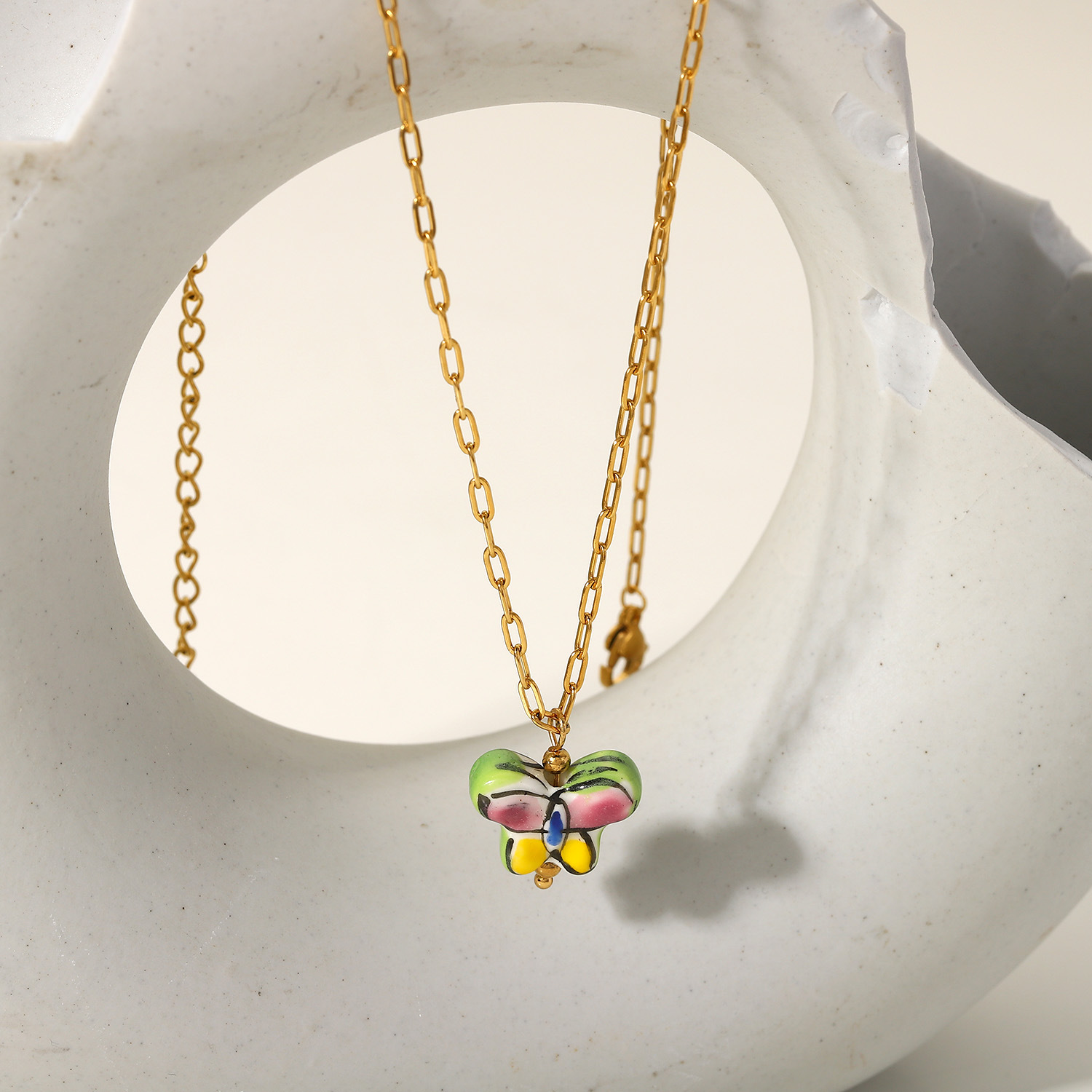 标题:法式复古时尚INS风花蝴蝶陶瓷吊坠项饰18K金不锈钢十字链项链女士