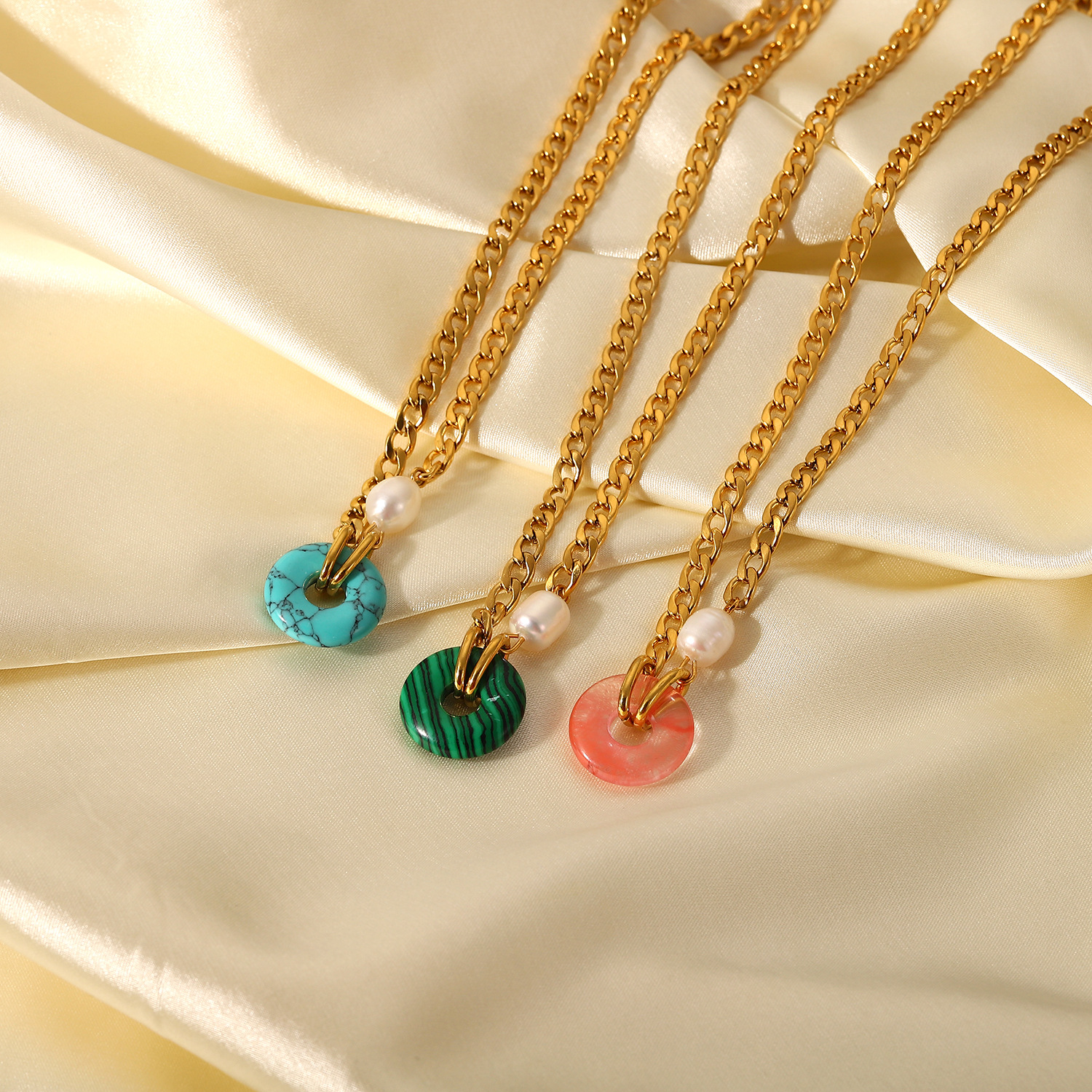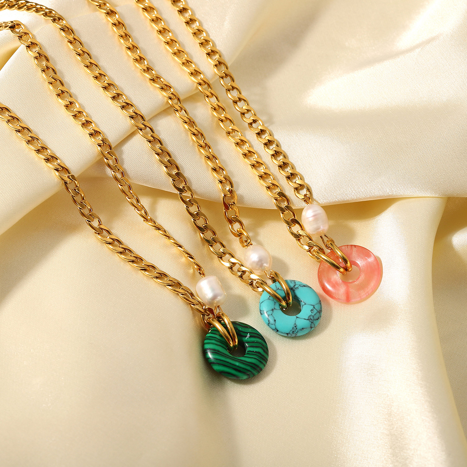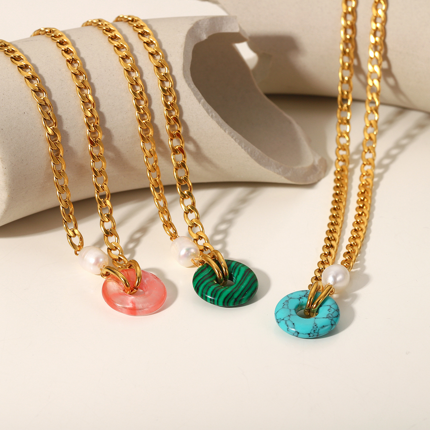 标题:欧美新款时尚个性INS风天然石圆环吊坠项链女式18K金不锈钢古巴链