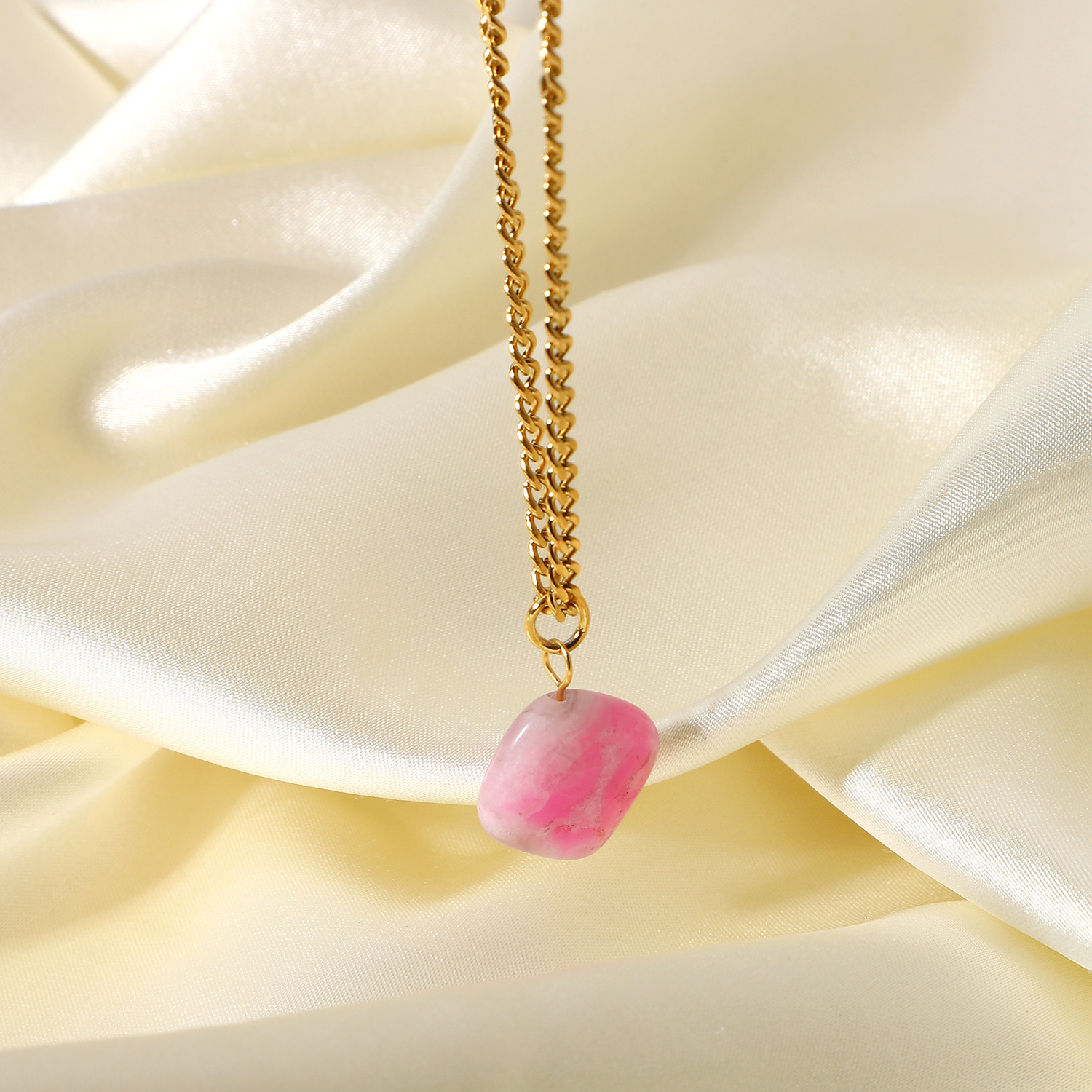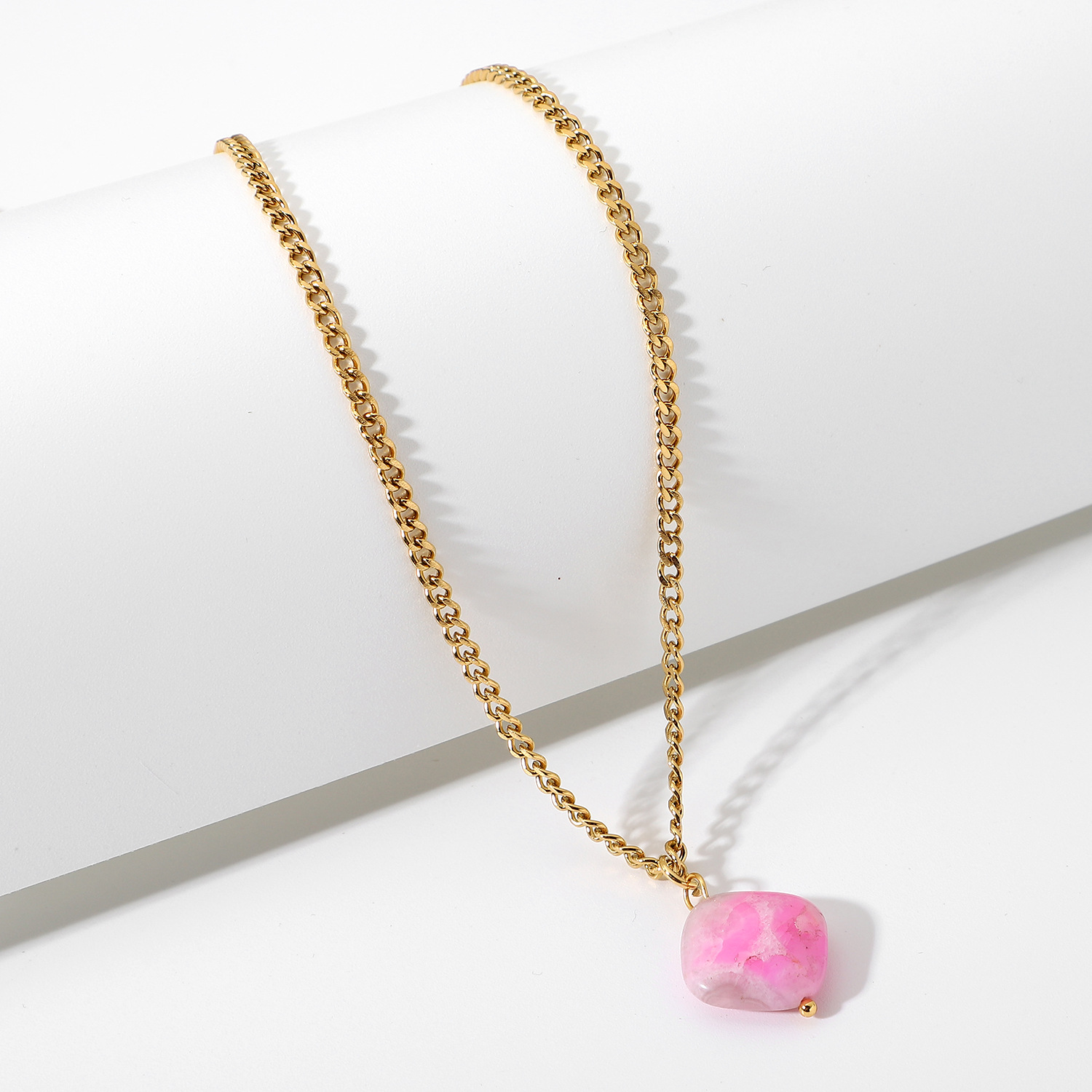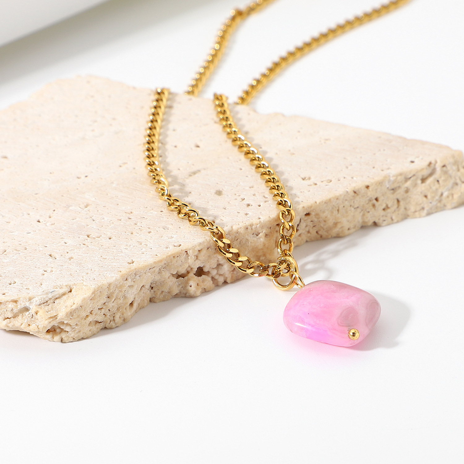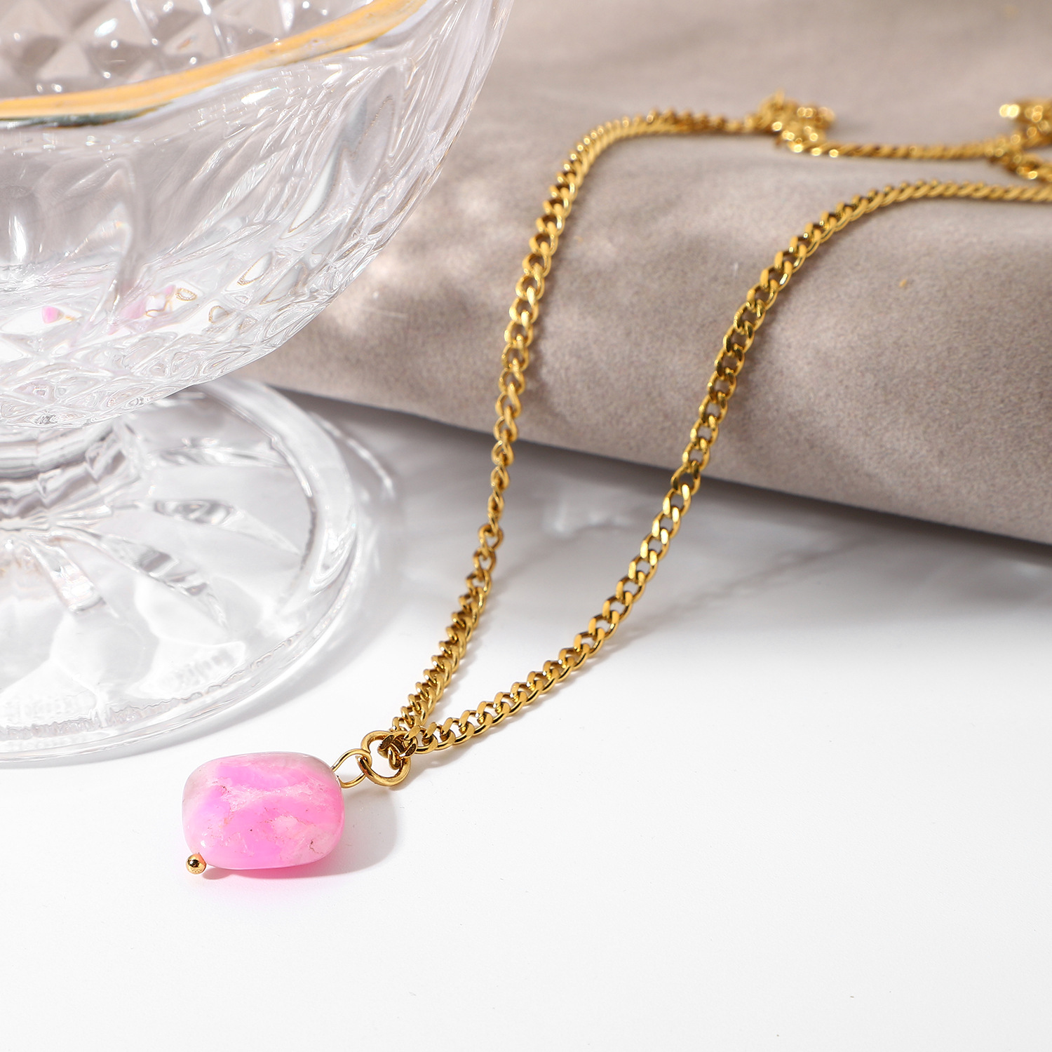 标题:欧美INS风18K镀金不锈钢粉红色天然石项链女式古巴链叠层项链饰品