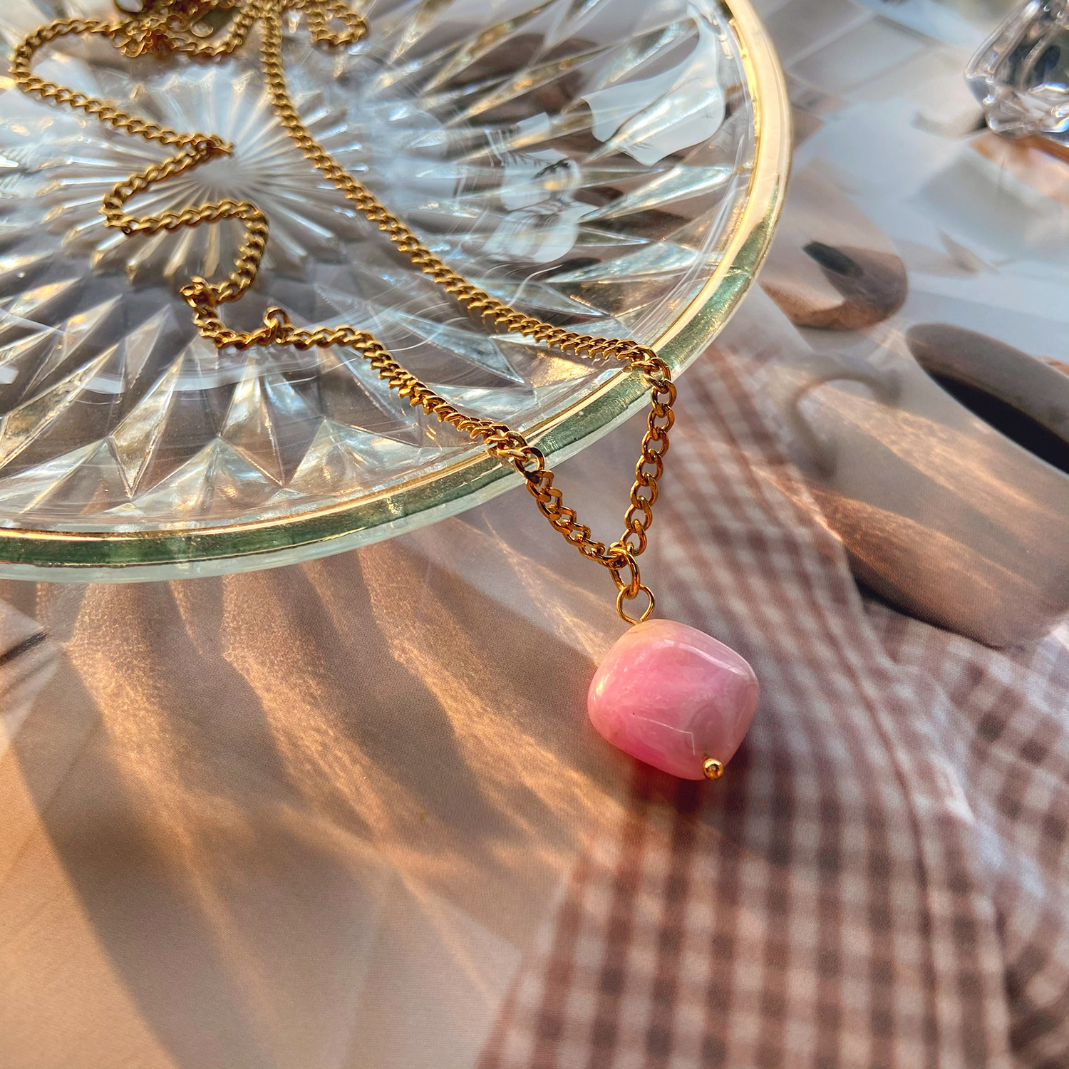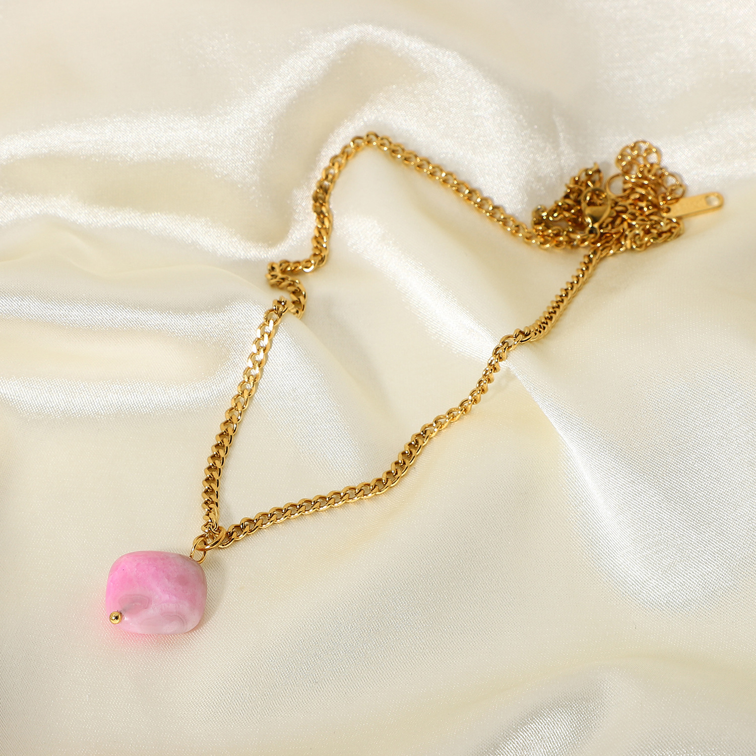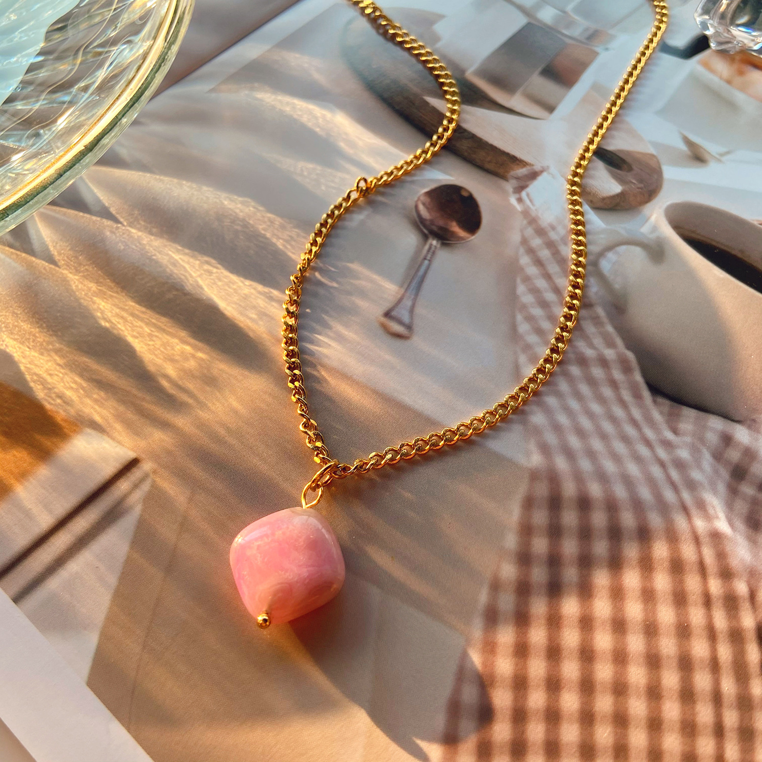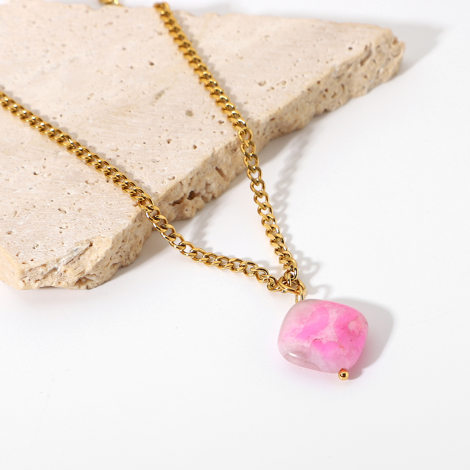 标题:欧美INS风18K镀金不锈钢粉红色天然石项链女式古巴链叠层项链饰品