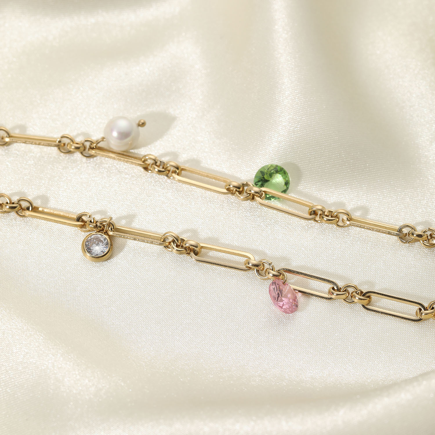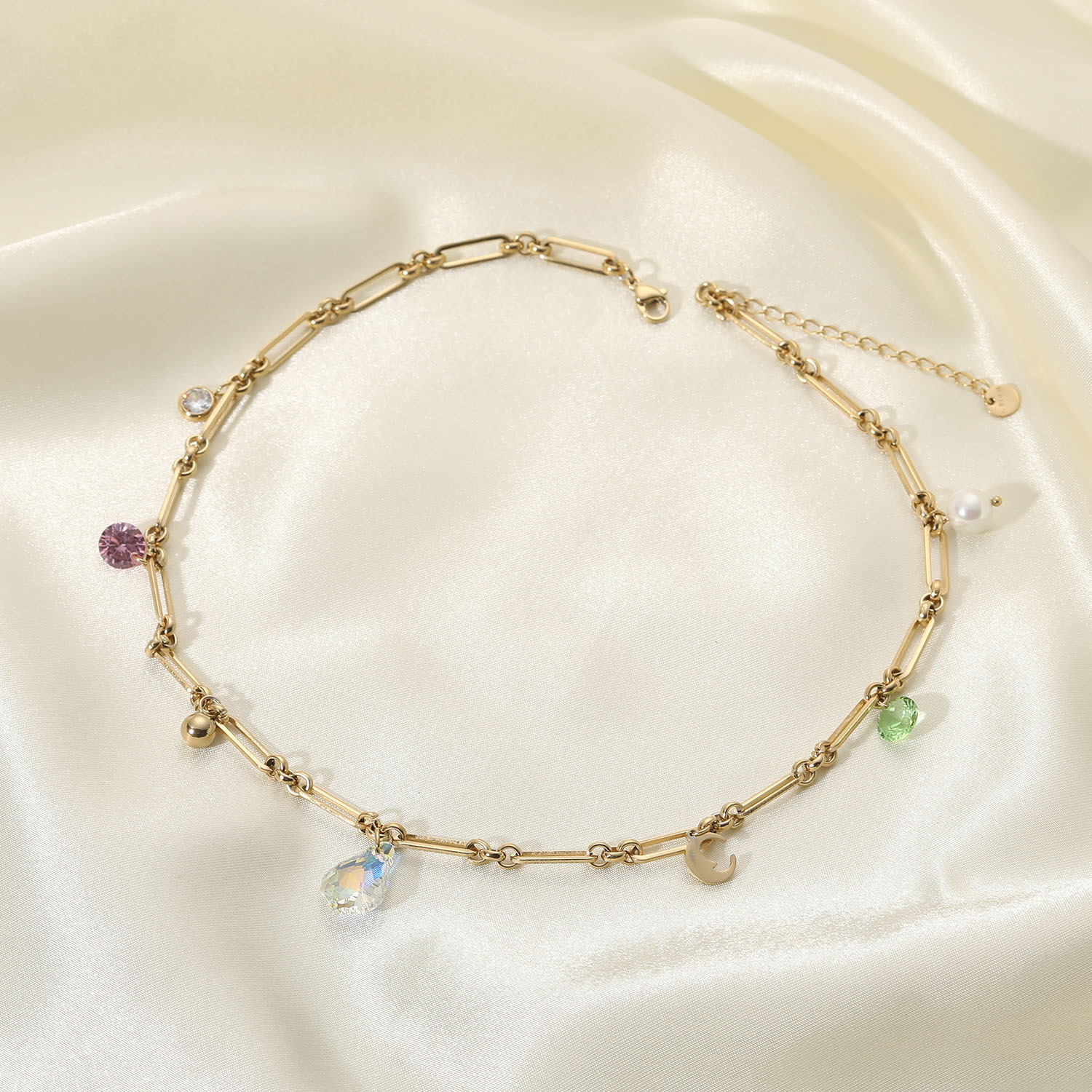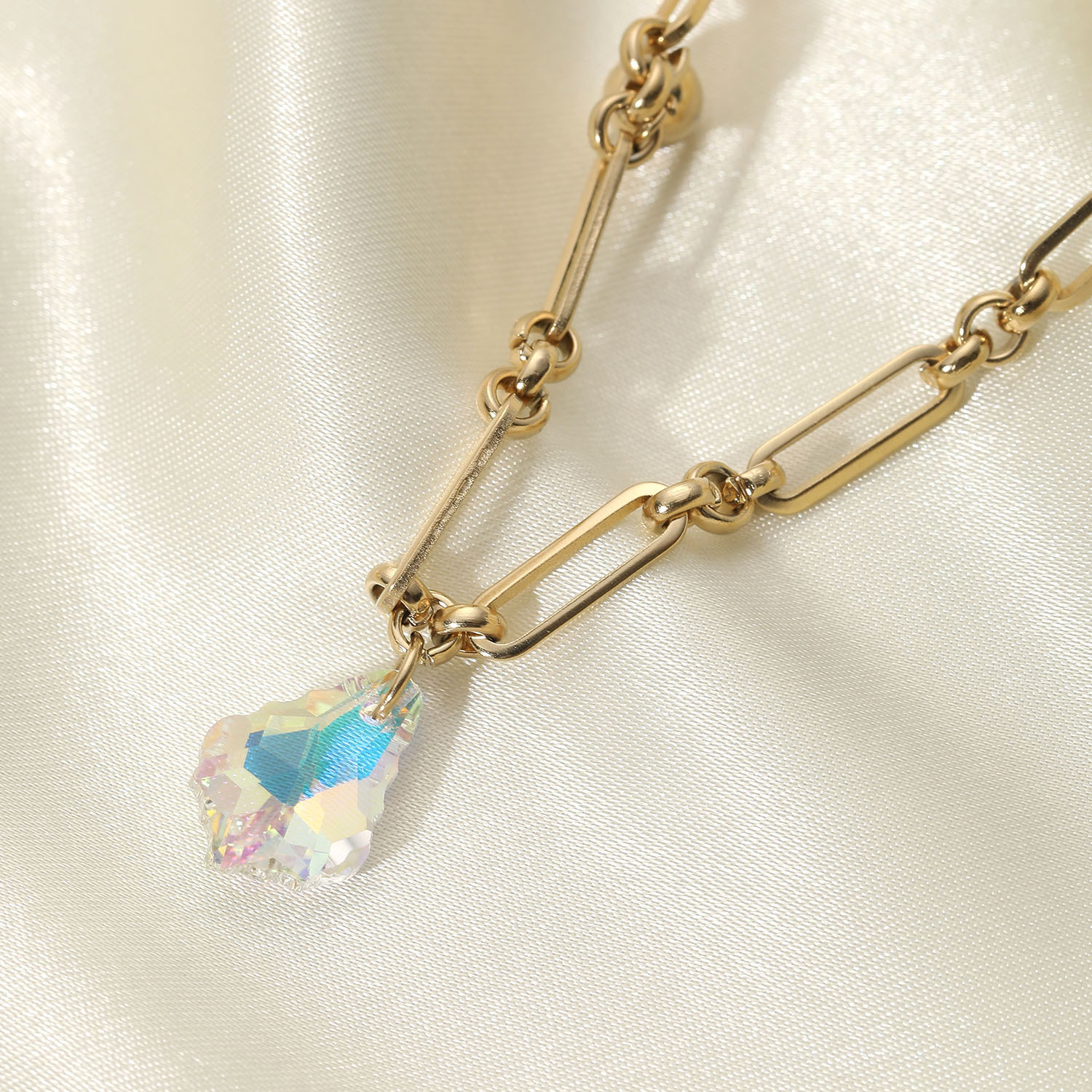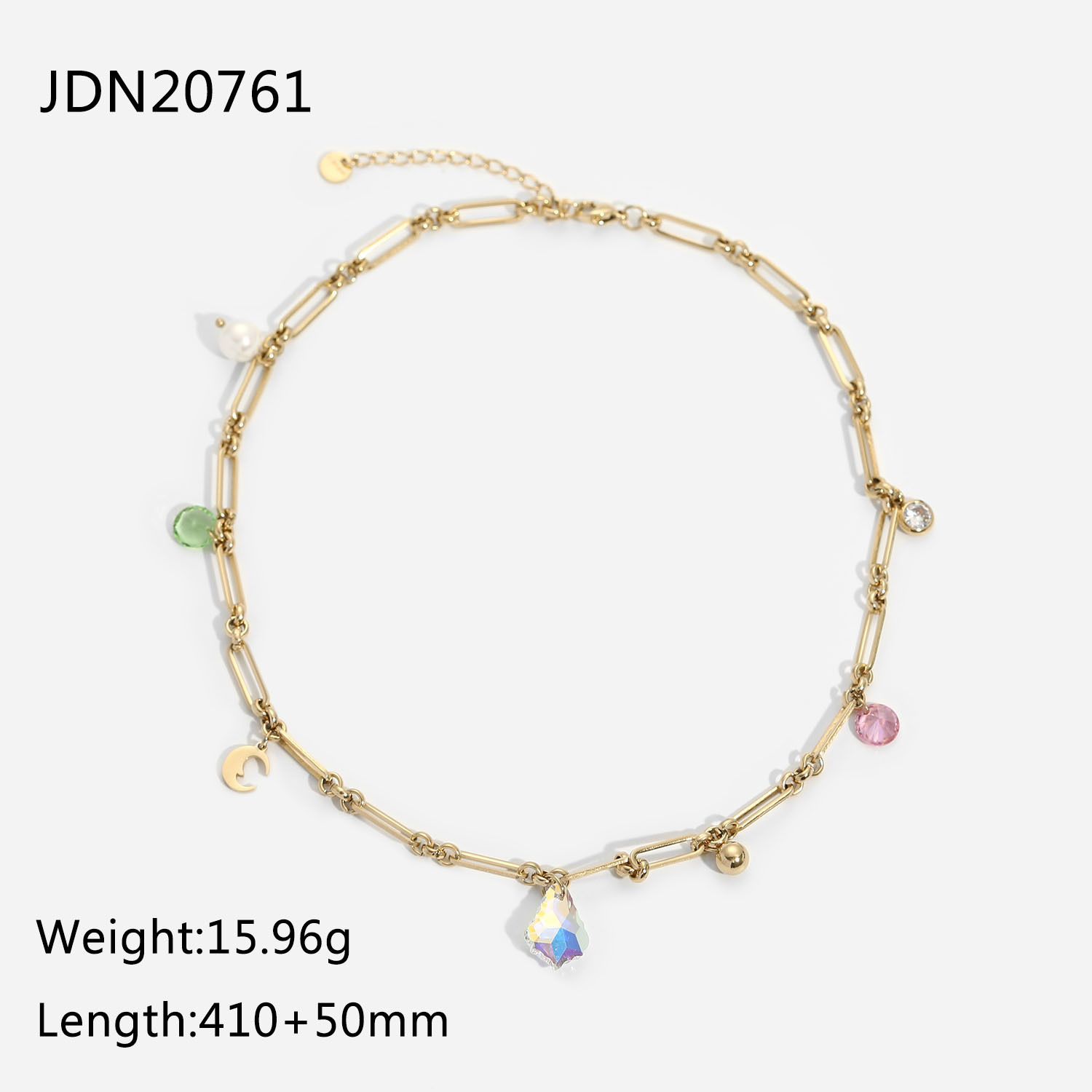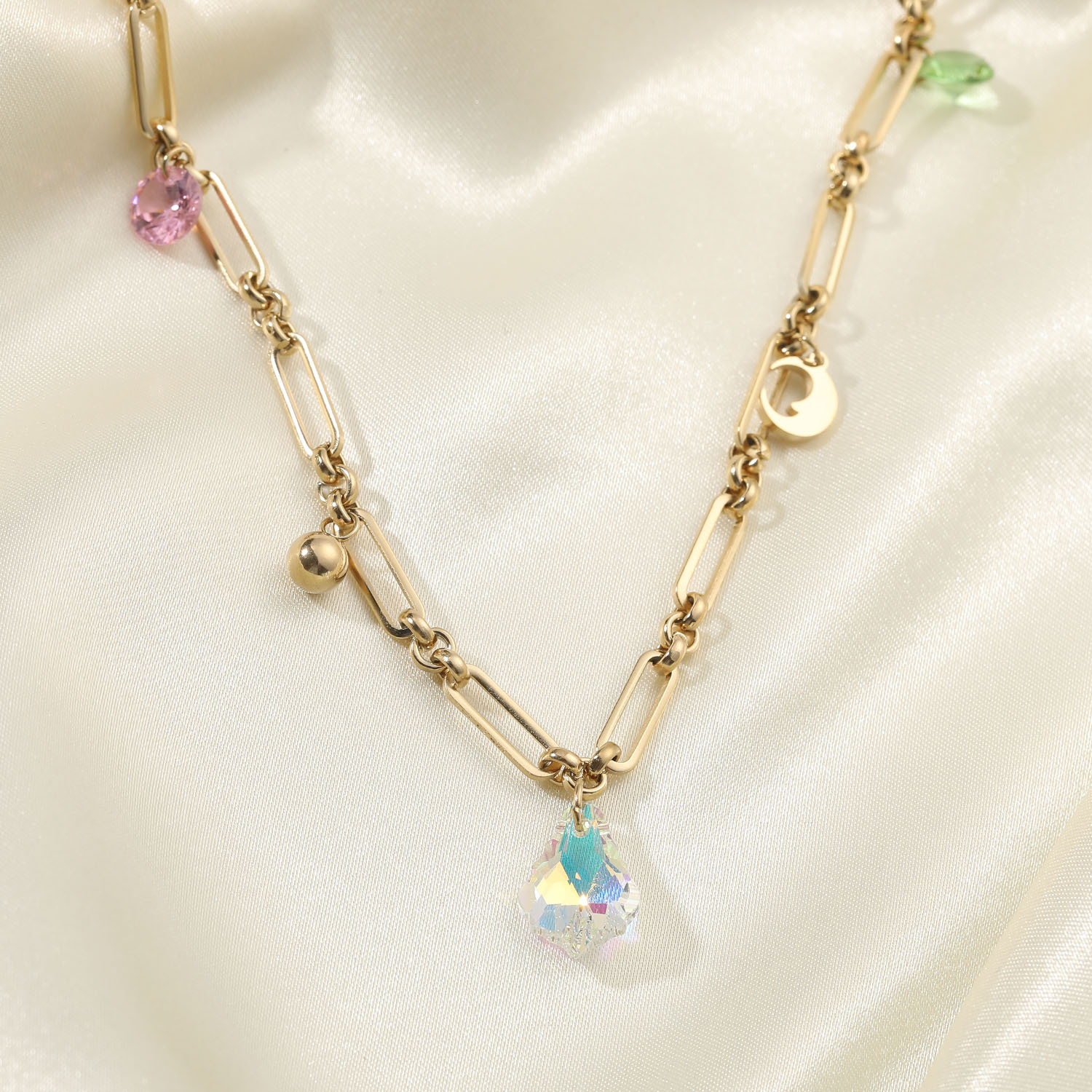 标题:欧美INS同款14K金色镂空长链条彩色锆石吊坠幻彩水滴形玻璃项链女