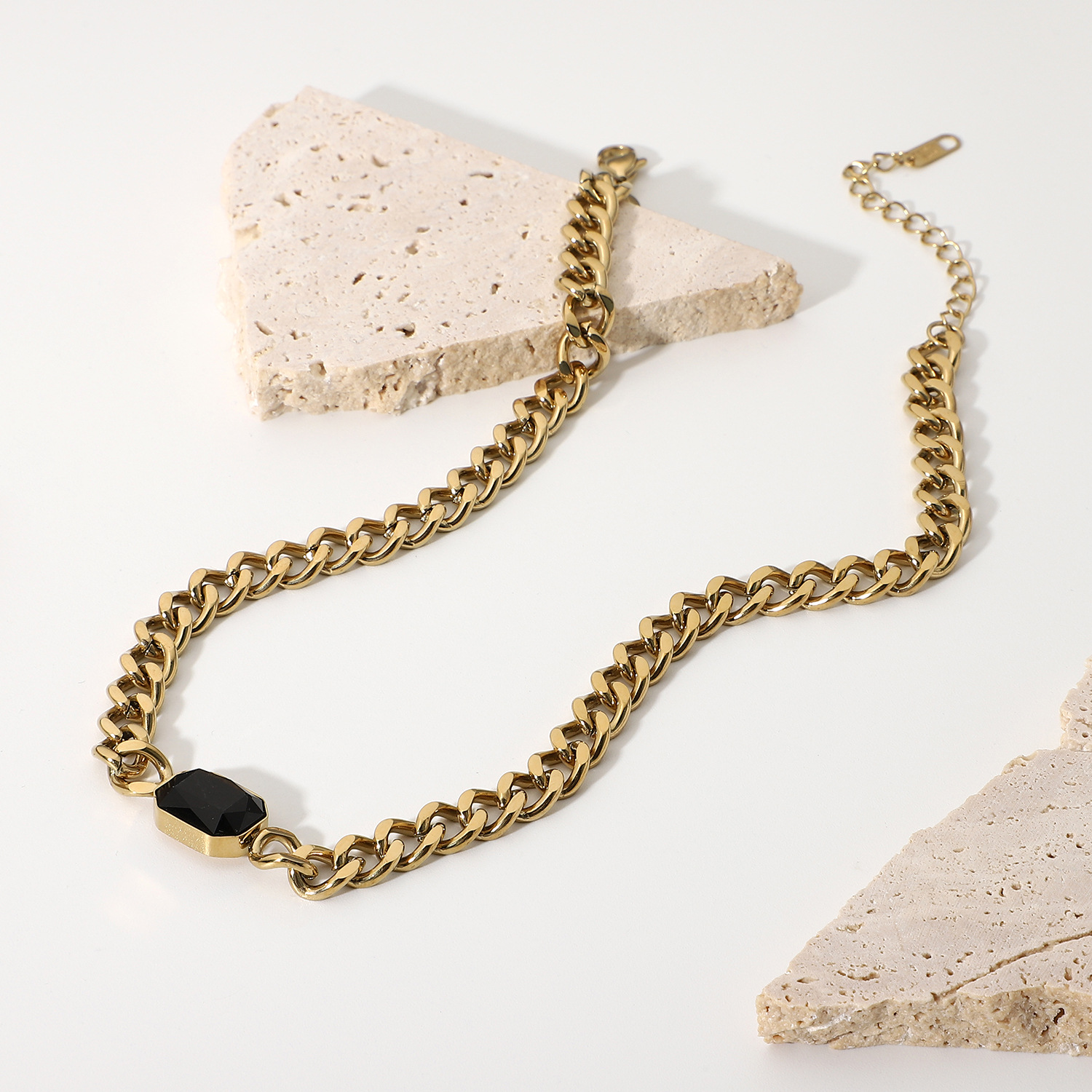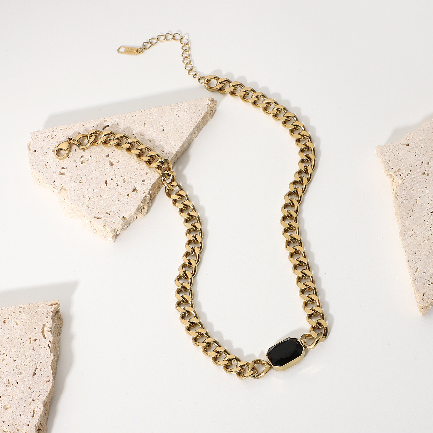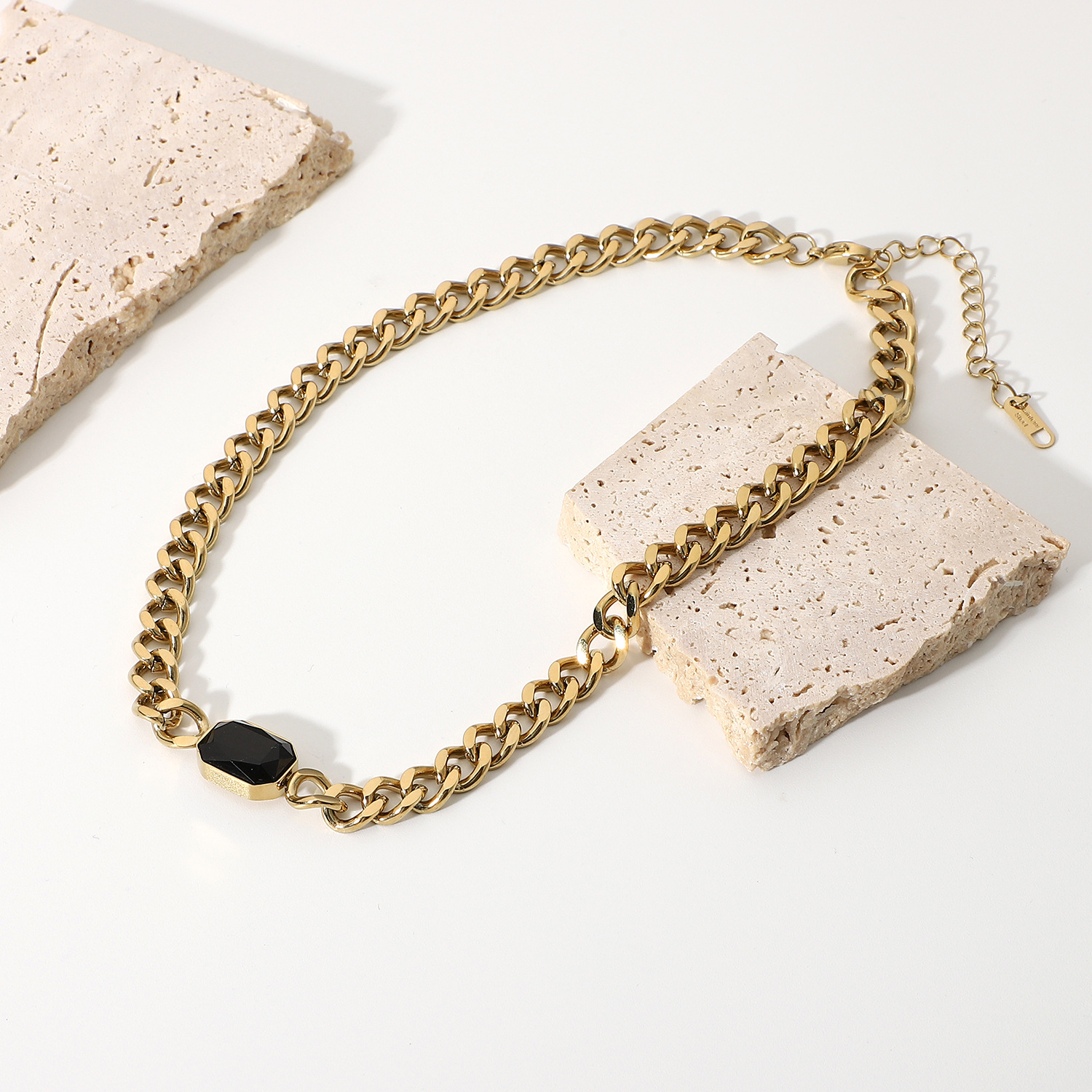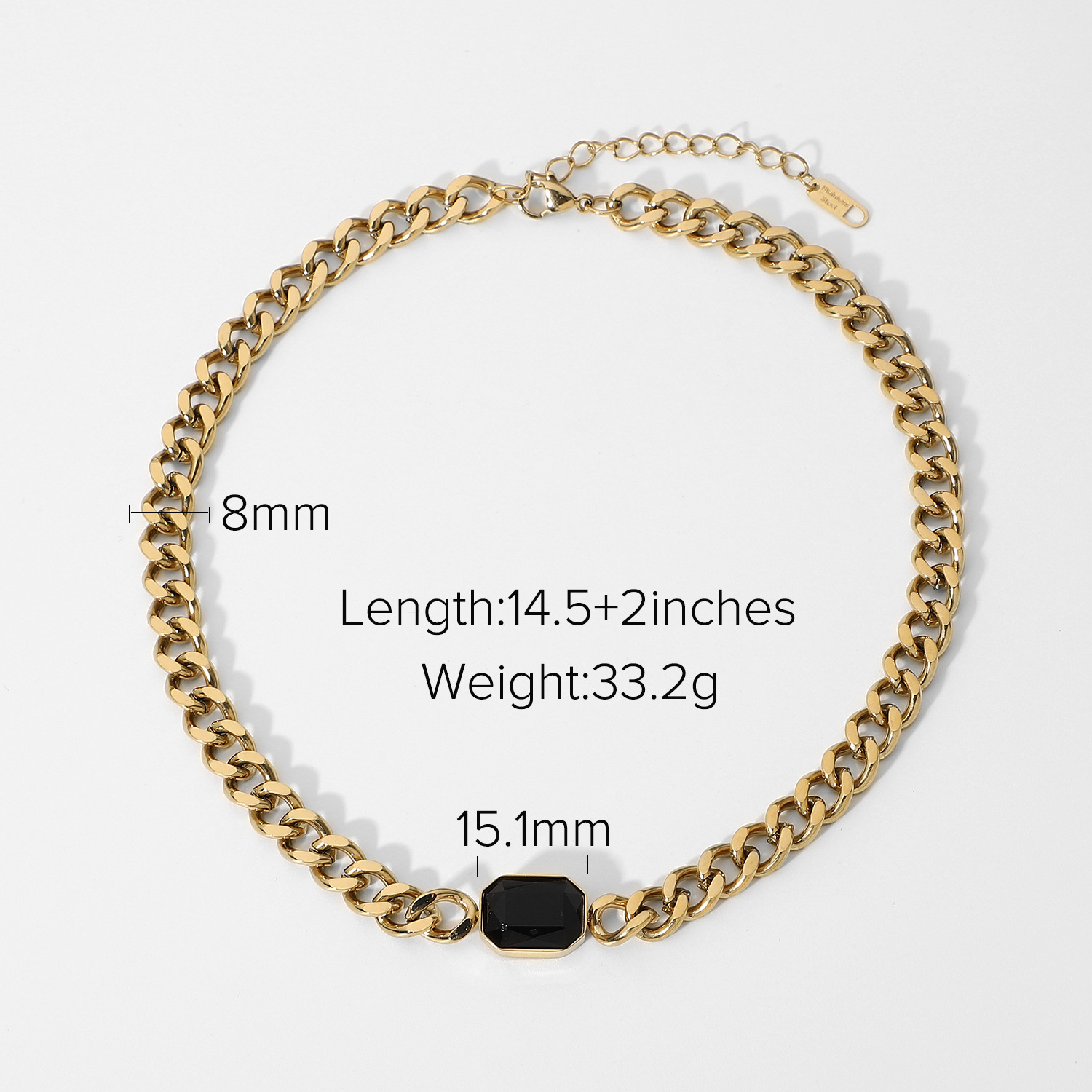 标题:欧美INS同款嘻哈潮男女款钛钢古巴项链14K金色古链条黑色石头项链