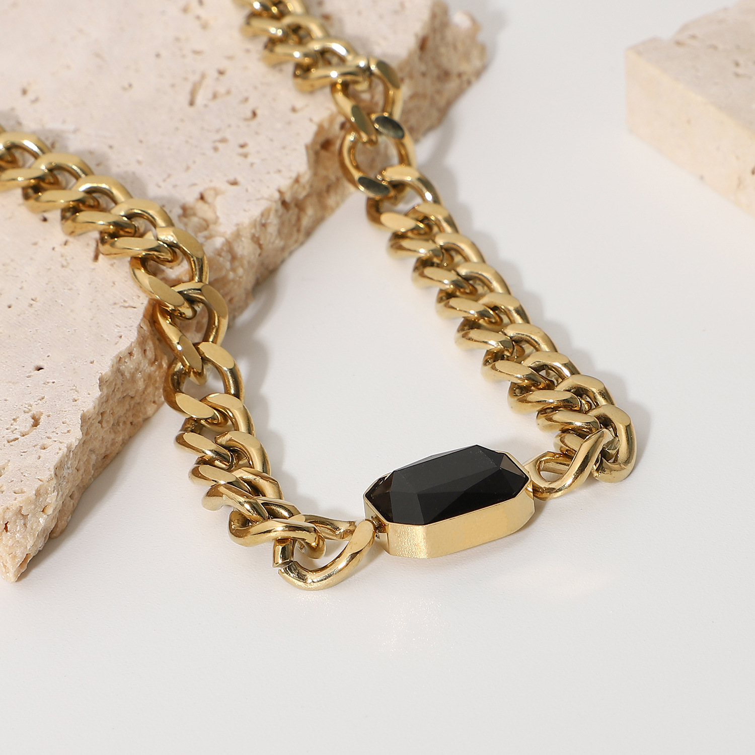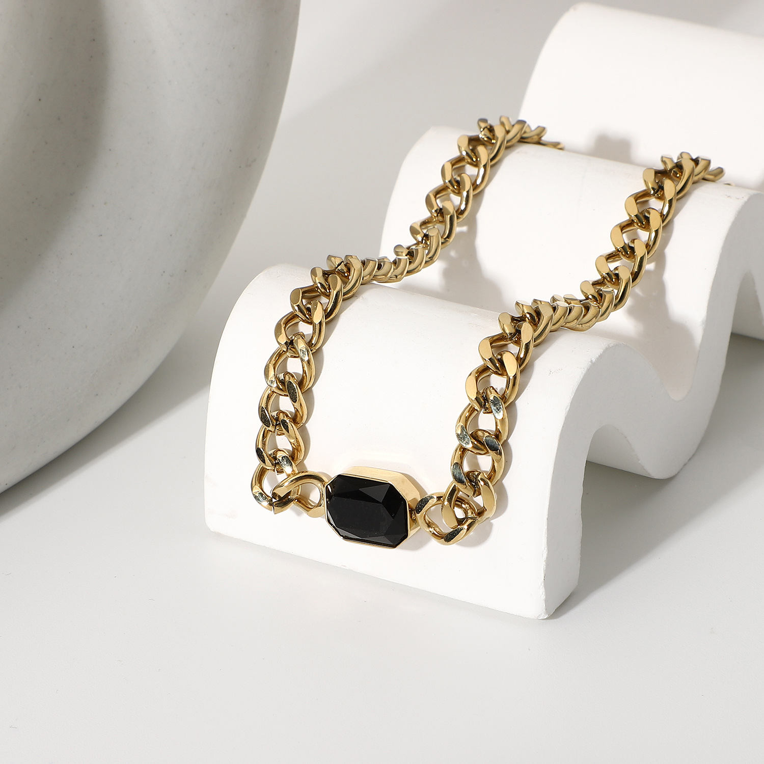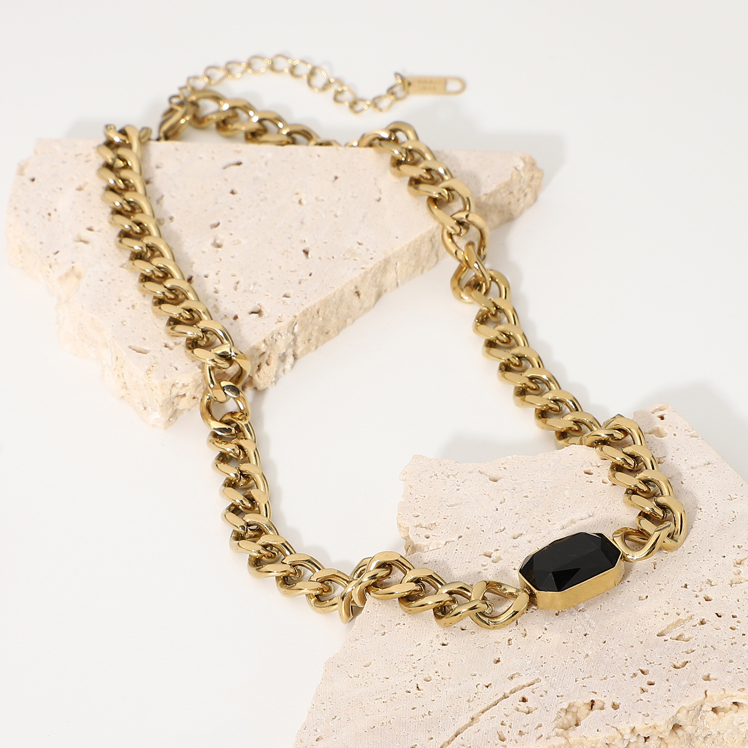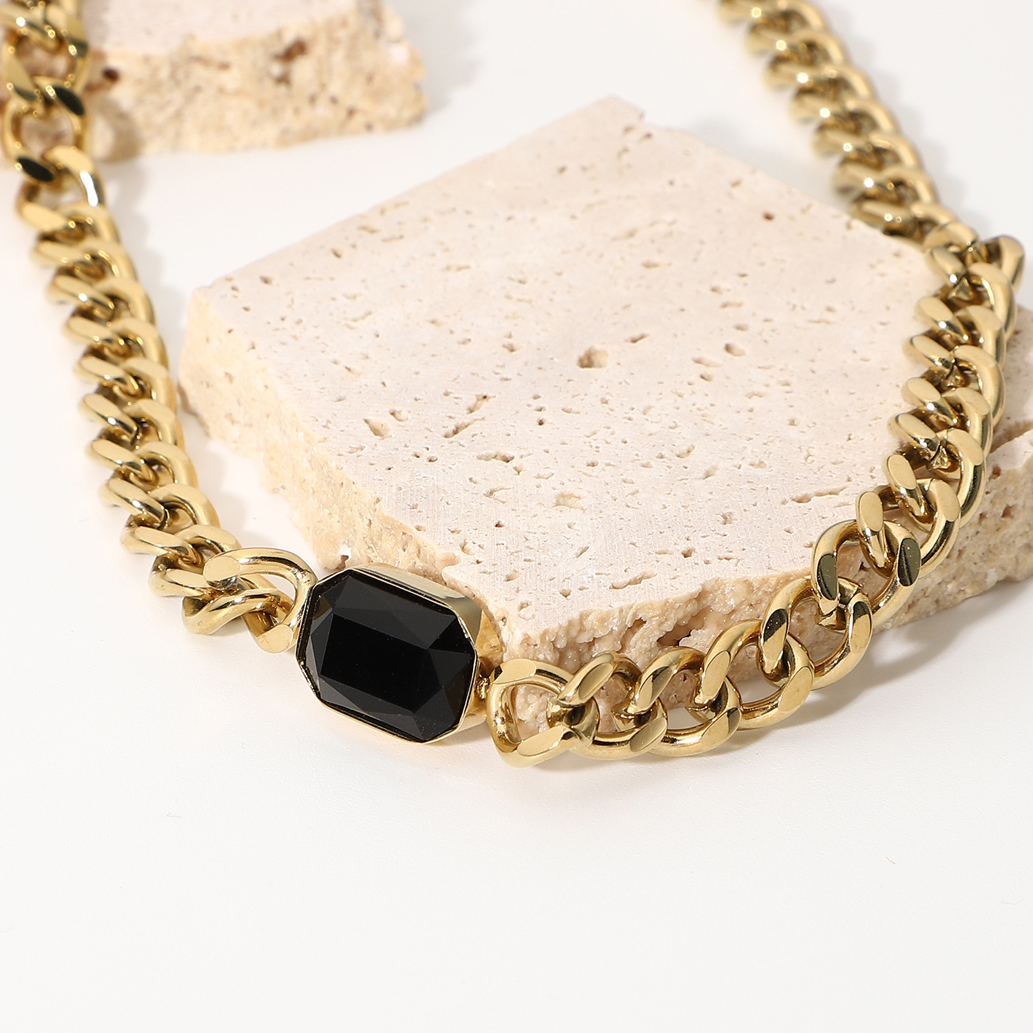 标题:欧美INS同款嘻哈潮男女款钛钢古巴项链14K金色古链条黑色石头项链