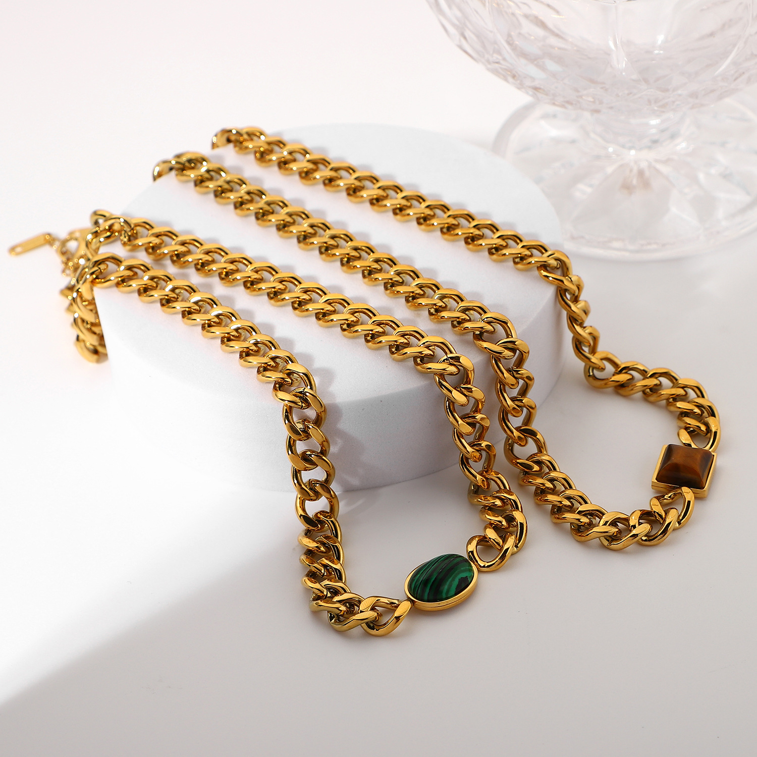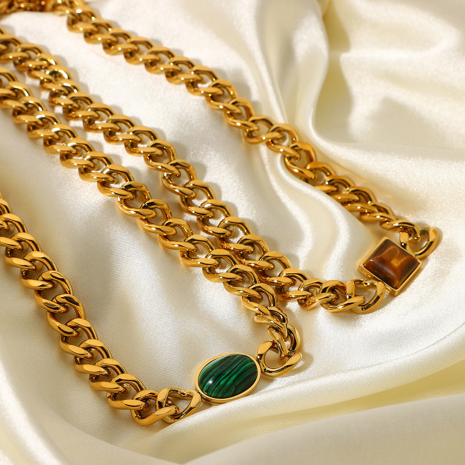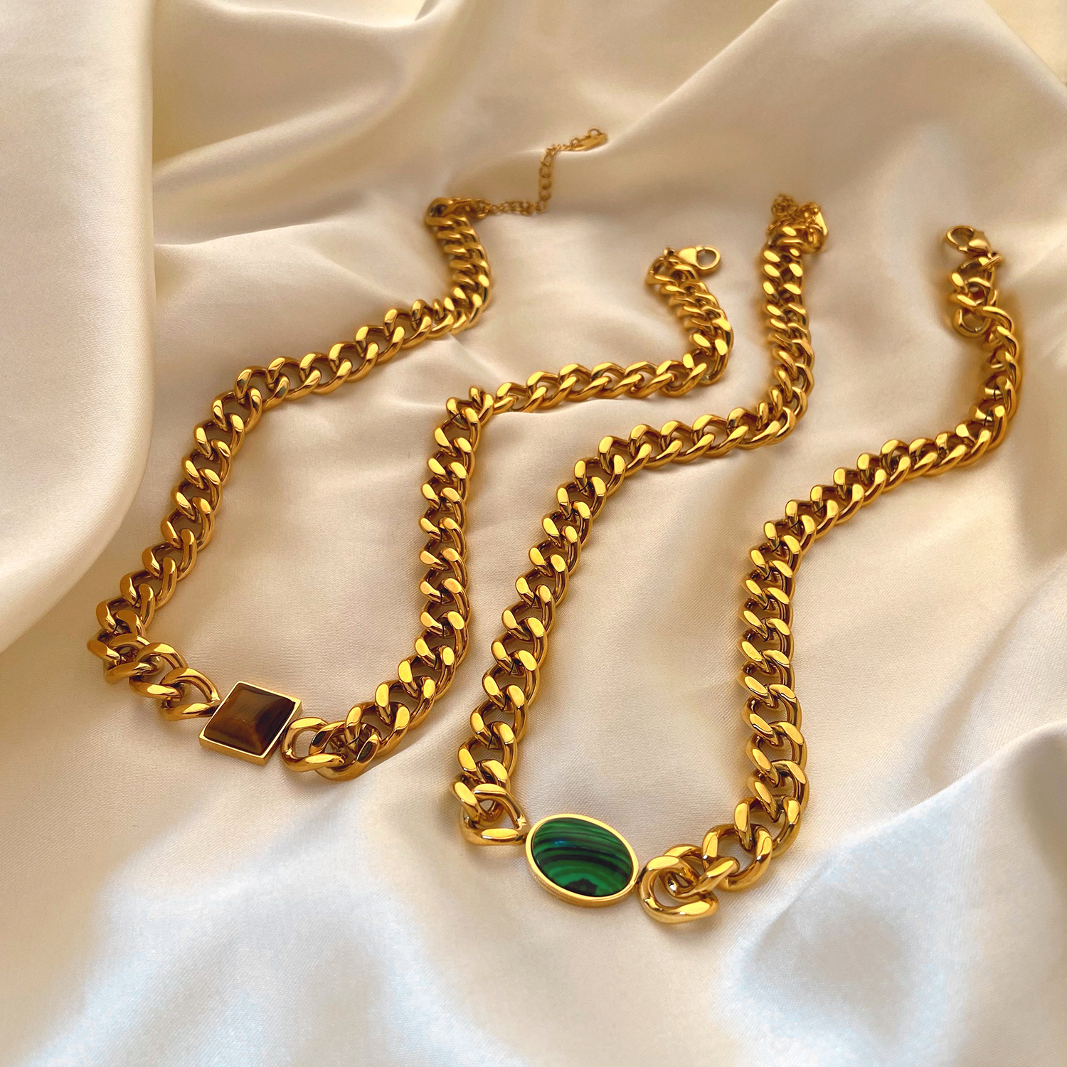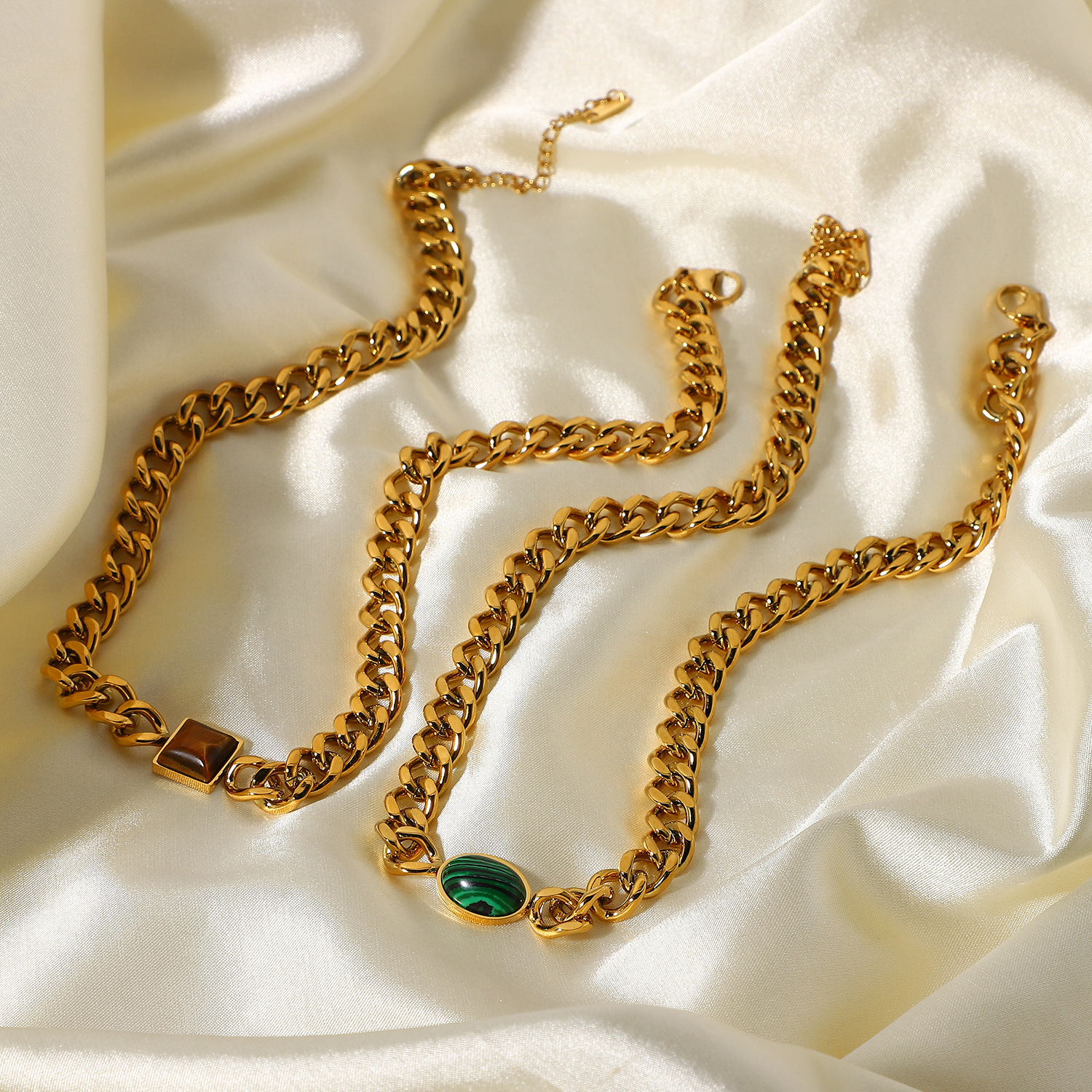 标题:欧美INS风新款不锈钢项链18K金古巴链椭圆绿孔雀石/虎眼心形项链