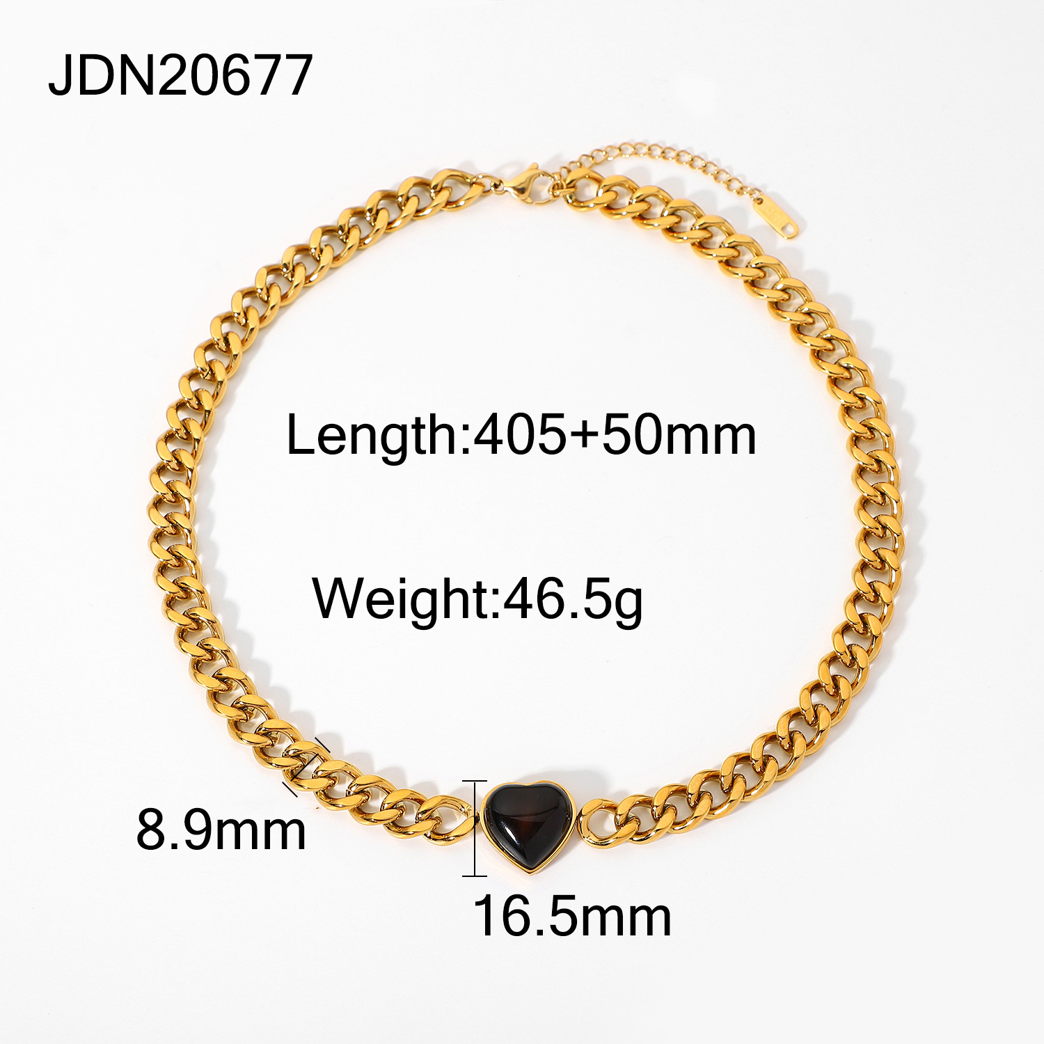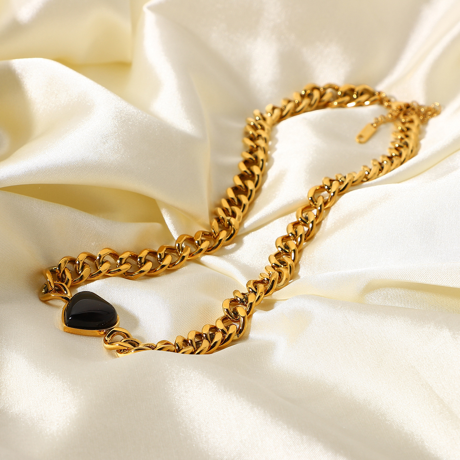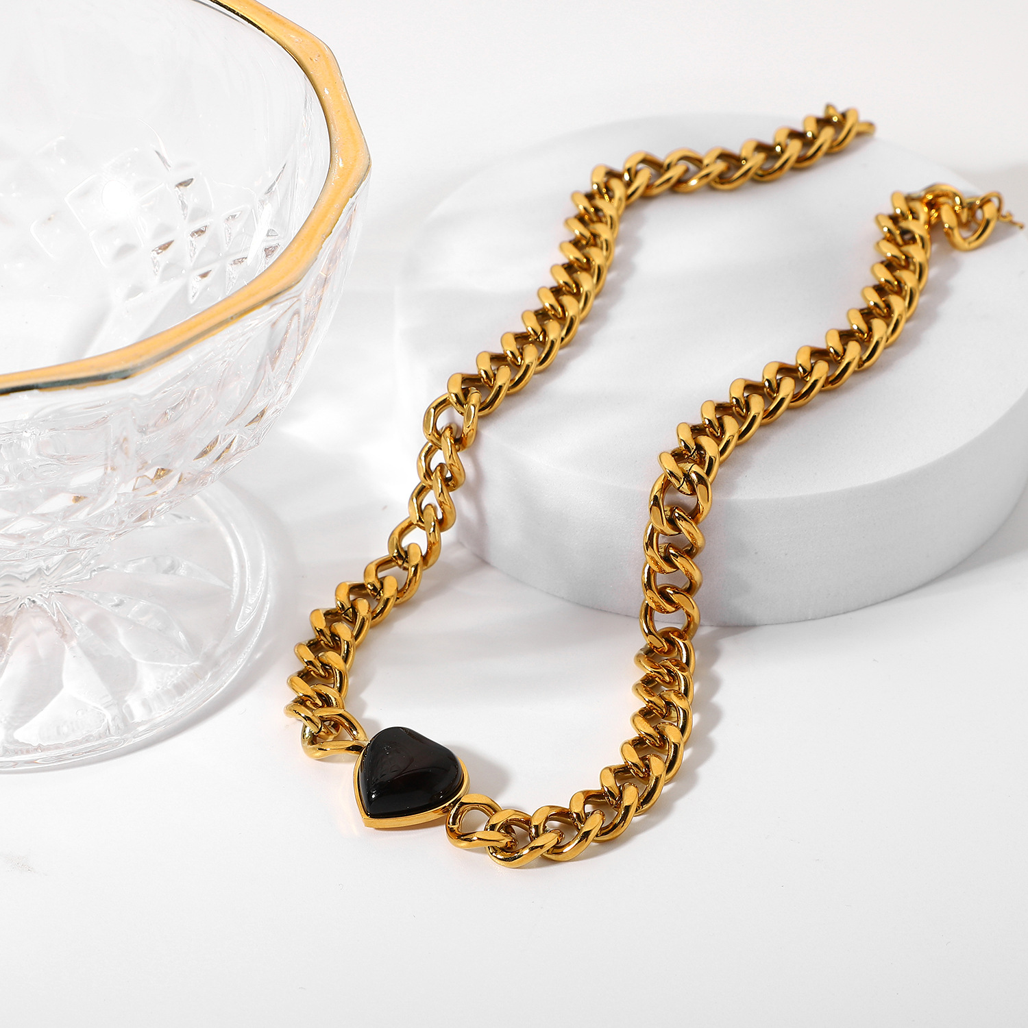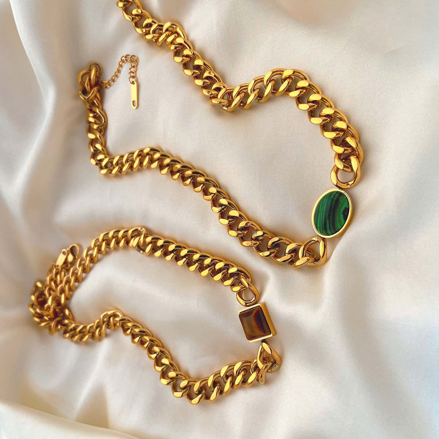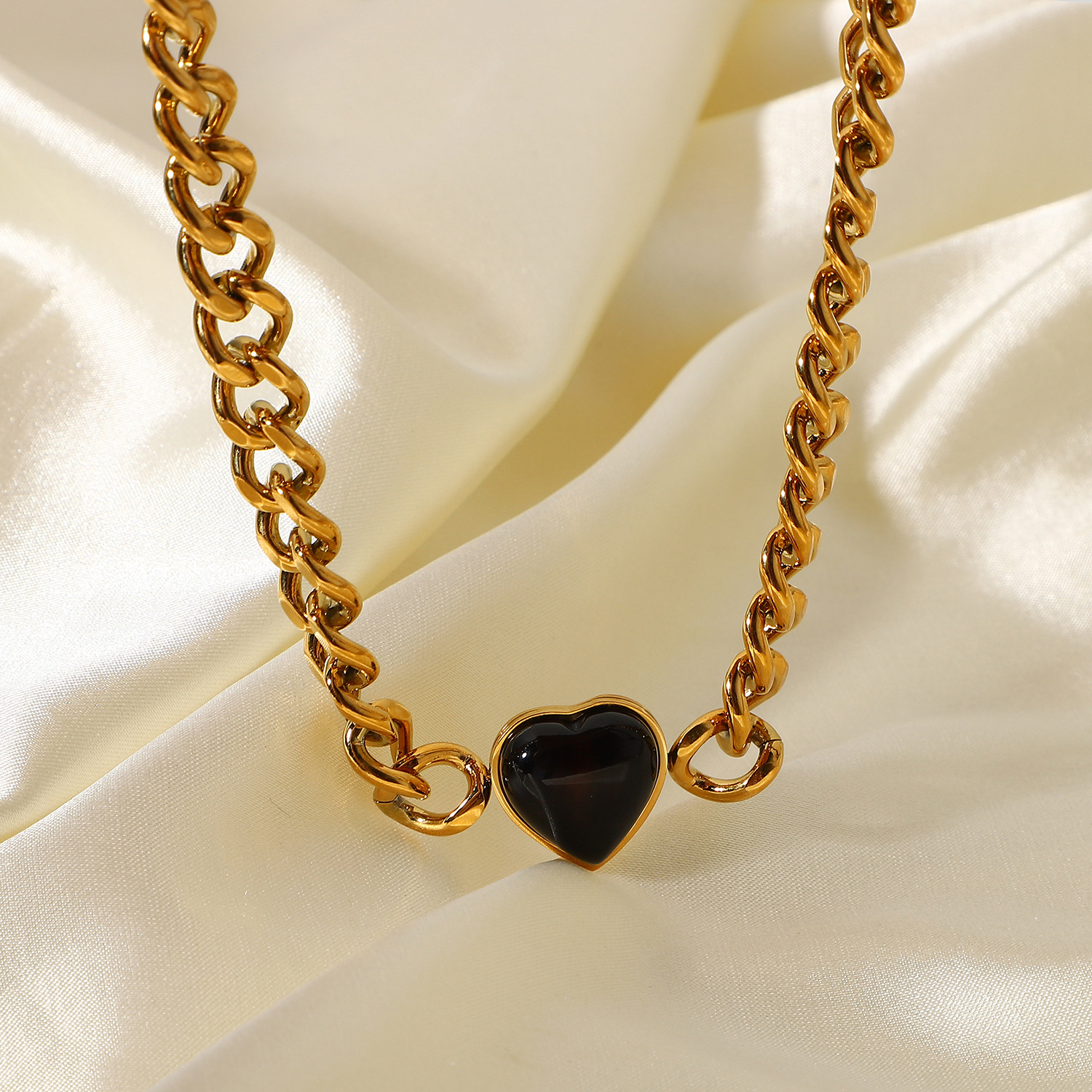 标题:欧美INS风新款不锈钢项链18K金古巴链椭圆绿孔雀石/虎眼心形项链
