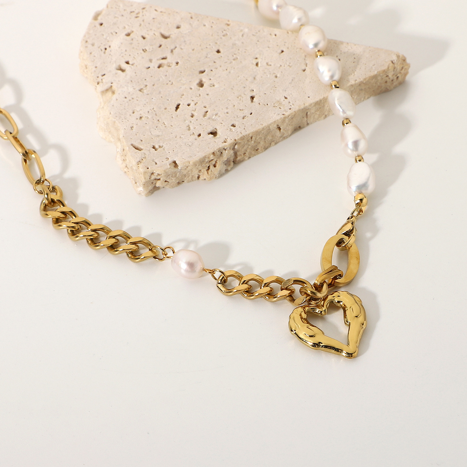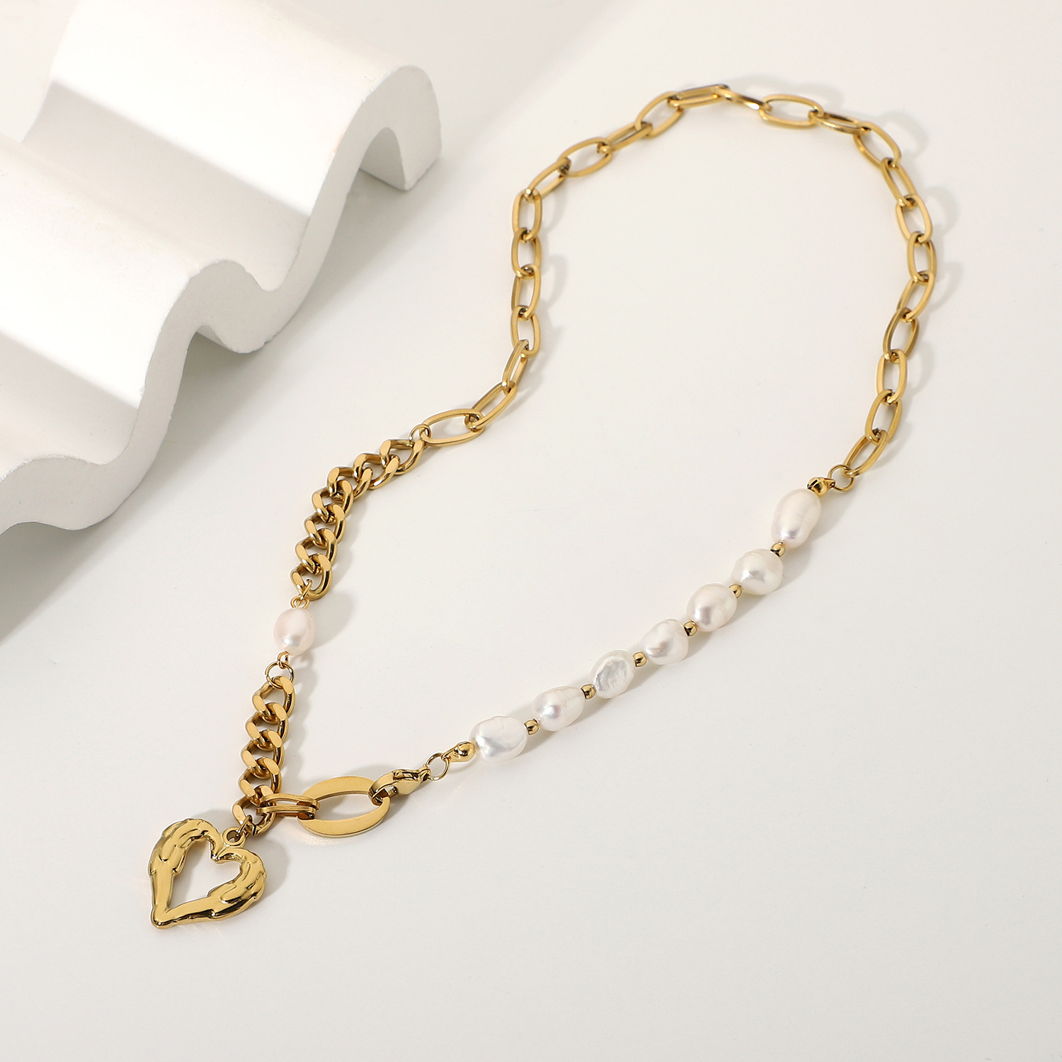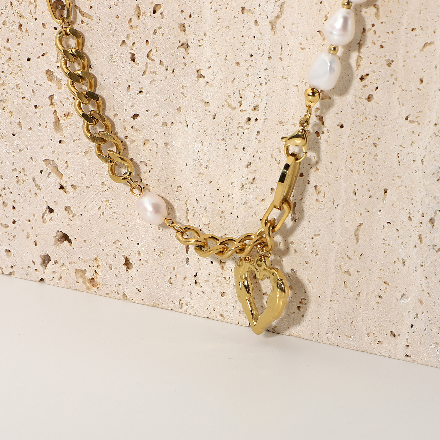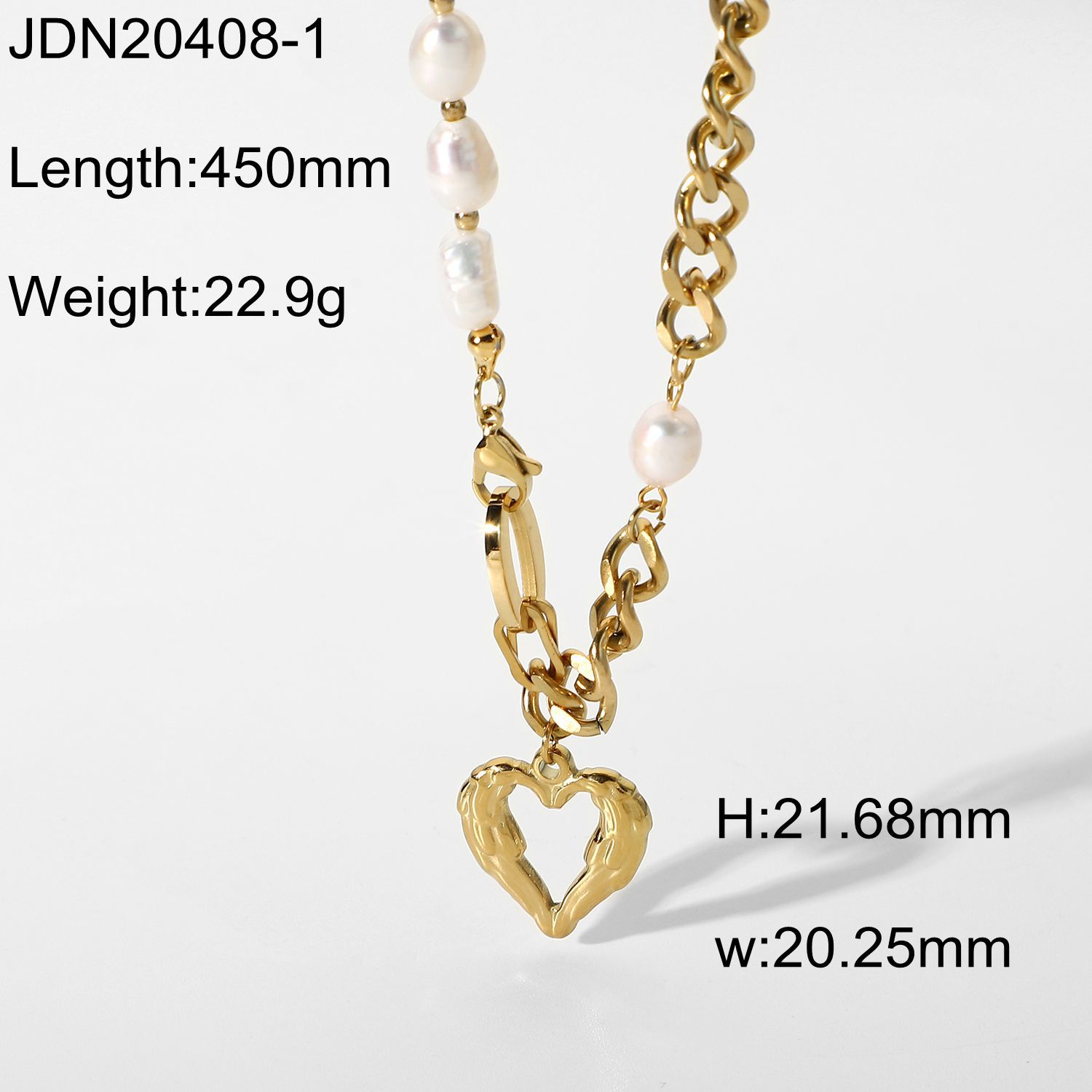 标题:欧美时尚心形吊坠项链不锈钢金色天然淡水珍珠链条爱心吊坠项链女