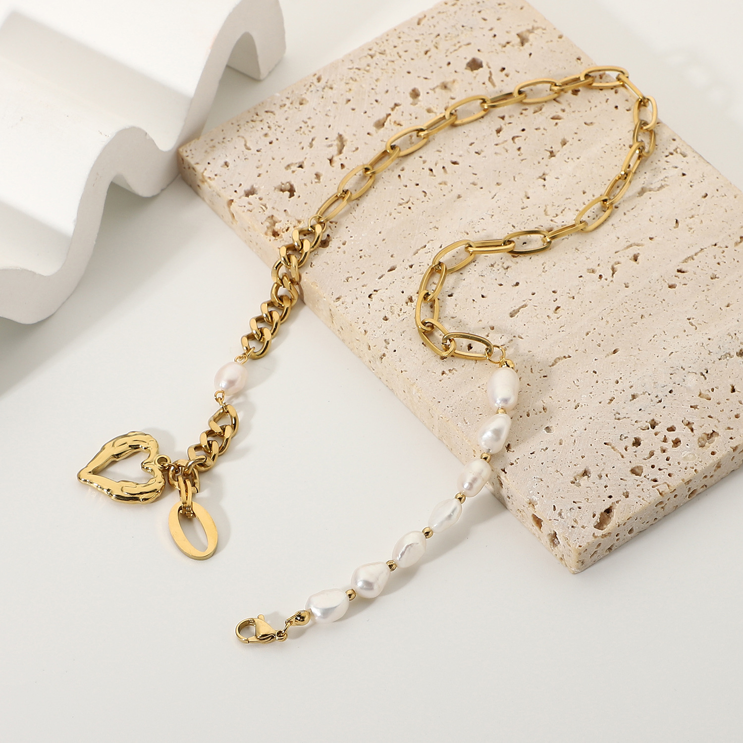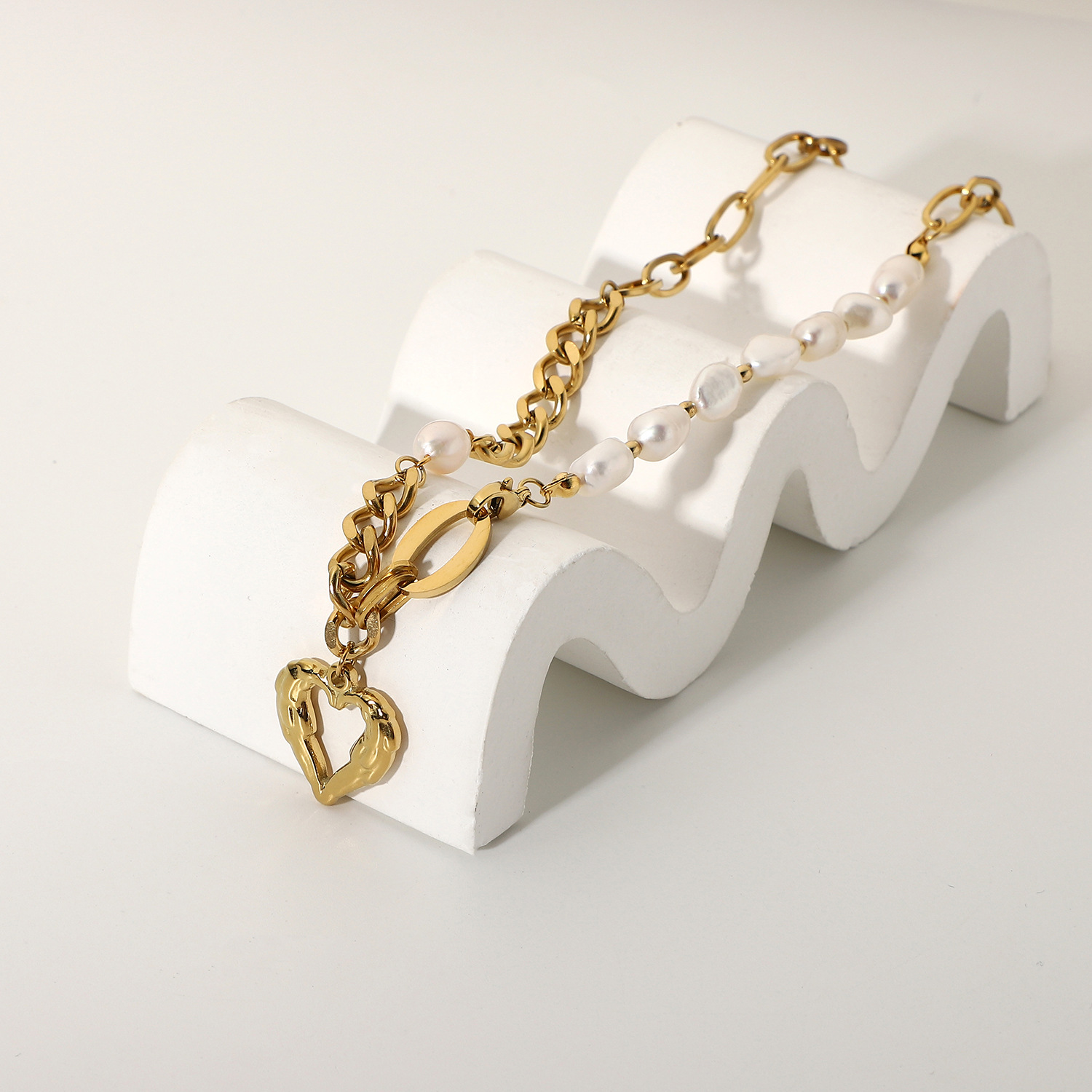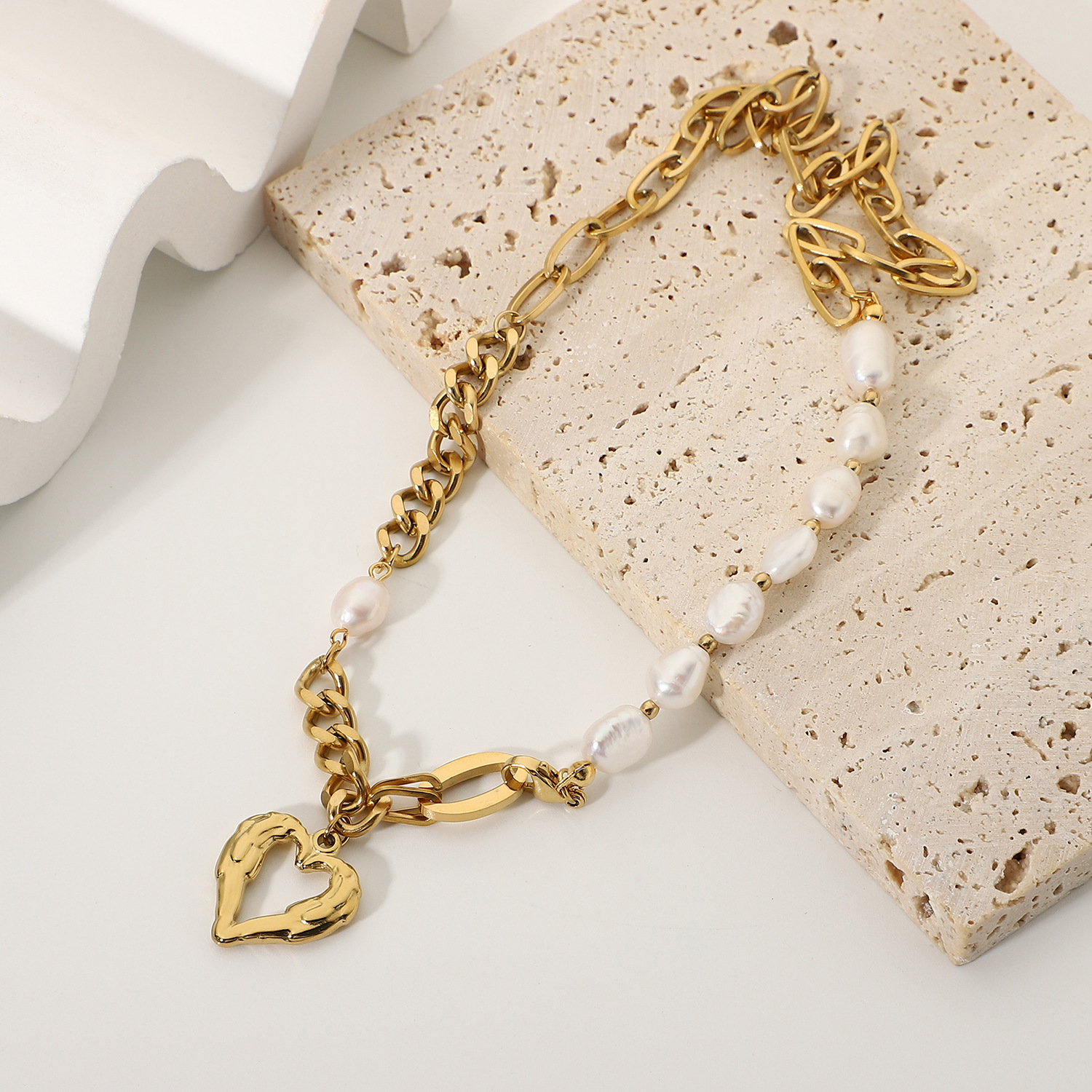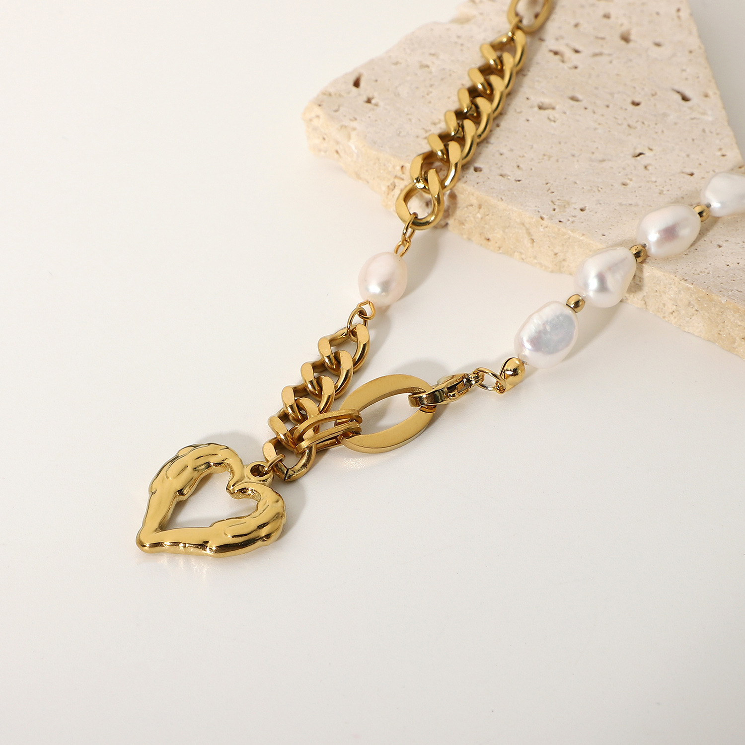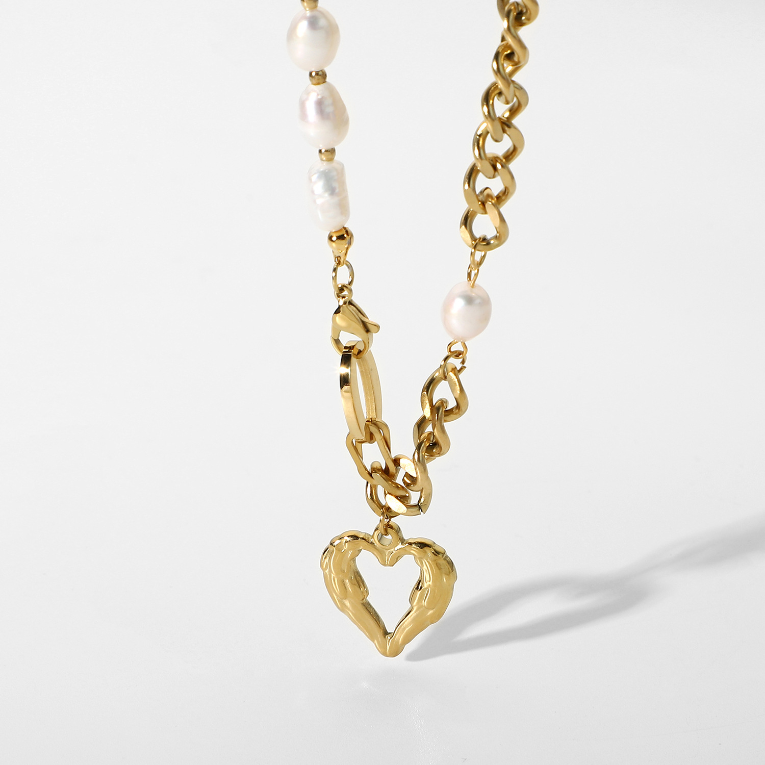 标题:欧美时尚心形吊坠项链不锈钢金色天然淡水珍珠链条爱心吊坠项链女