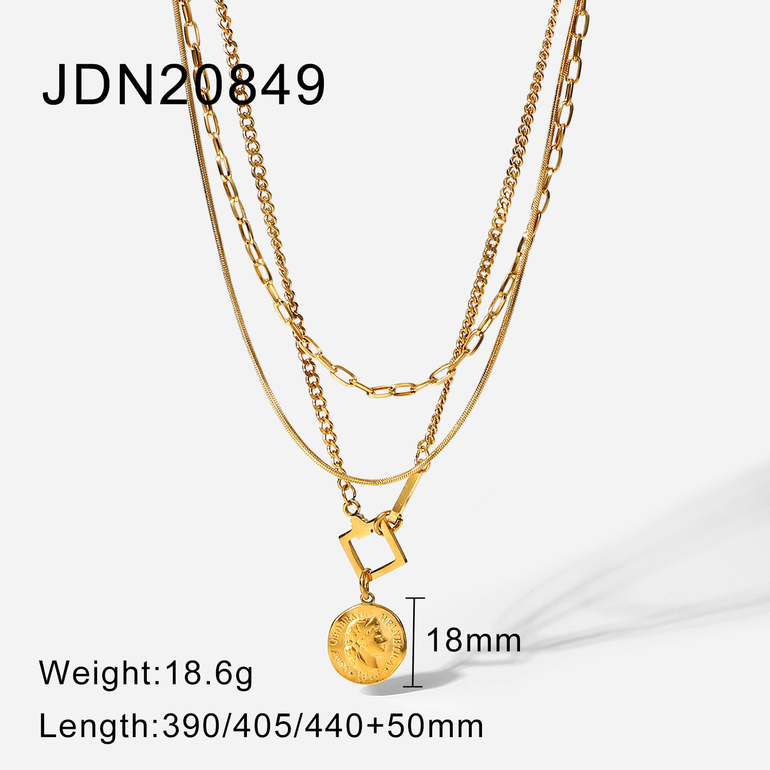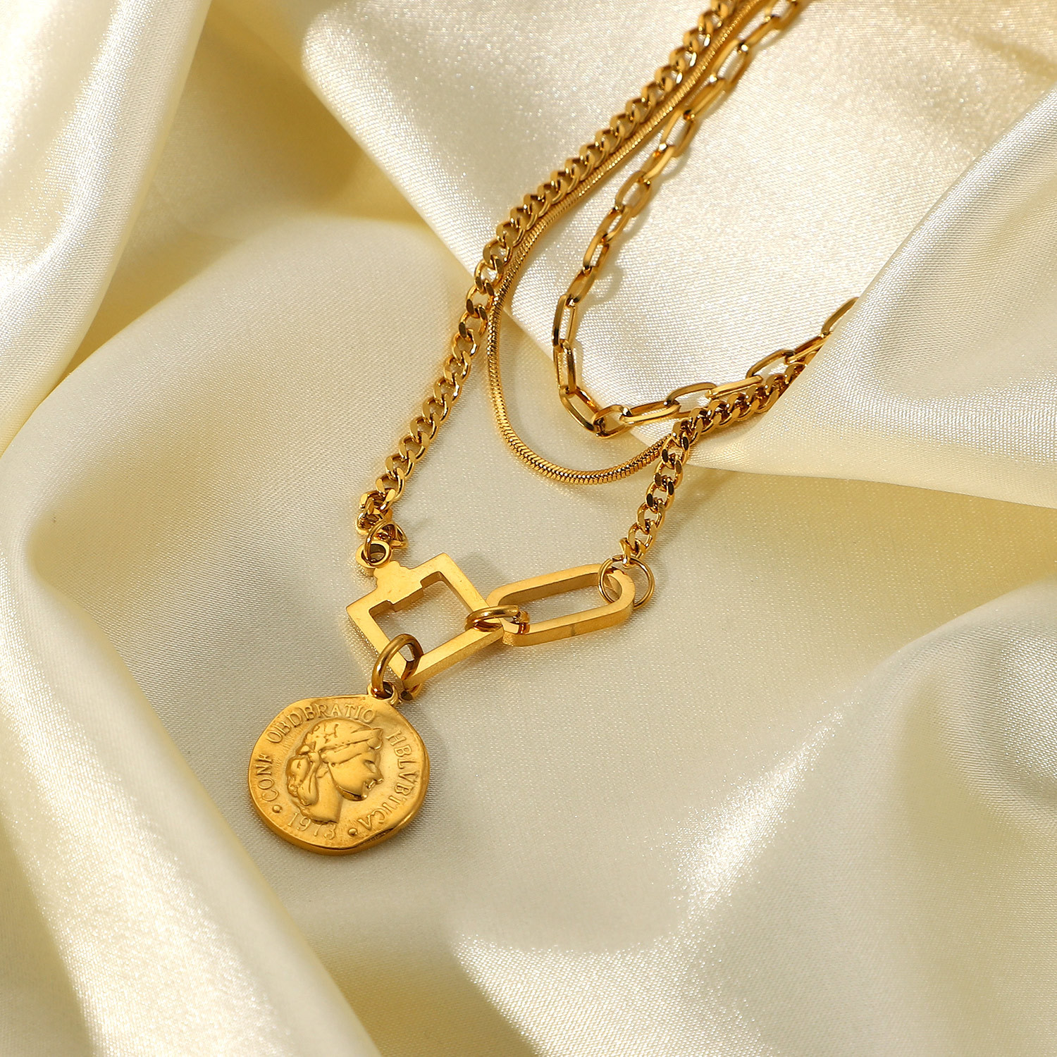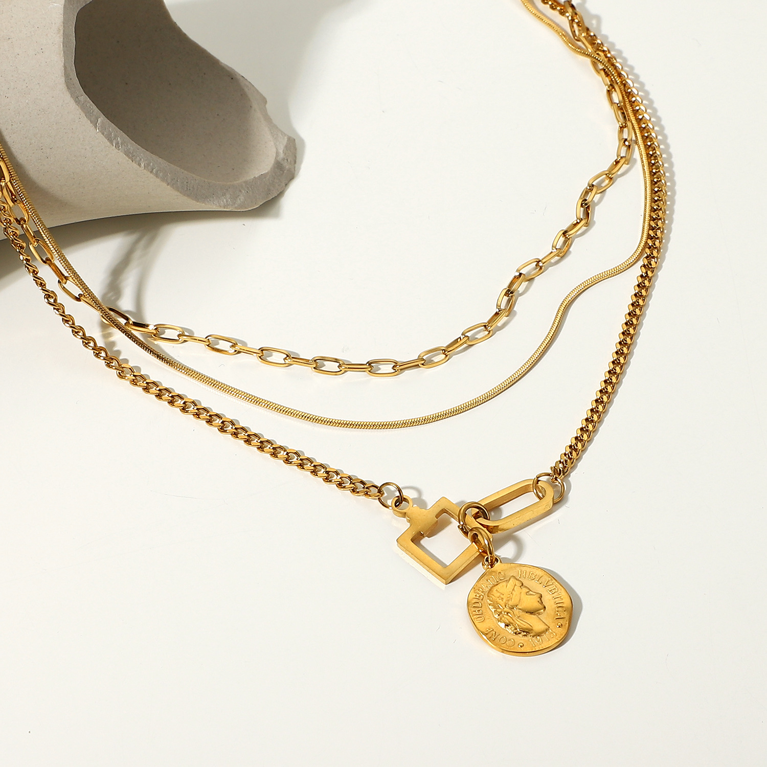 标题:INS风三层18K镀金不锈钢防水饰品镂空方形椭圆女王硬币吊坠项链女