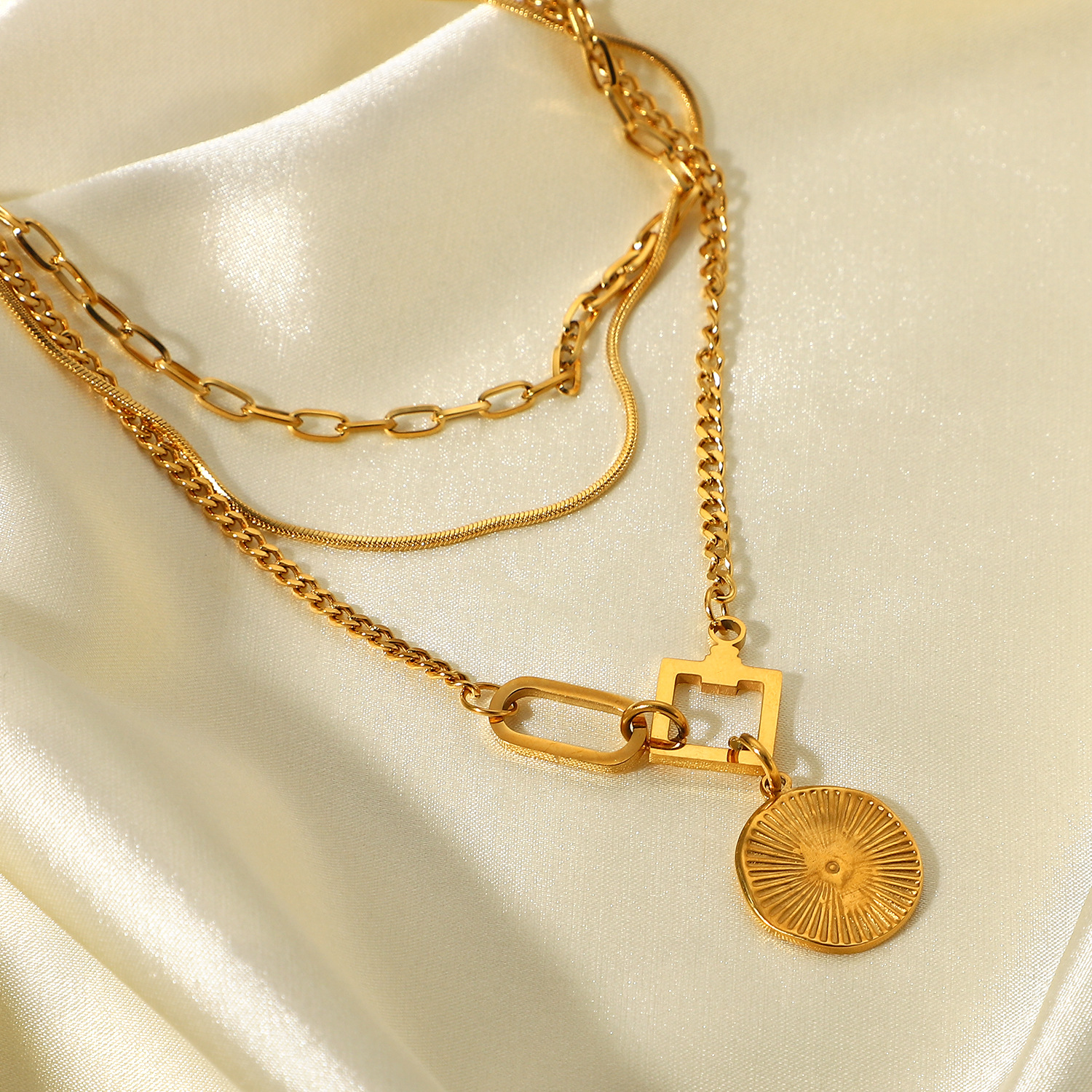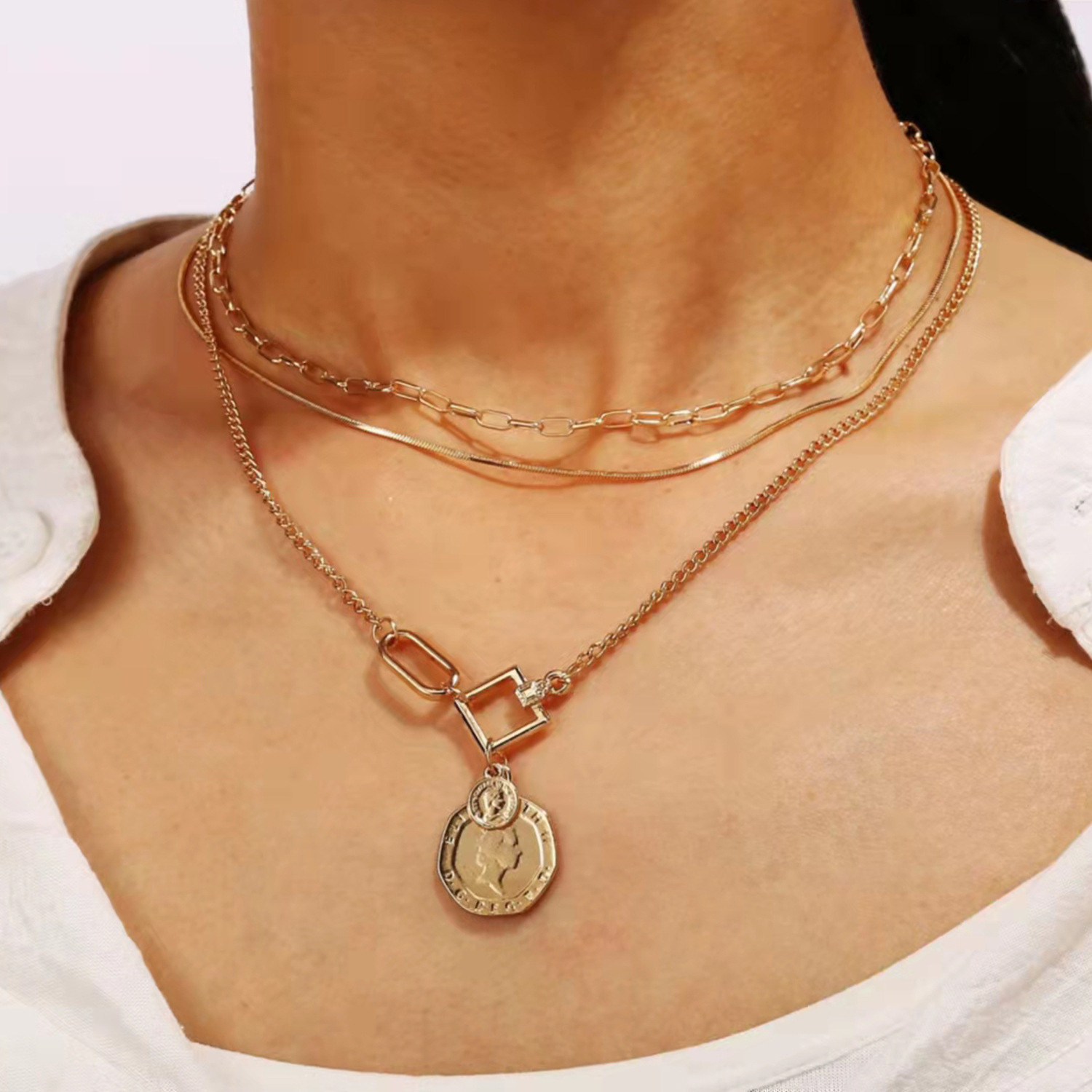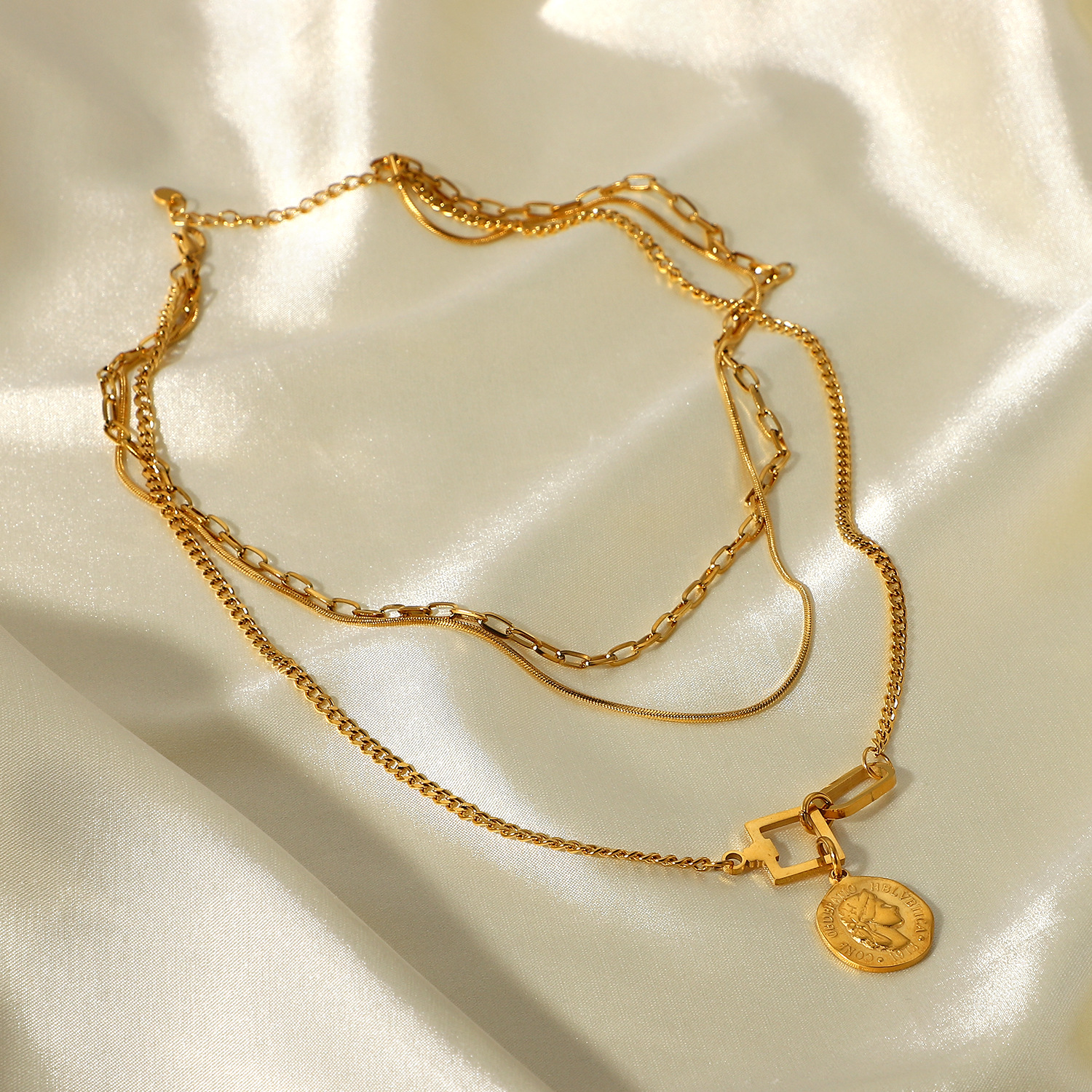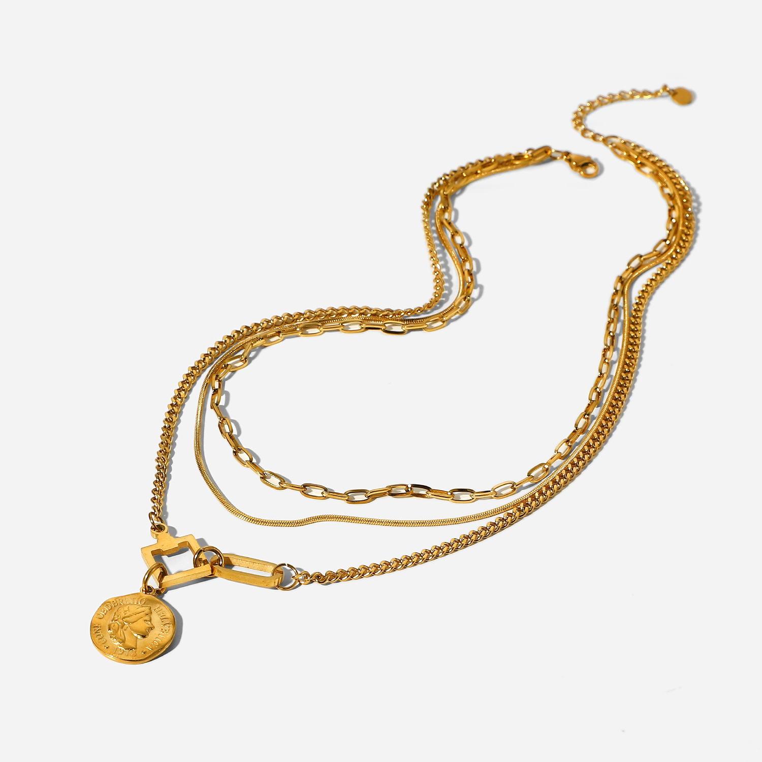 标题:INS风三层18K镀金不锈钢防水饰品镂空方形椭圆女王硬币吊坠项链女