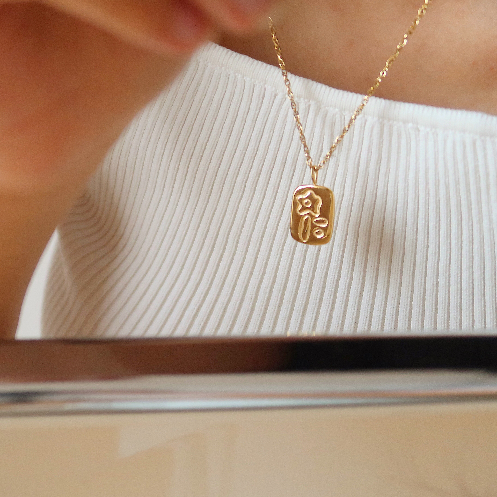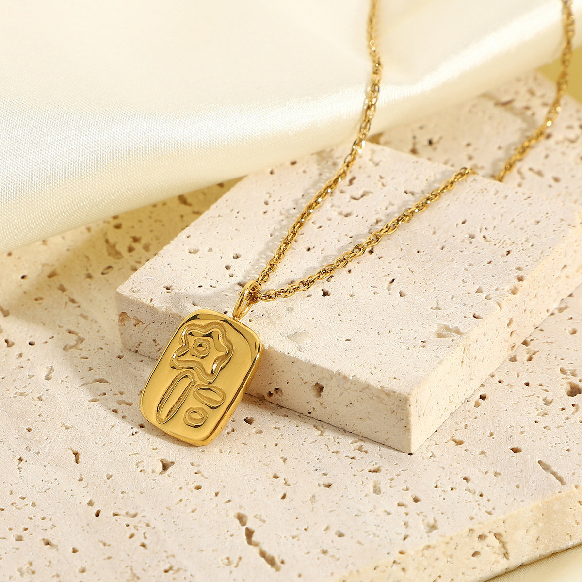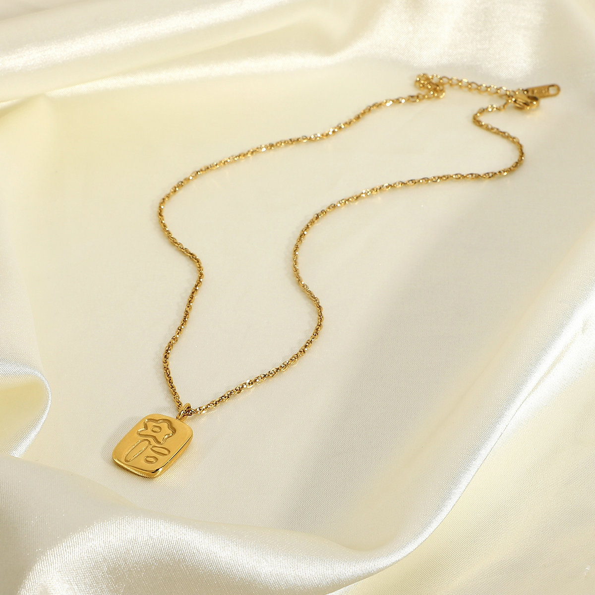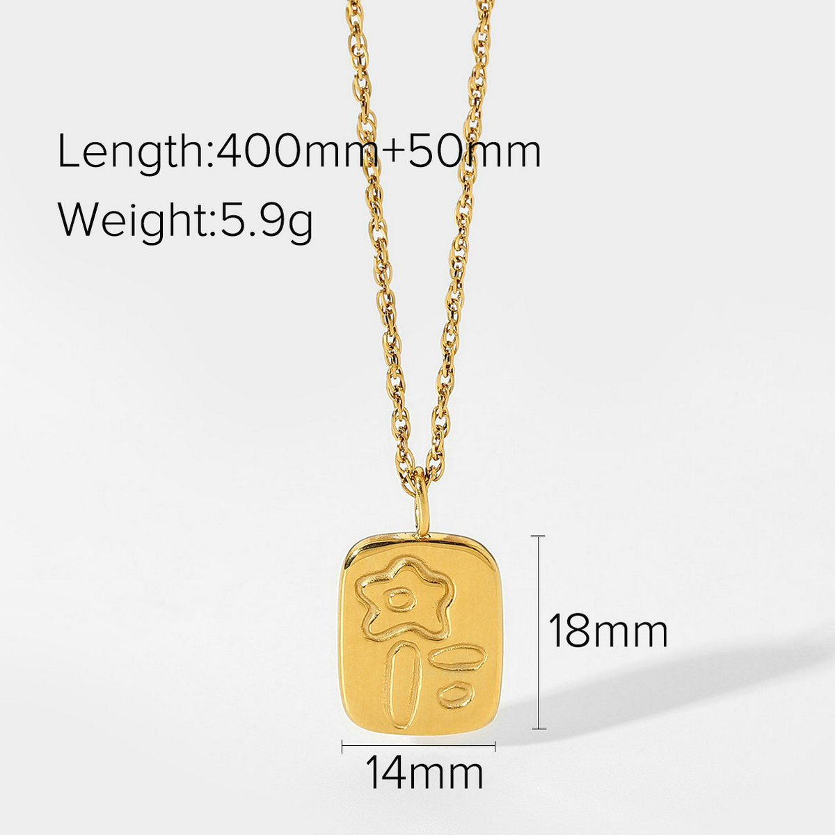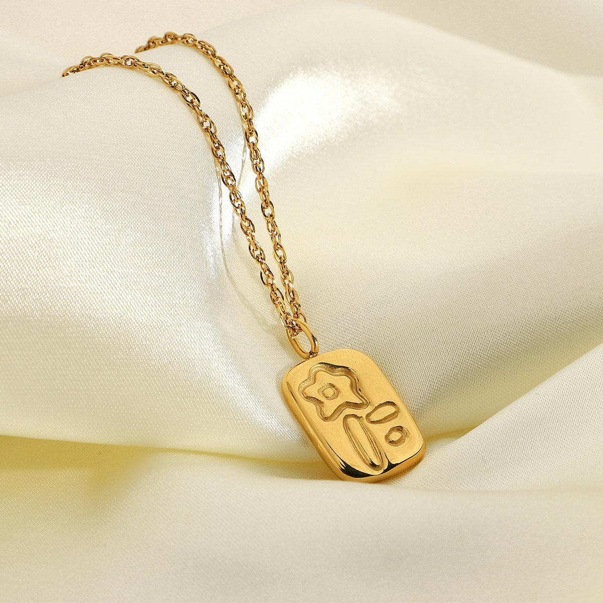 标题:轻奢童趣镂刻小花朵项链可爱方牌吊坠项链 18K不锈钢钛钢颈链