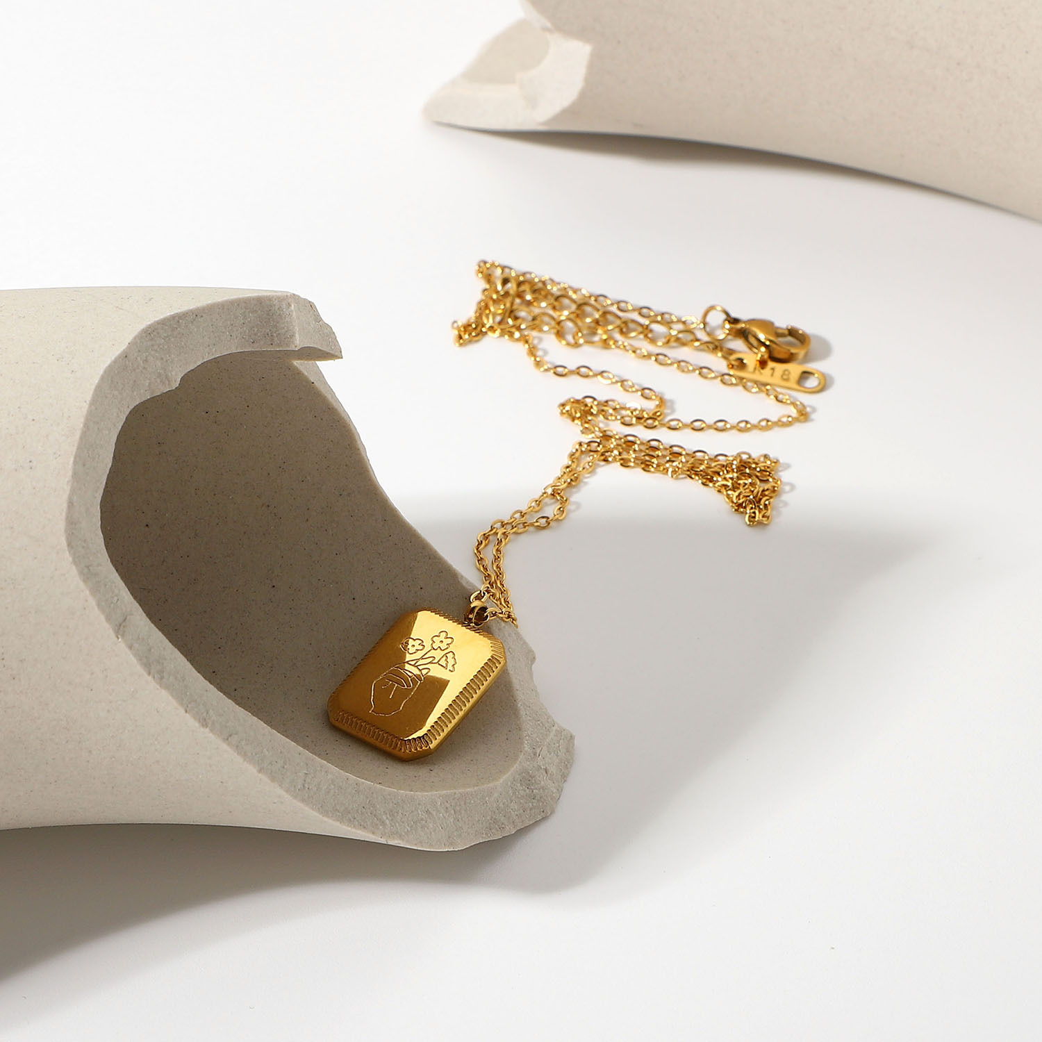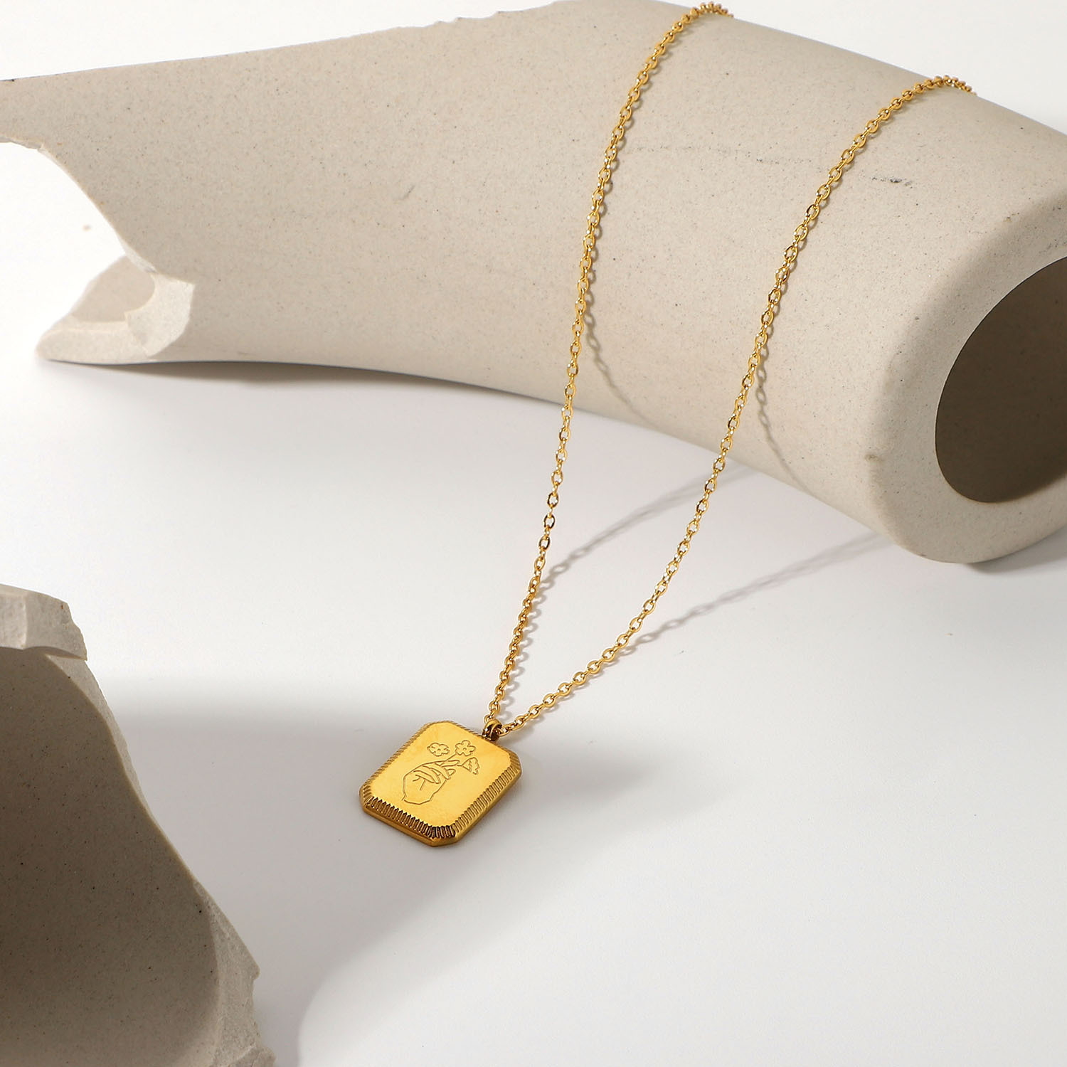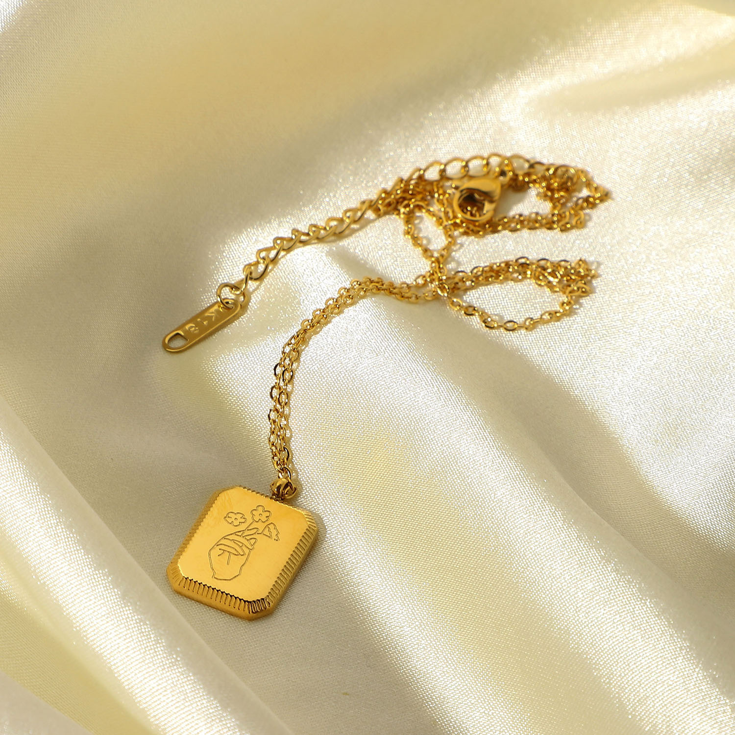 标题:欧美INS网红同款钛钢项链三朵小花雕刻方形吊坠项链颈链饰品女式