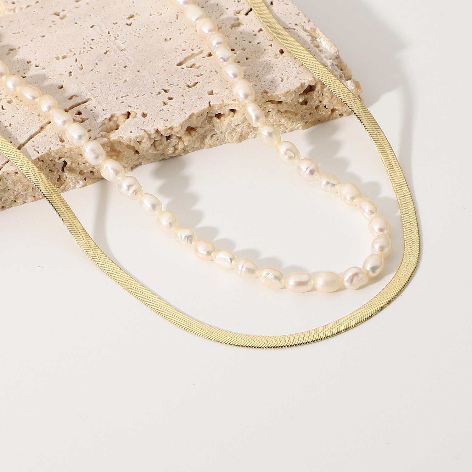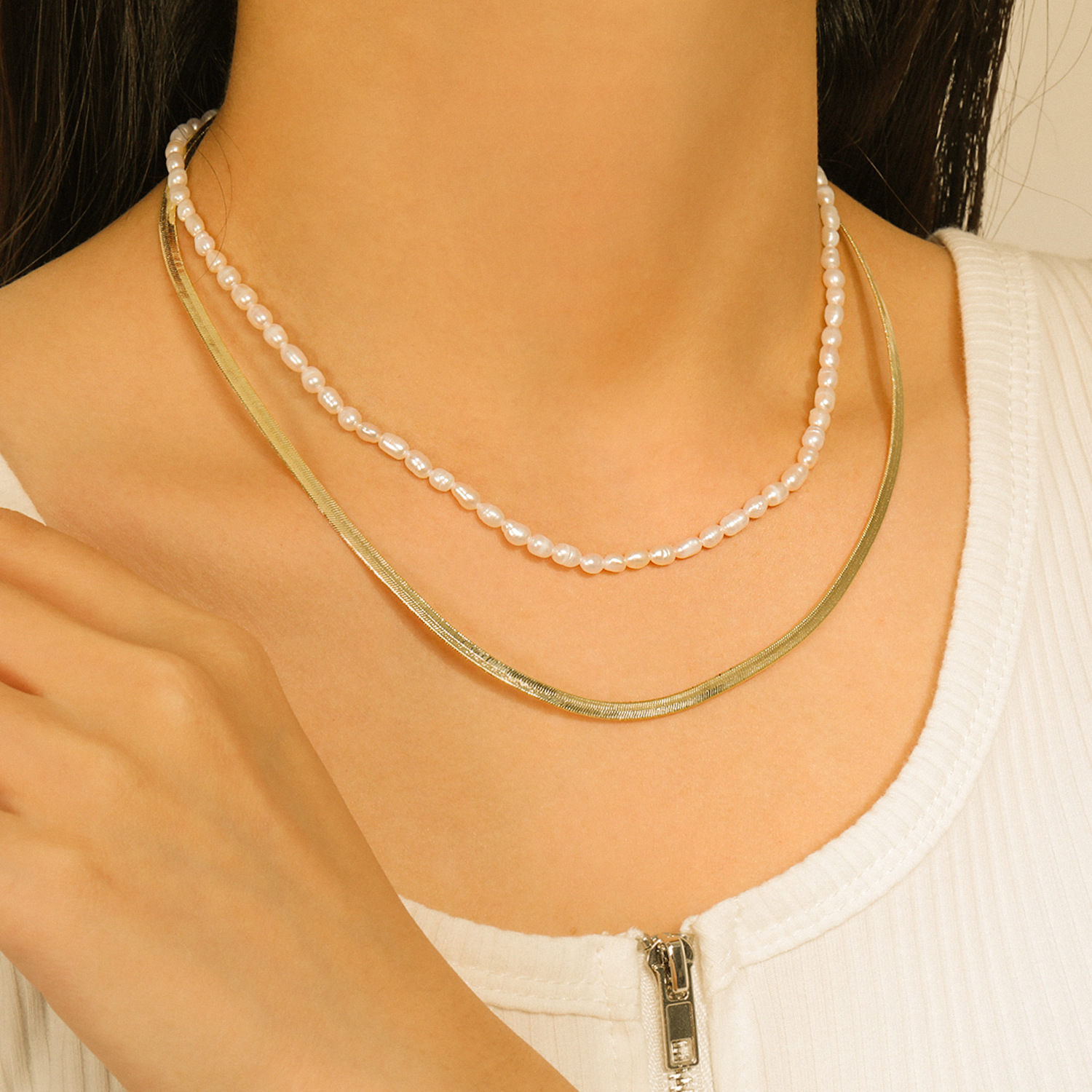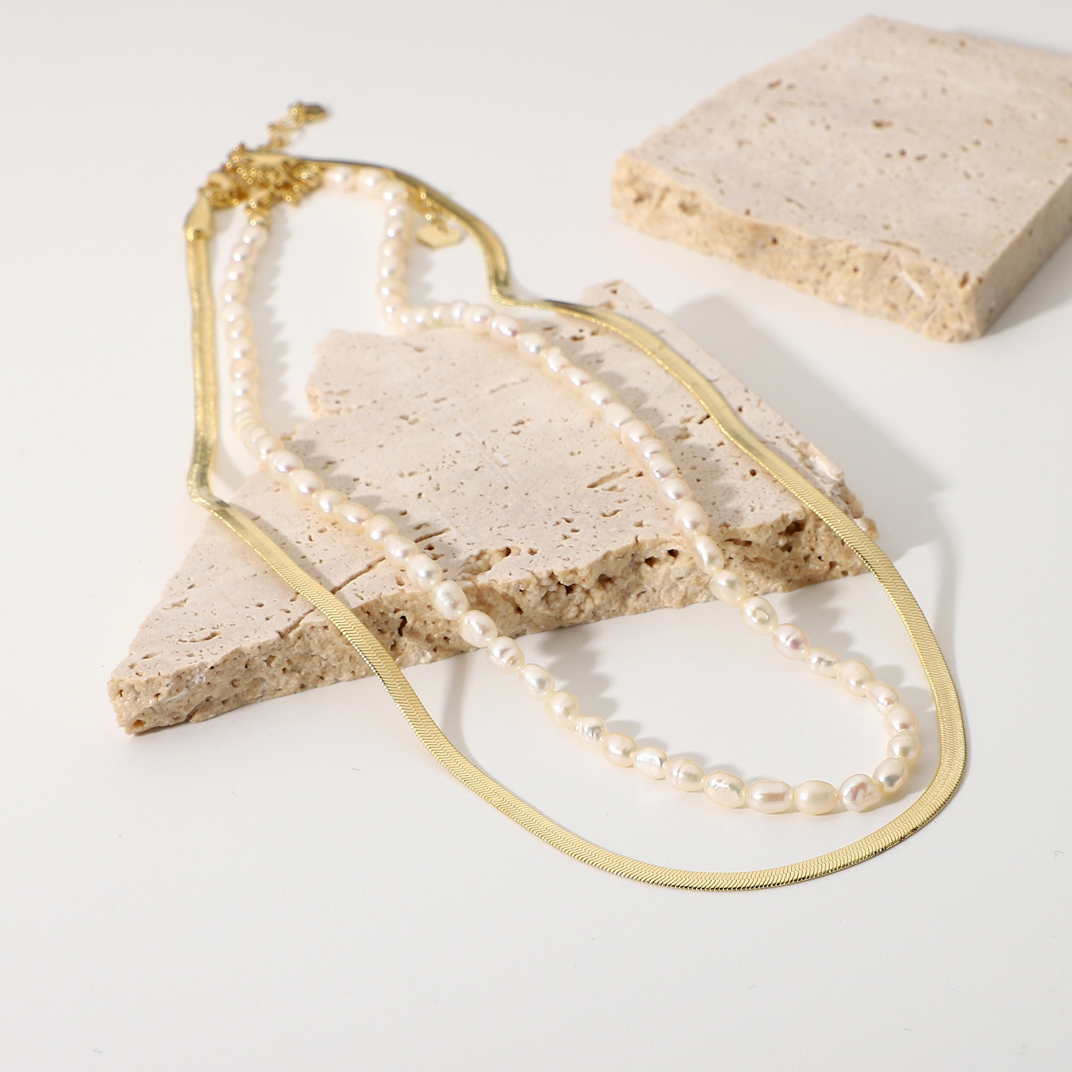 标题:INS网红项链14K金色双层蛇链珍珠链项链不锈钢金属时尚冷淡风项链