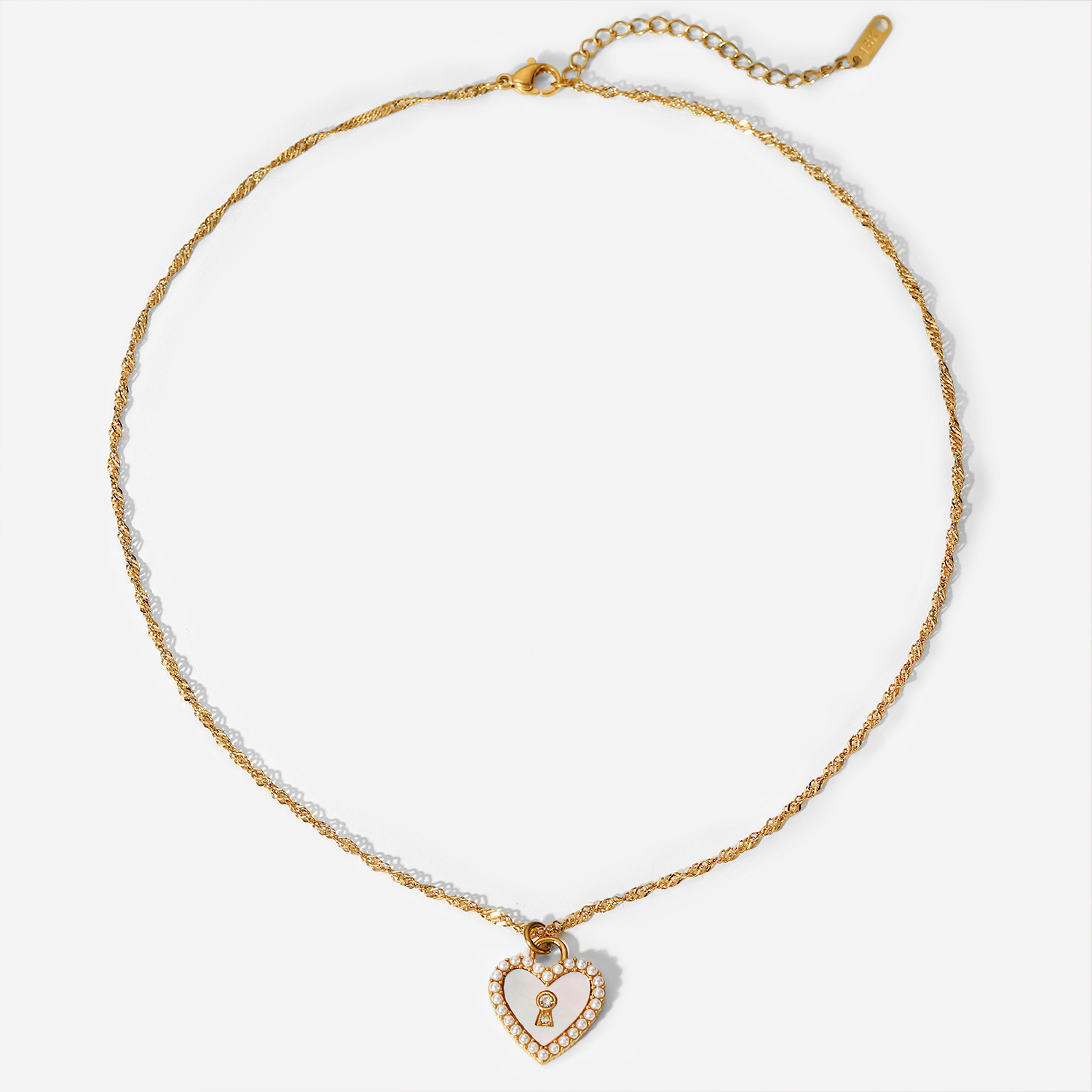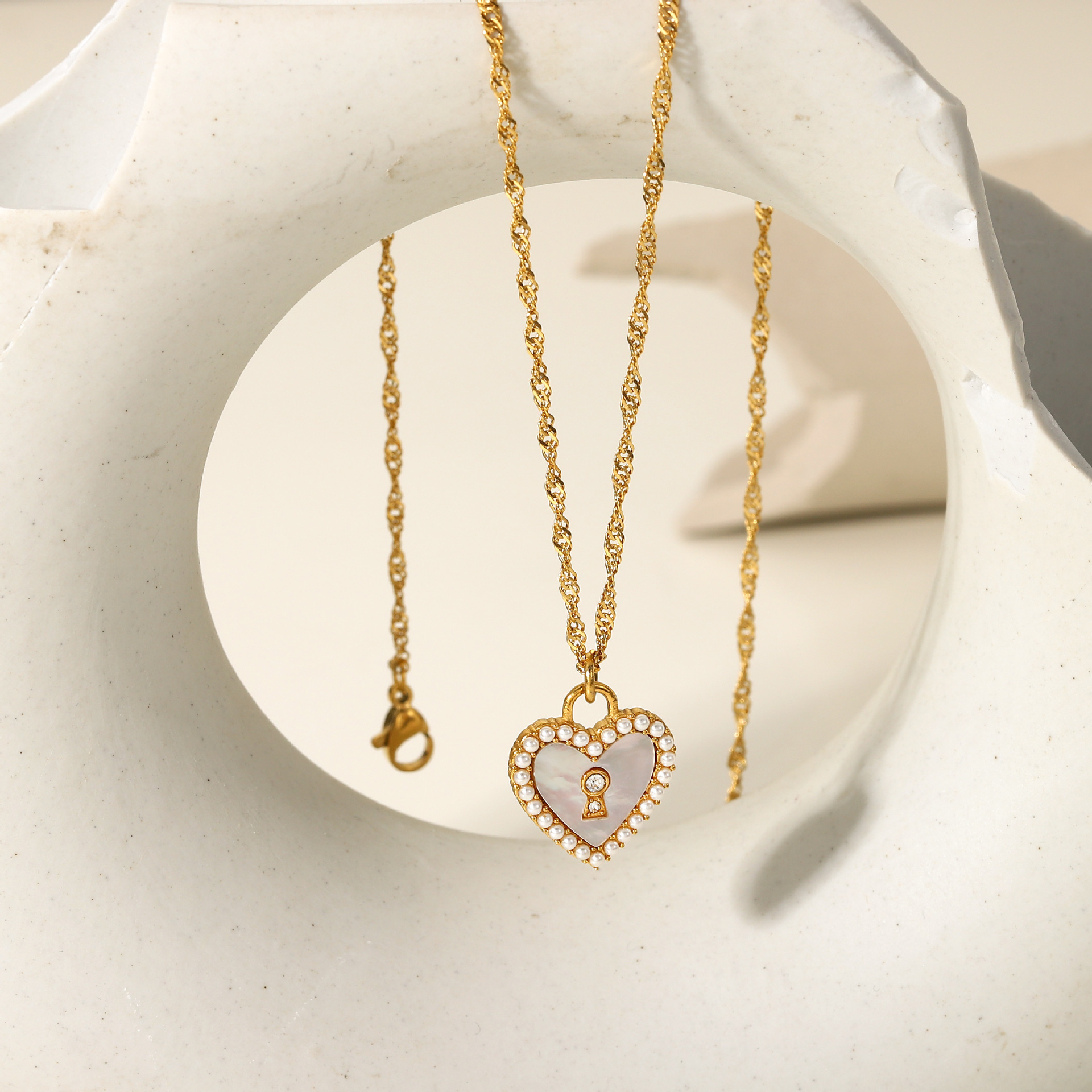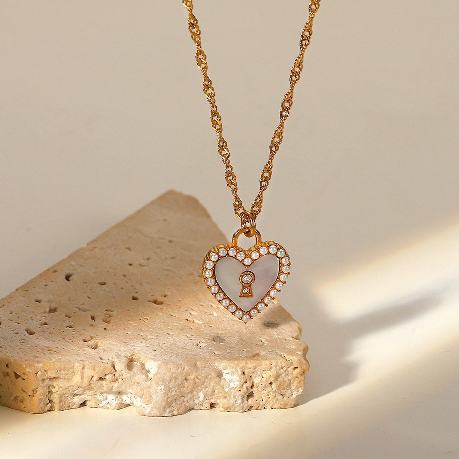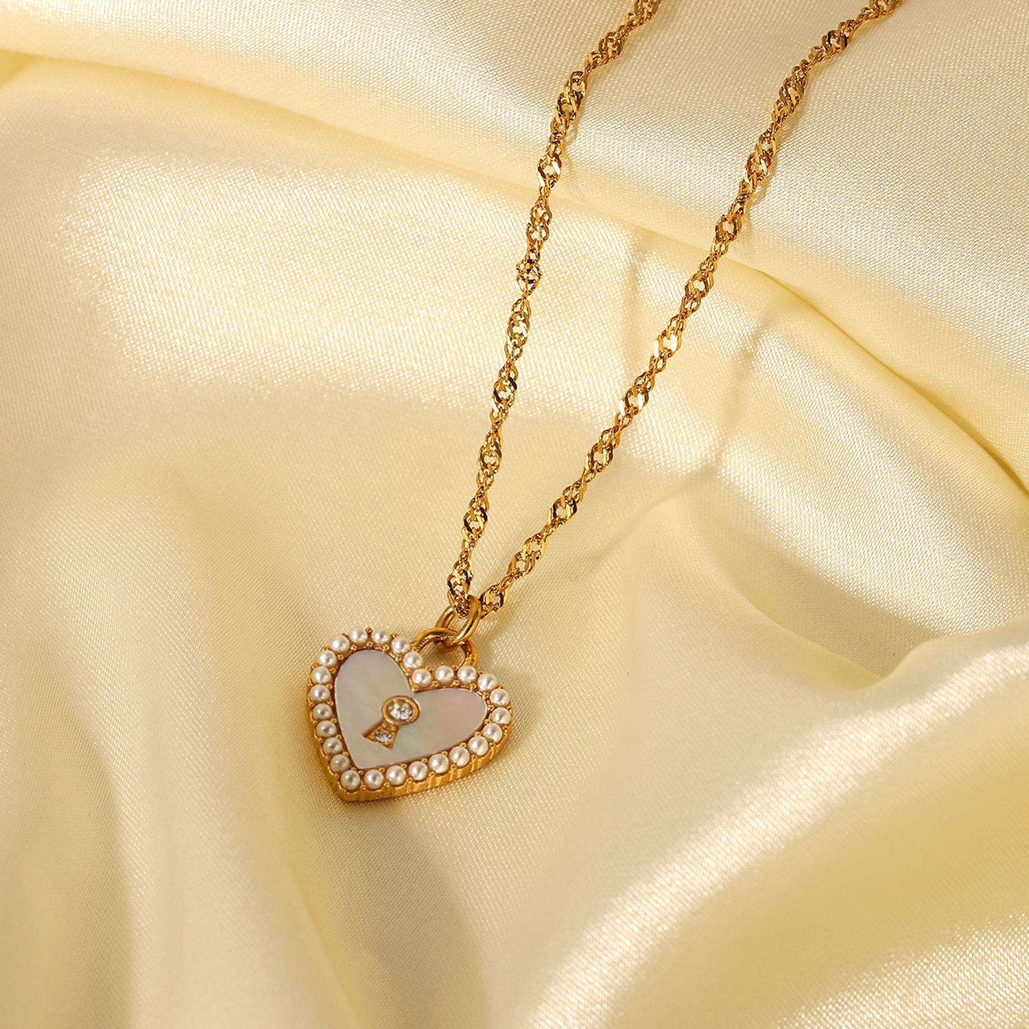 标题:天然白贝珍珠镶边锁孔造型锆石心形吊坠费加罗链18K金不锈钢项链