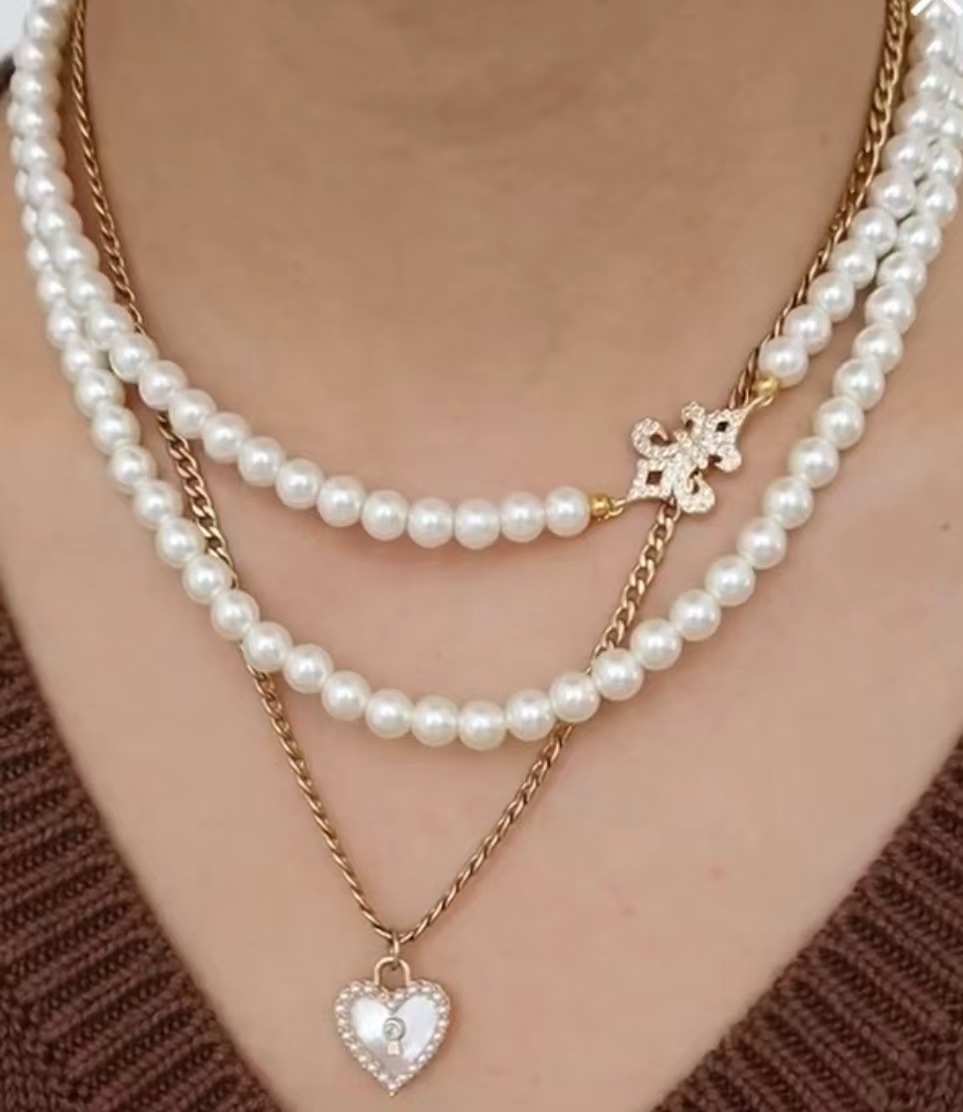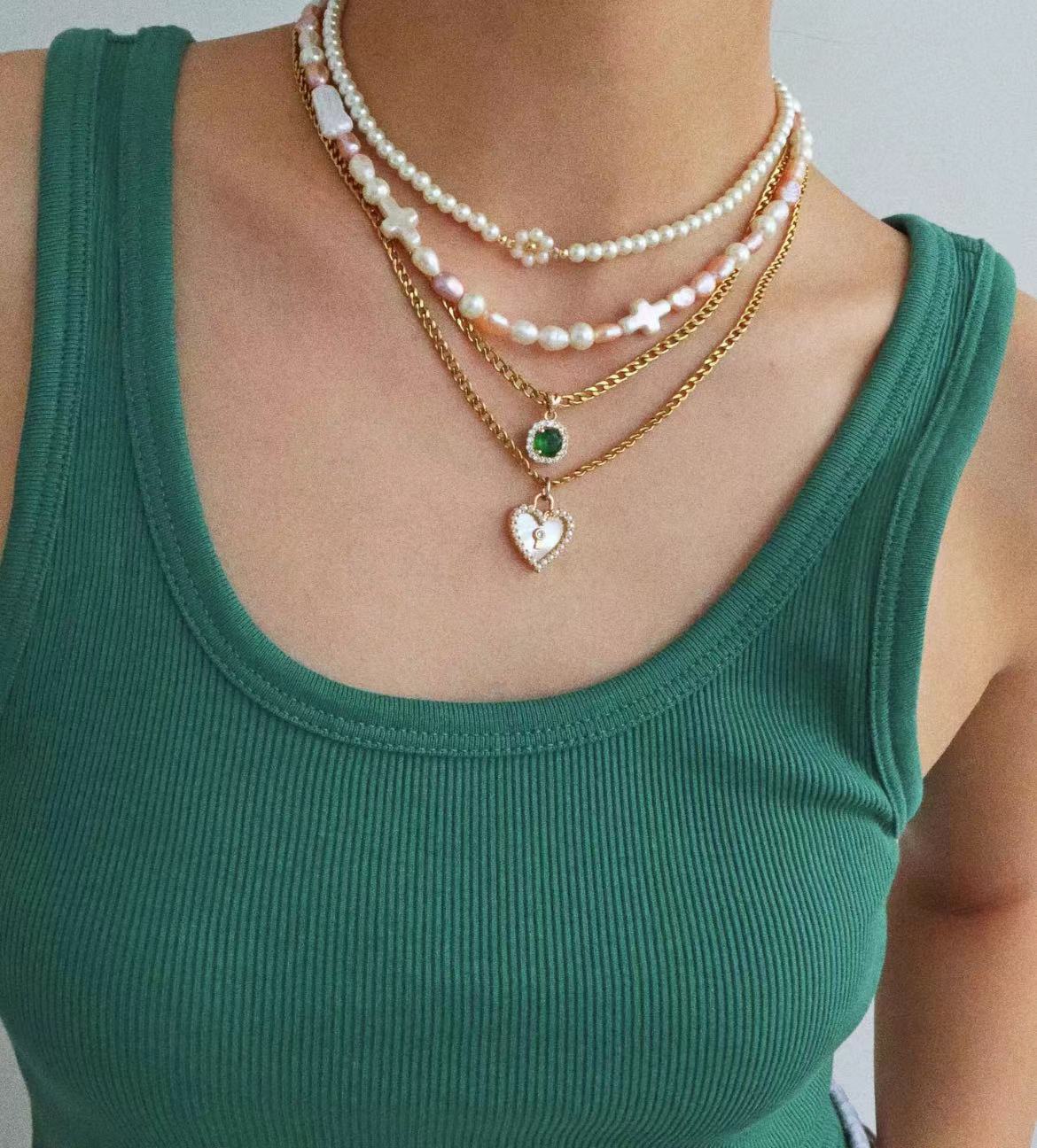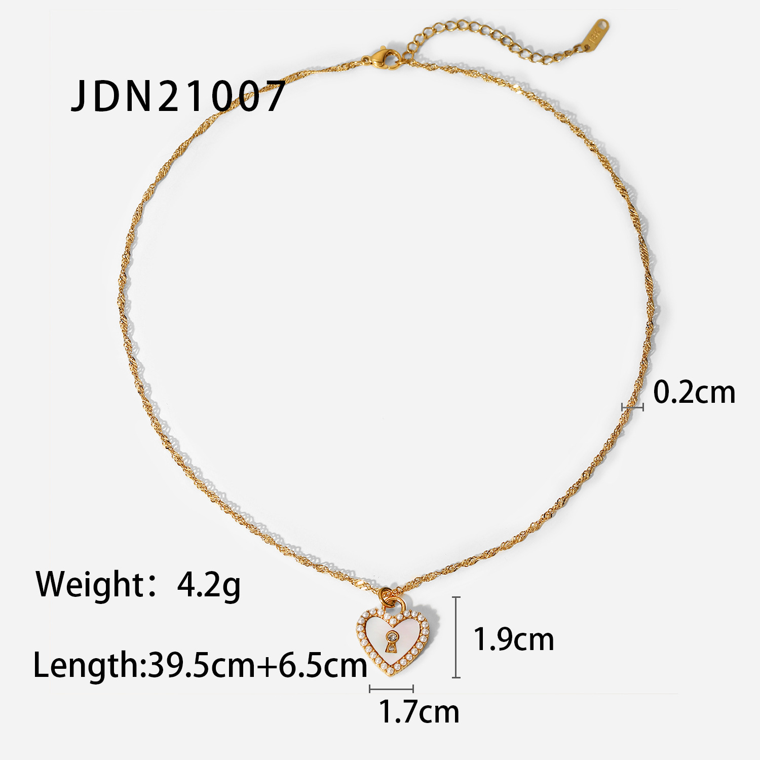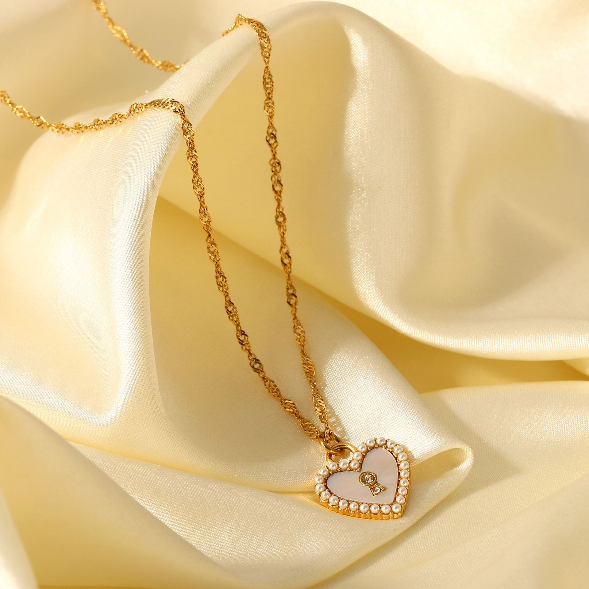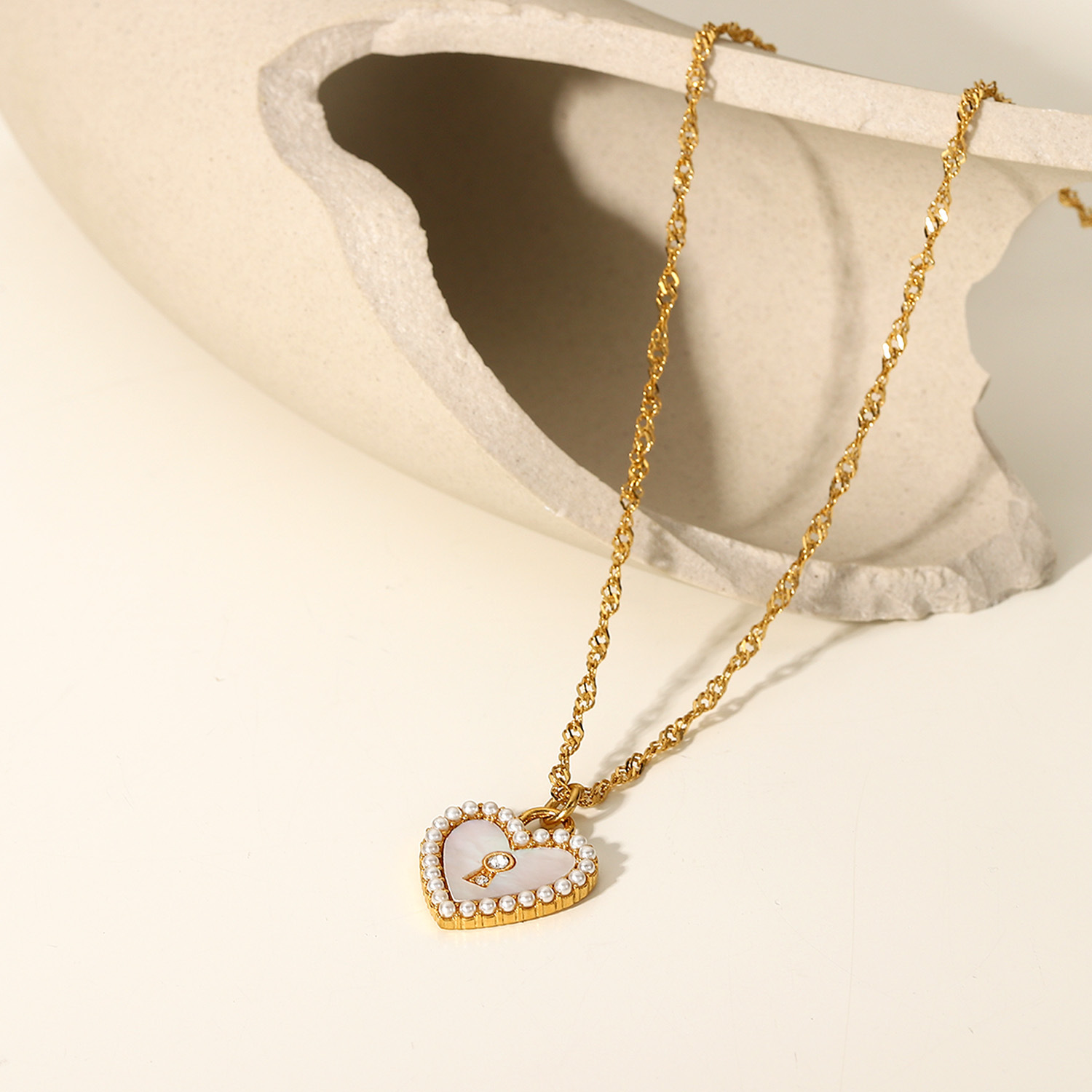 标题:天然白贝珍珠镶边锁孔造型锆石心形吊坠费加罗链18K金不锈钢项链