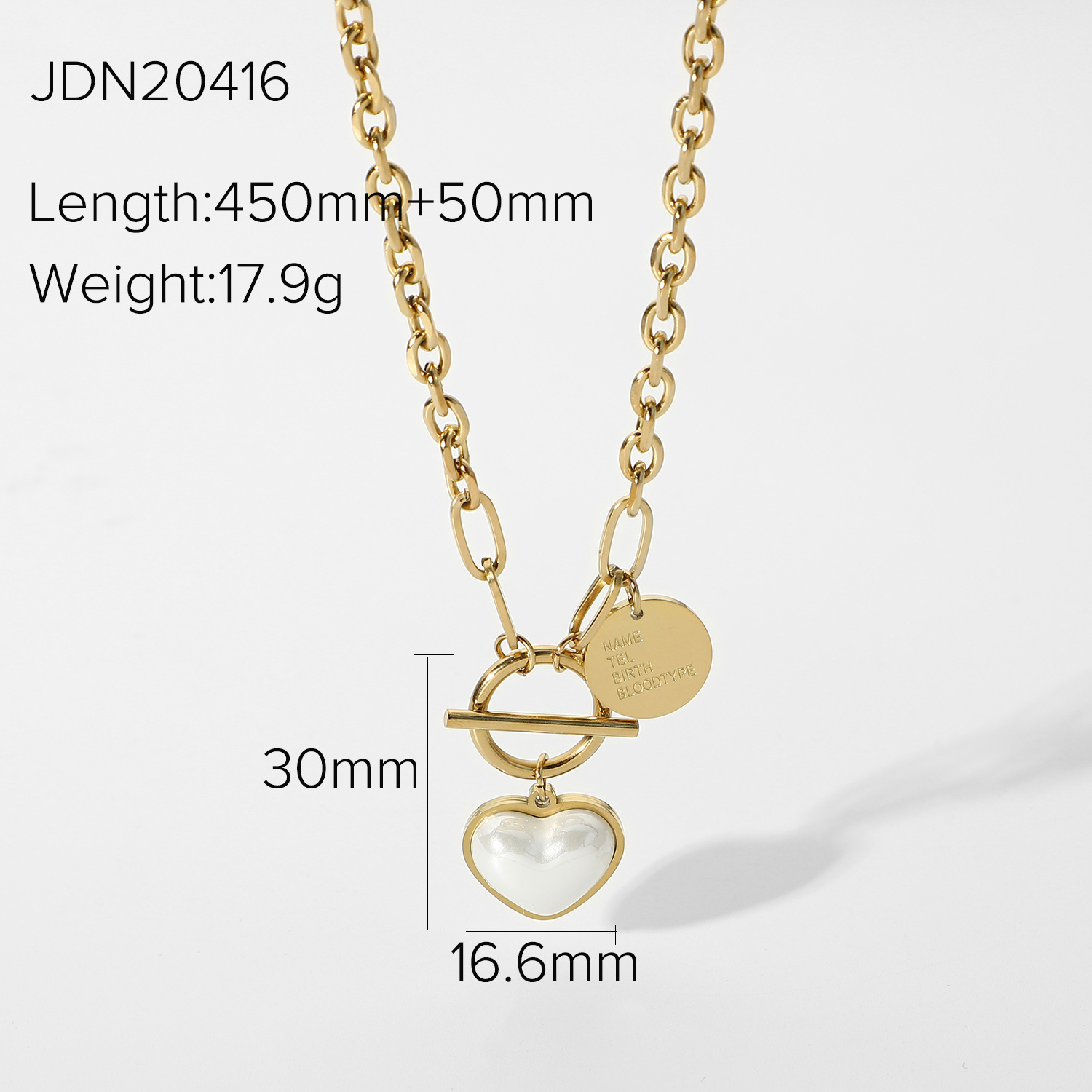 描述:风格:简约,材质:不锈钢,处理工艺:电镀,品牌:Youthway,生产编号:JDN20419,销售序列号:JDN20419,种类:项坠、吊坠,样式:女式,造型:14K不锈钢+贝珠,包装:独立包装,适用送礼场合:婚庆,旅游纪念,员工福利,加工定制:是,货号:JDN20419,产地:浙江义乌,链子样式:圆珠链,是否多层:是,是否带坠:是,延长链:10cm以下,坠子材质:钛钢,周长:21cm(含)-50cm(含),系列:不锈钢,形象:14K不锈钢+贝珠,主要下游平台:ebay,亚马逊,wish,速卖通,独立站,LAZADA,颜色:JDN20419,主要销售地区:非洲,欧洲,南美,东南亚,北美,东北亚,中东,有可授权的自有品牌:是,是否跨境出口专供货源:是,流行元素:金属,珍珠,复古,花卉,链条,几何,上市年份/季节:2021年夏季,