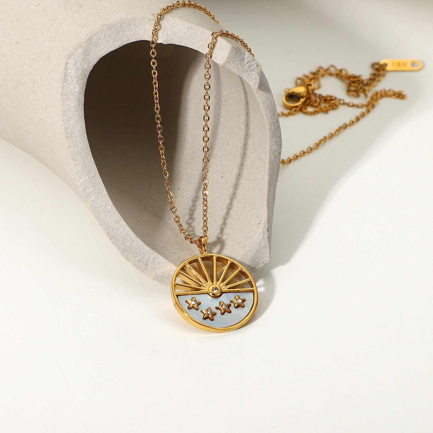 标题:18K镀金不锈钢白贝太阳月亮圆牌吊坠项链INS风星星镶锆石项饰女式