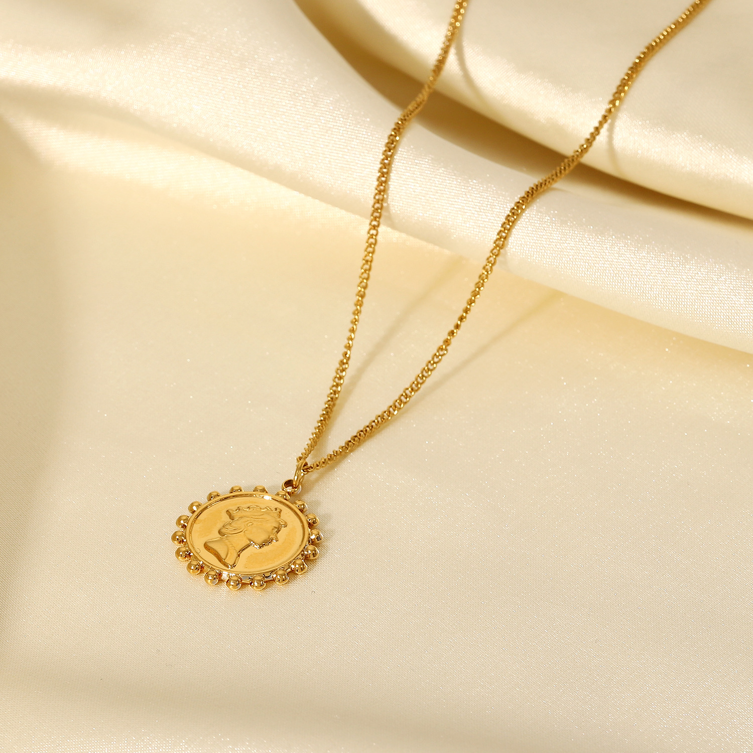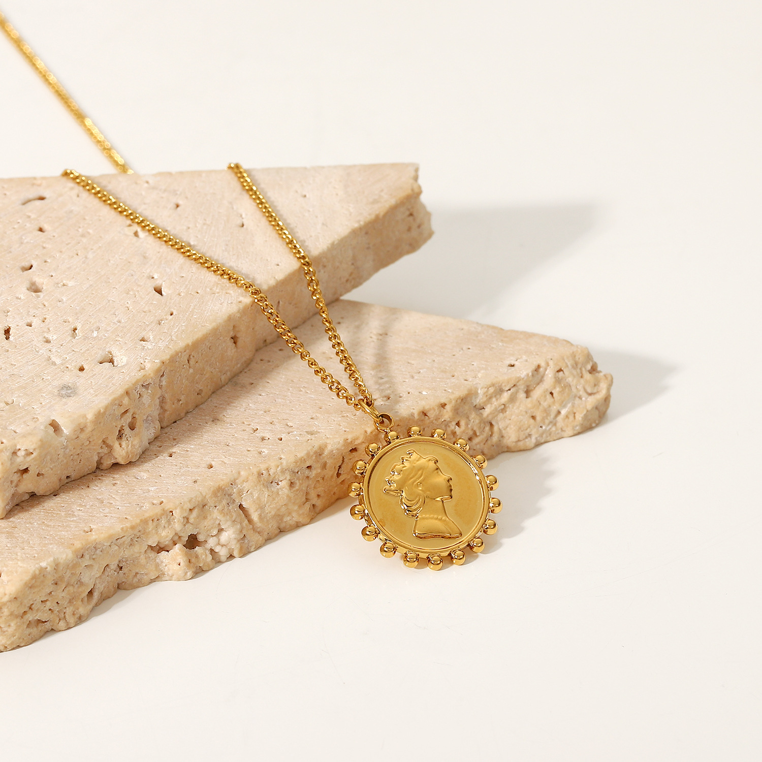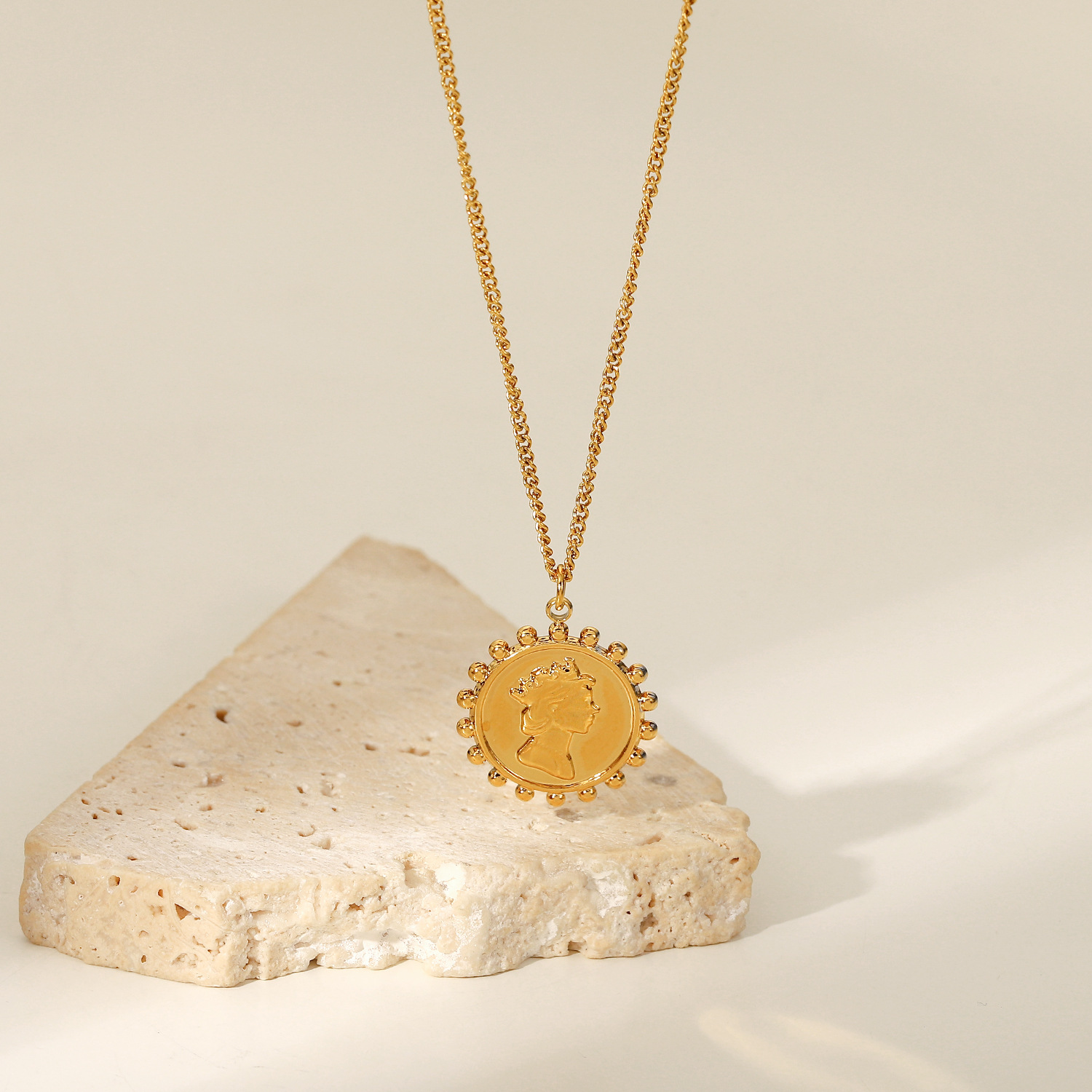 标题:新款伊丽莎白女王头像立体浮雕吊坠项链 18K金电镀不锈钢圆形项链