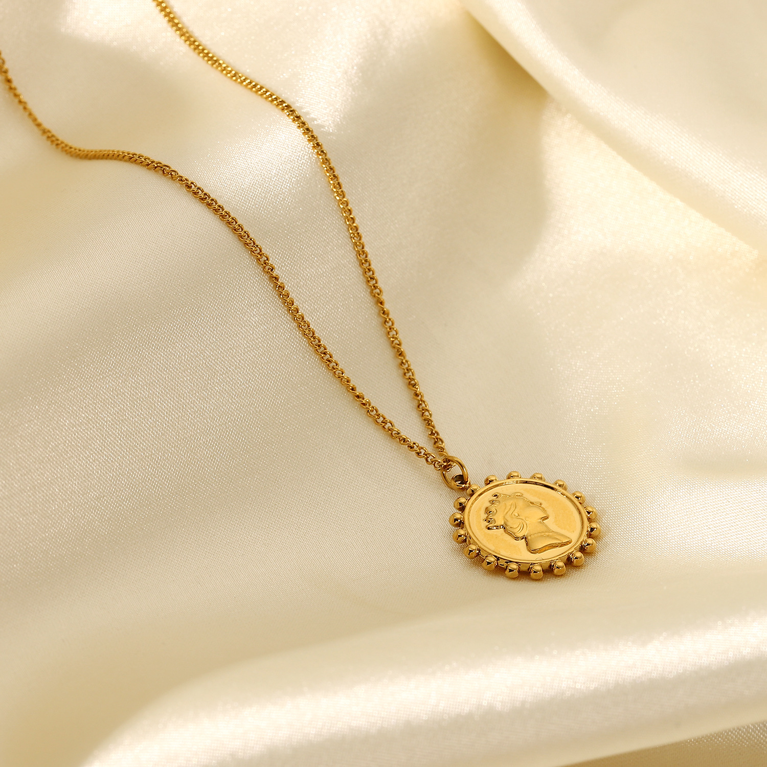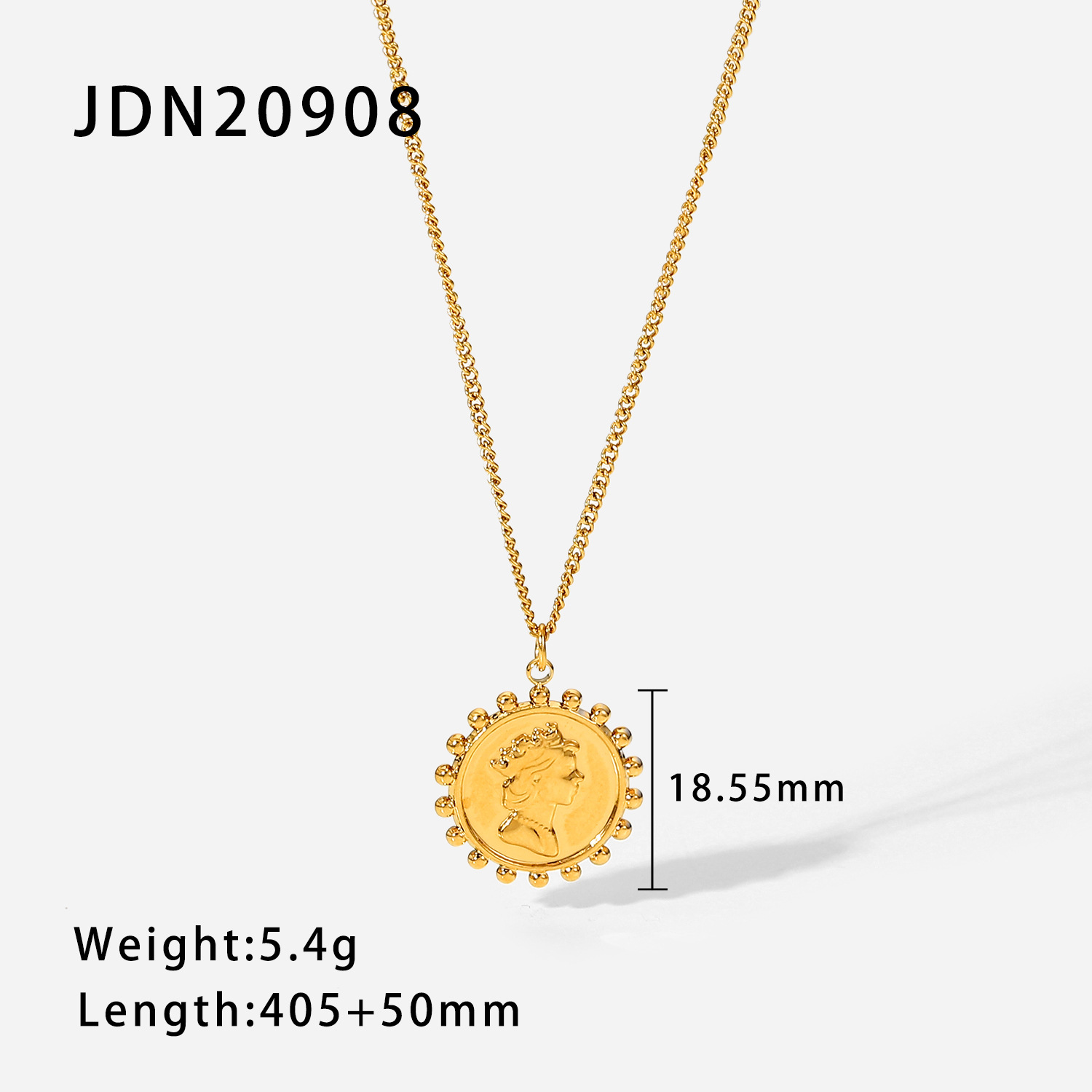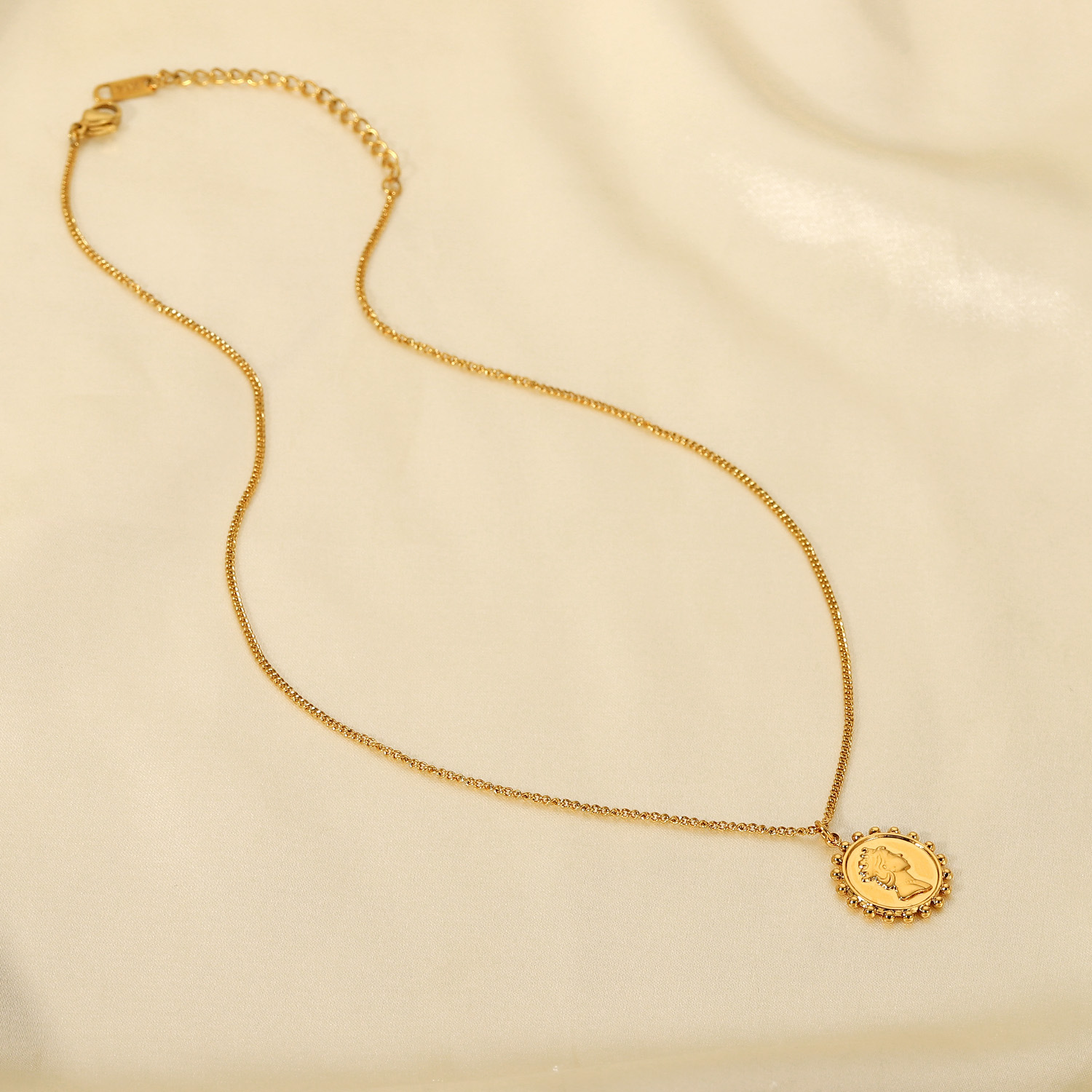 标题:新款伊丽莎白女王头像立体浮雕吊坠项链 18K金电镀不锈钢圆形项链
