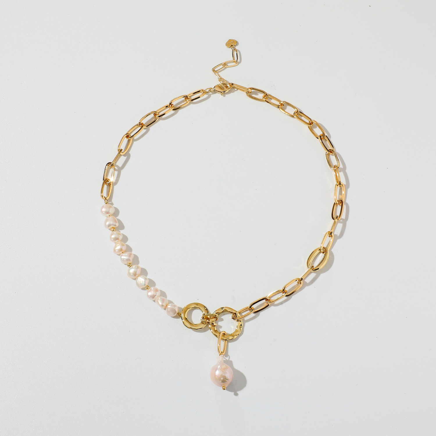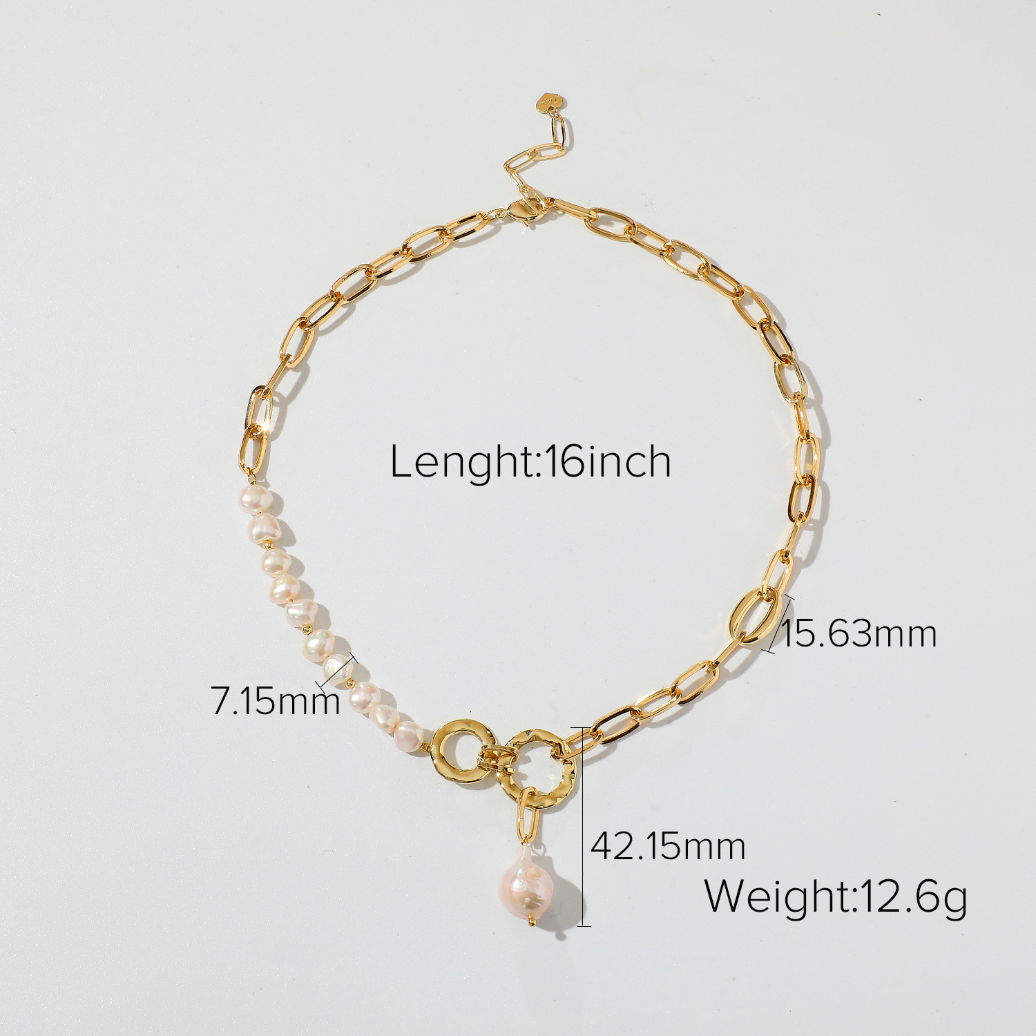标题:14K镀真金矩形链式链颈链配淡水珍珠项链女式新款时尚项链饰品