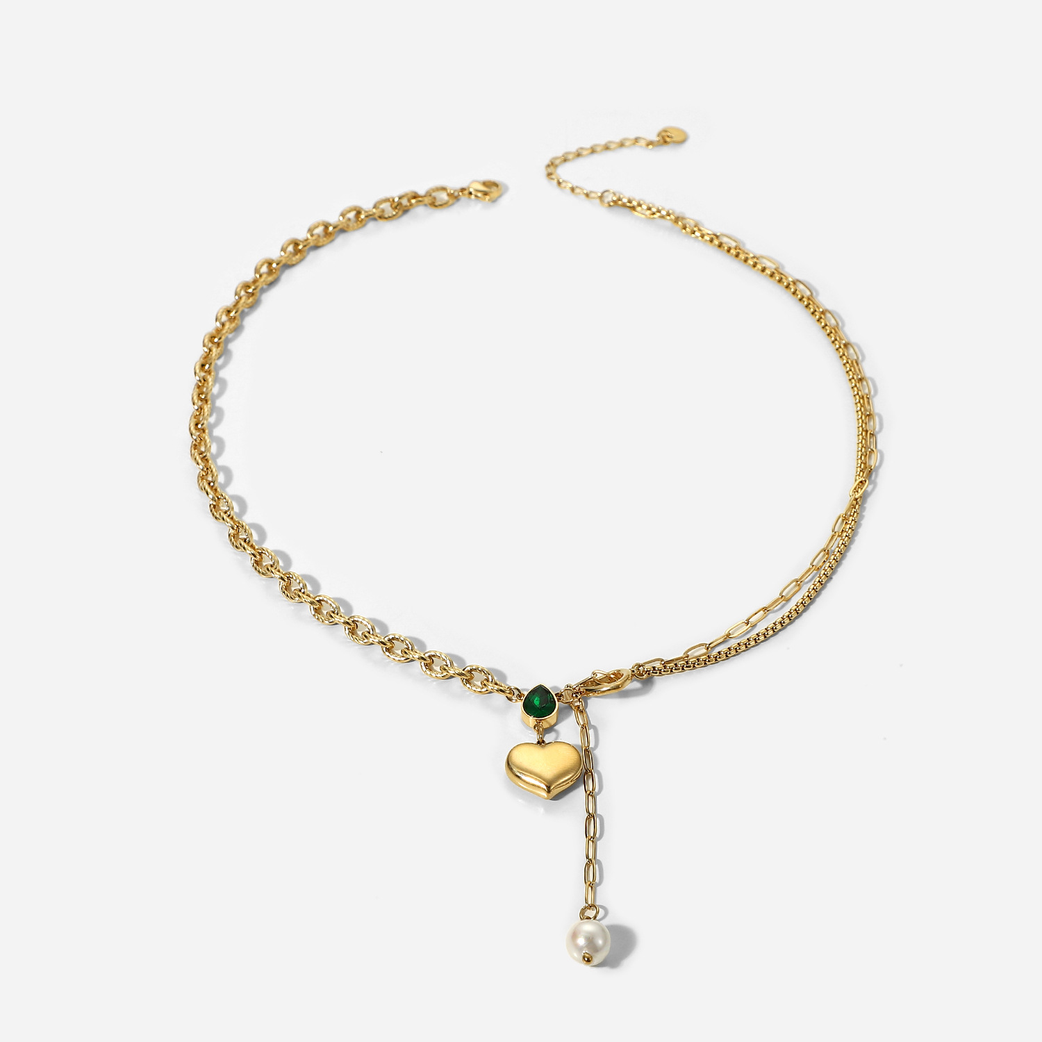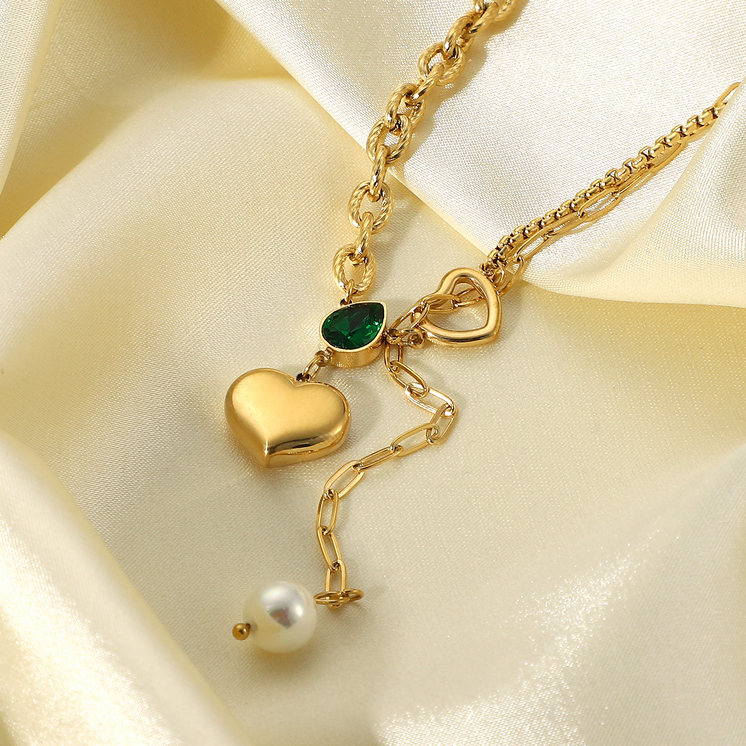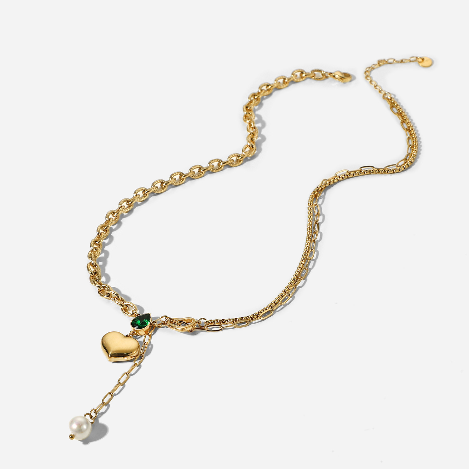 标题:欧美女式新款珍珠吊坠单链加心形吊坠绿色水滴锆石14K金拼接项链