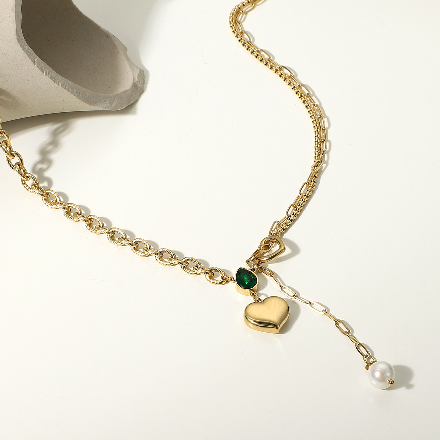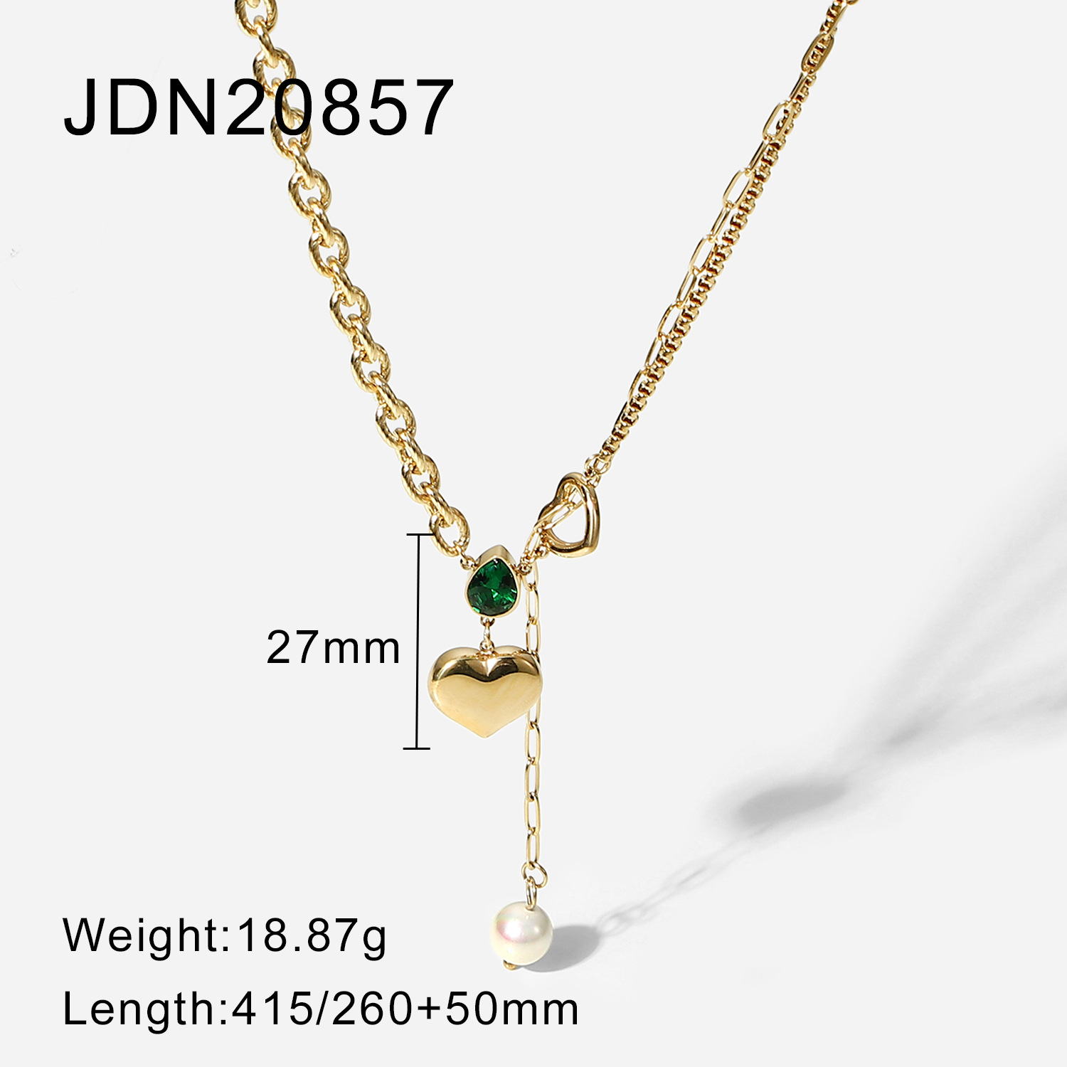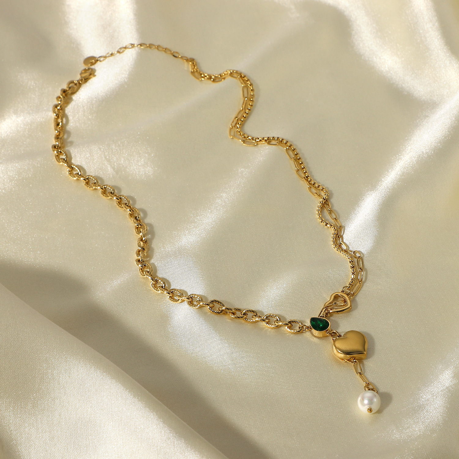 标题:欧美女式新款珍珠吊坠单链加心形吊坠绿色水滴锆石14K金拼接项链