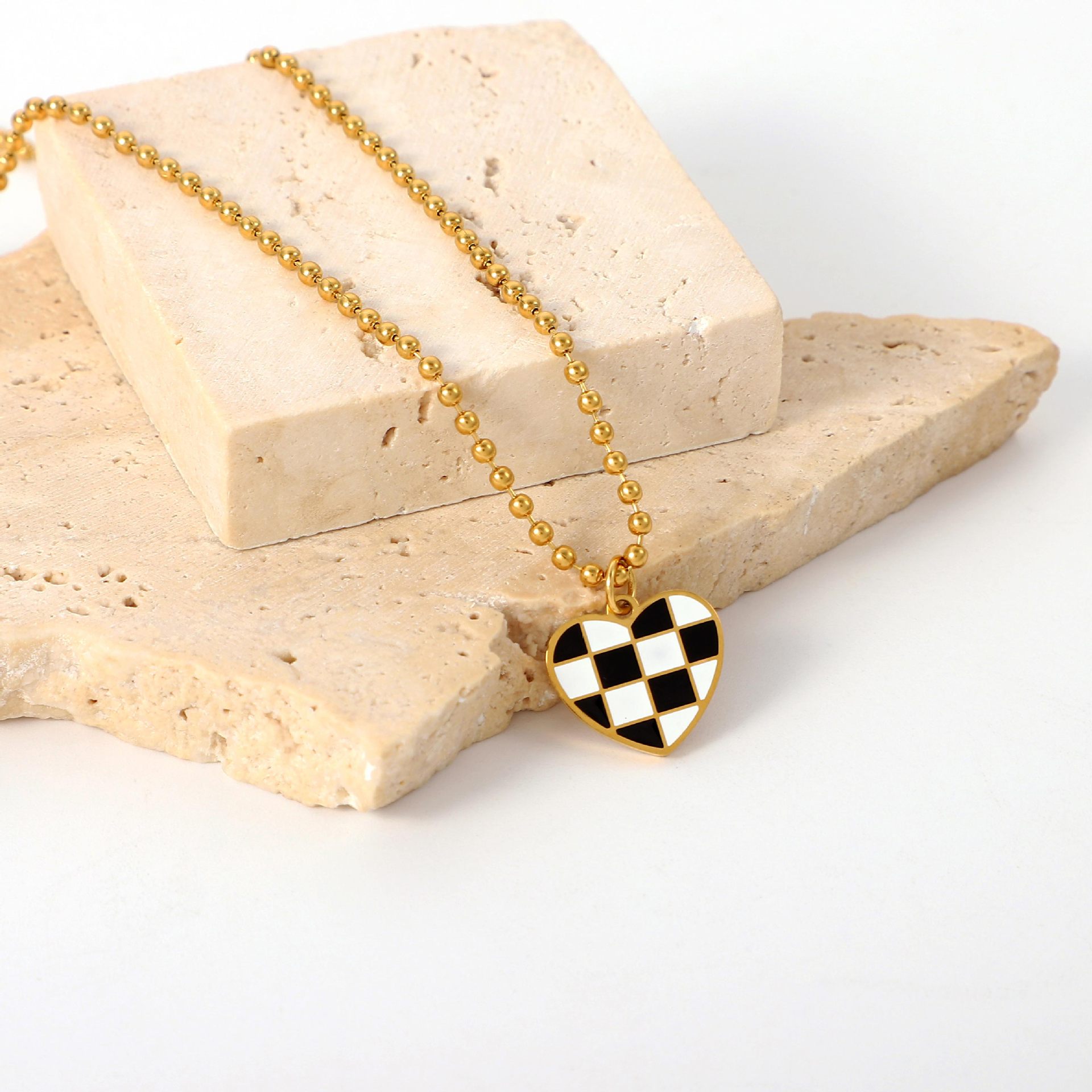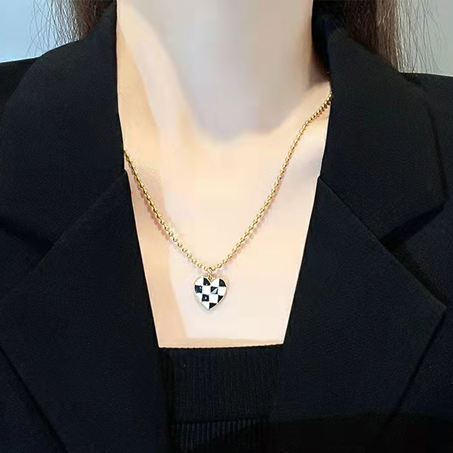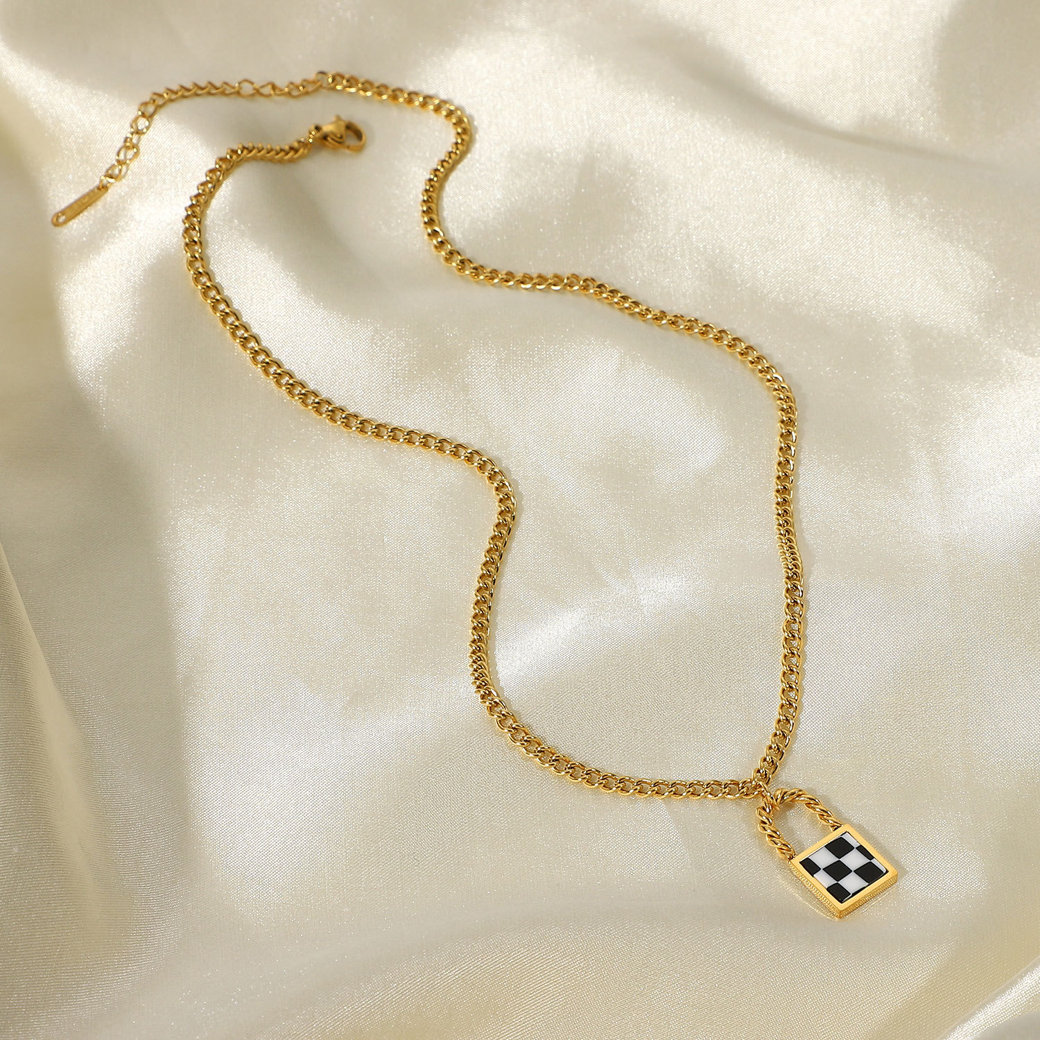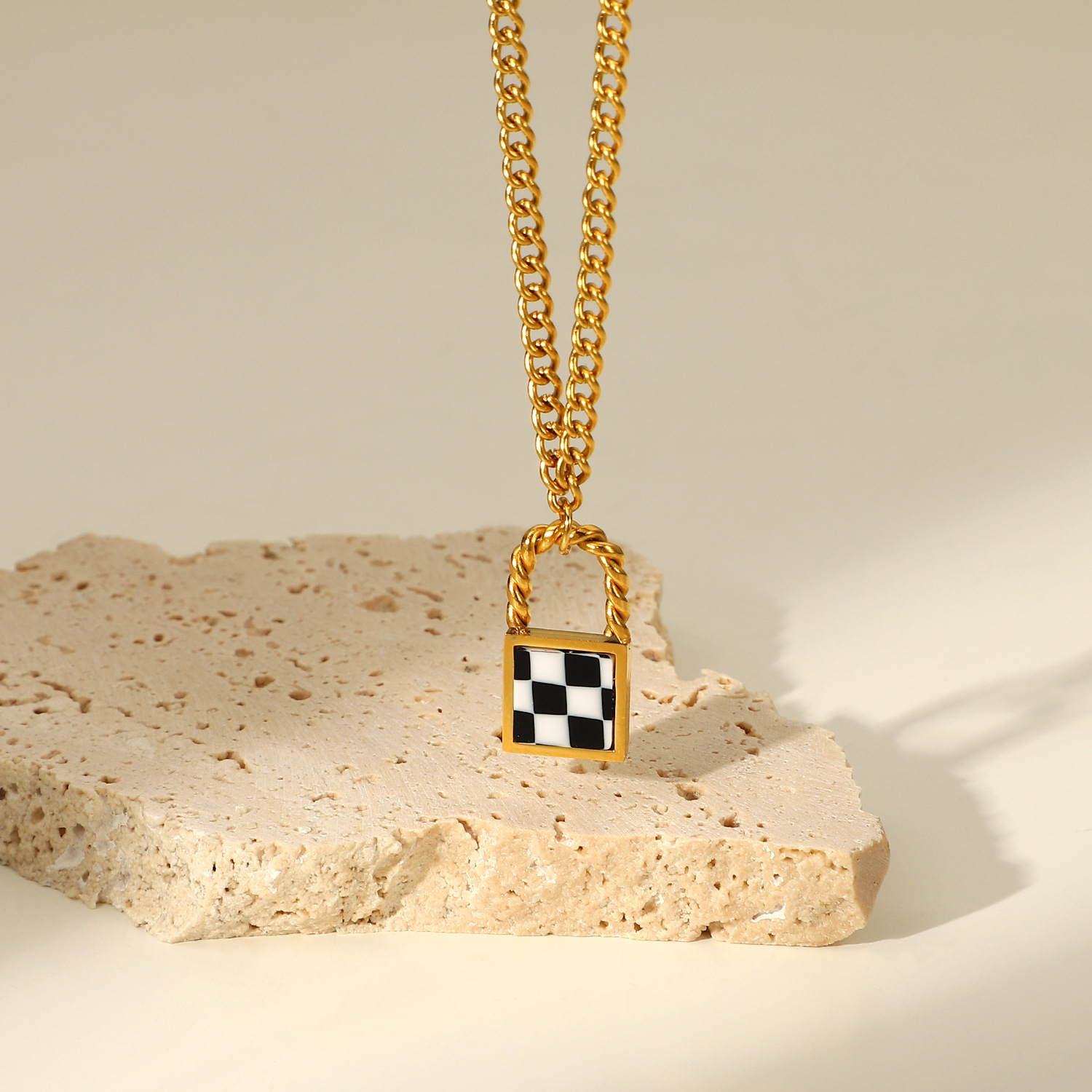 标题:欧美INS网红新款小圆珠项链18K金经典棋盘格爱心/锁/方形吊坠项链