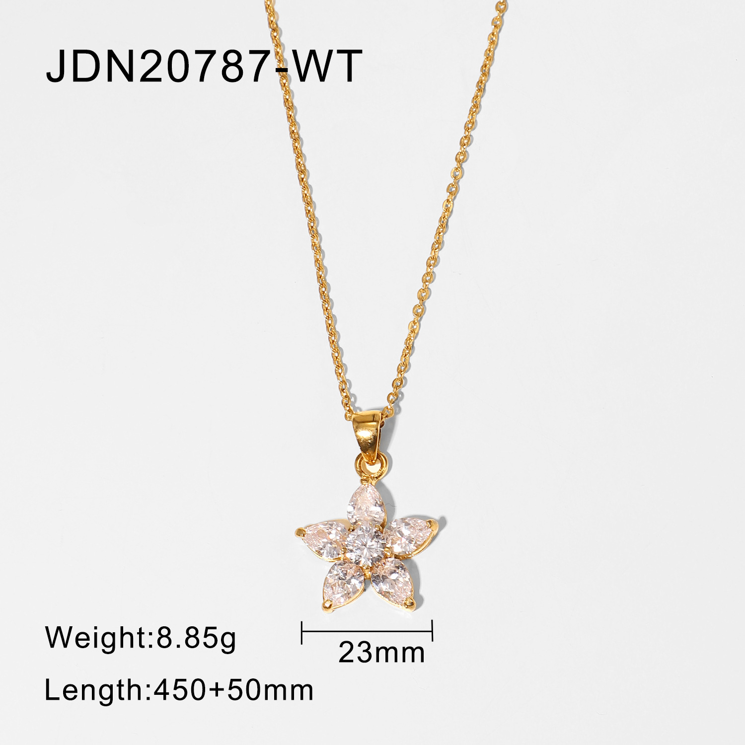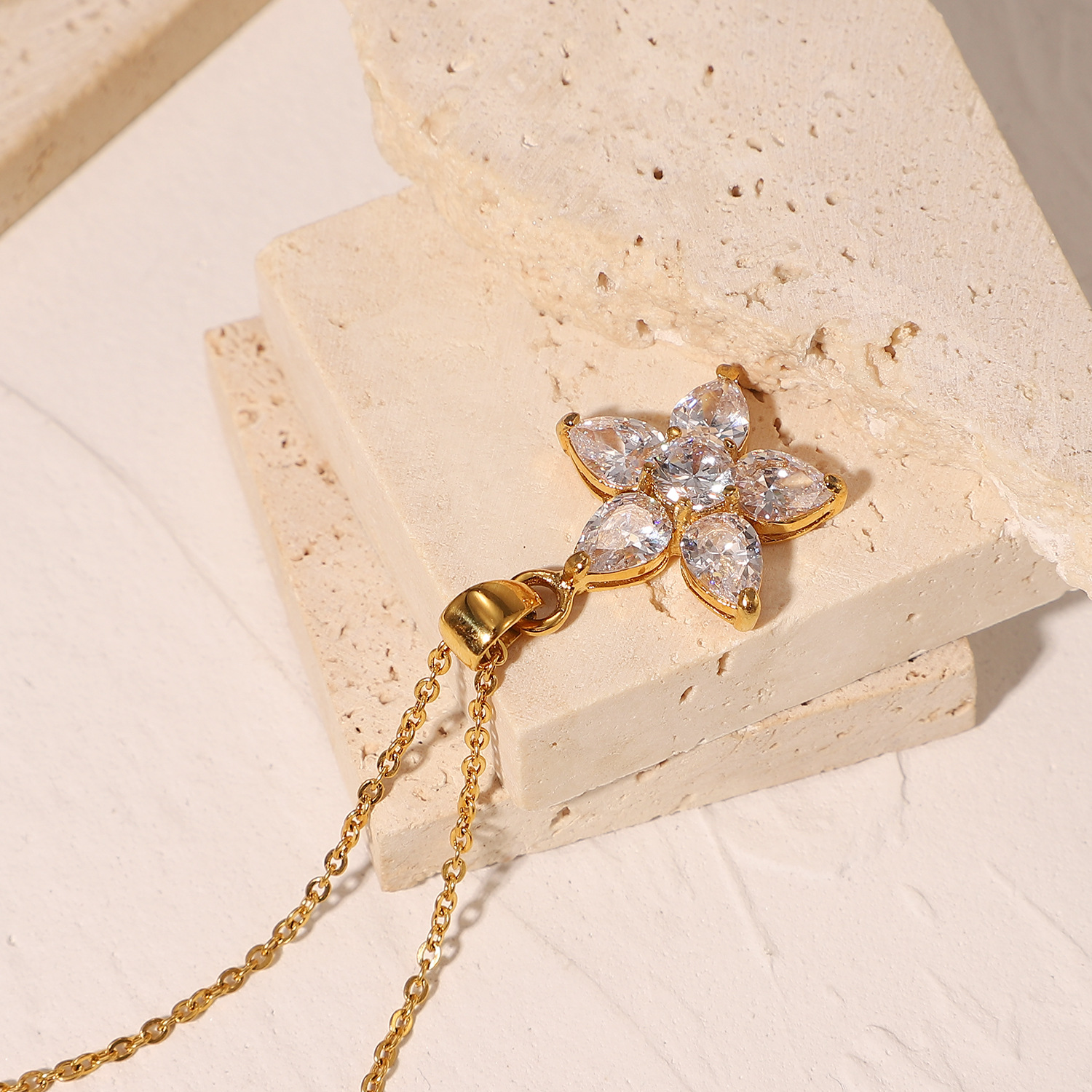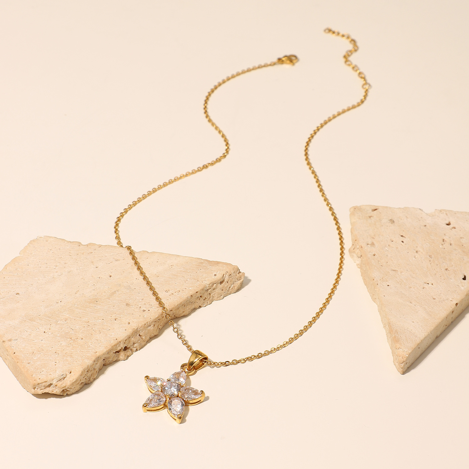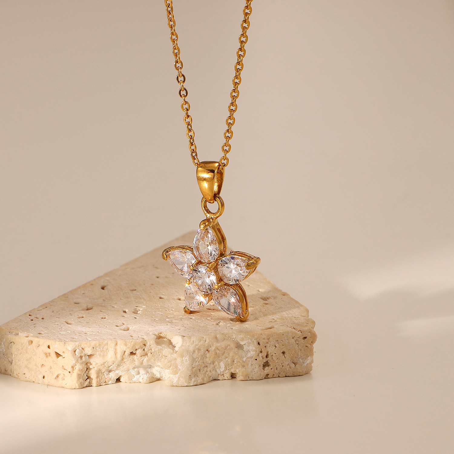 标题:跨境爆款欧美ins精美项链18K金不锈钢22mm白色锆石五瓣花吊坠项链