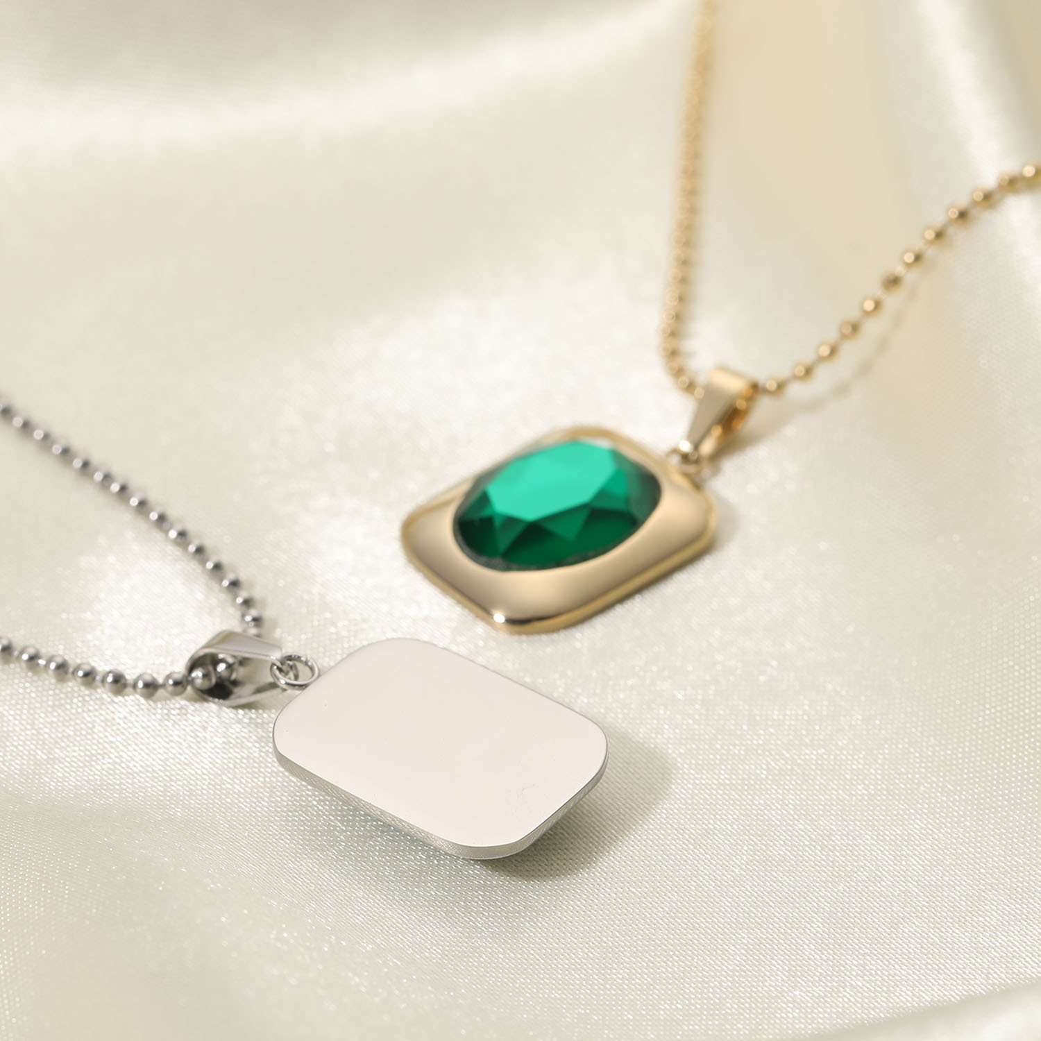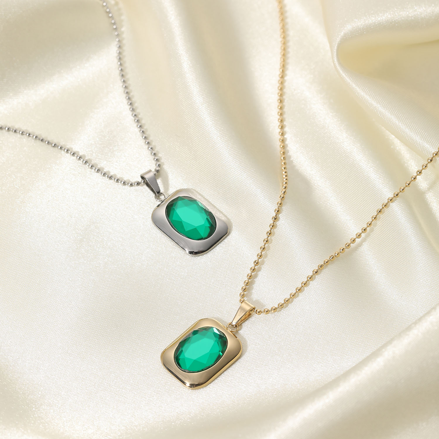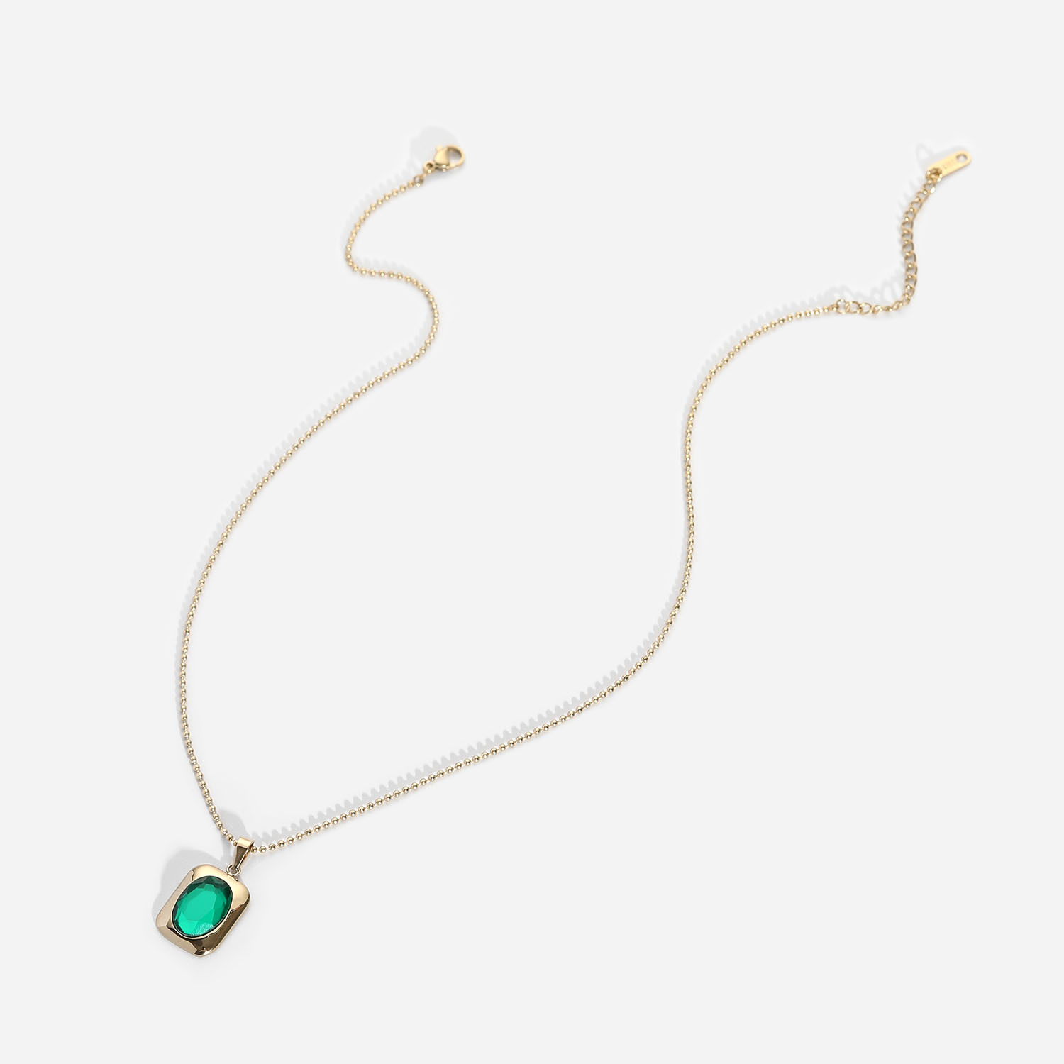 标题:欧美INS风金属质感项链14K金色绿宝石方形吊坠圆珠项链简约百搭女