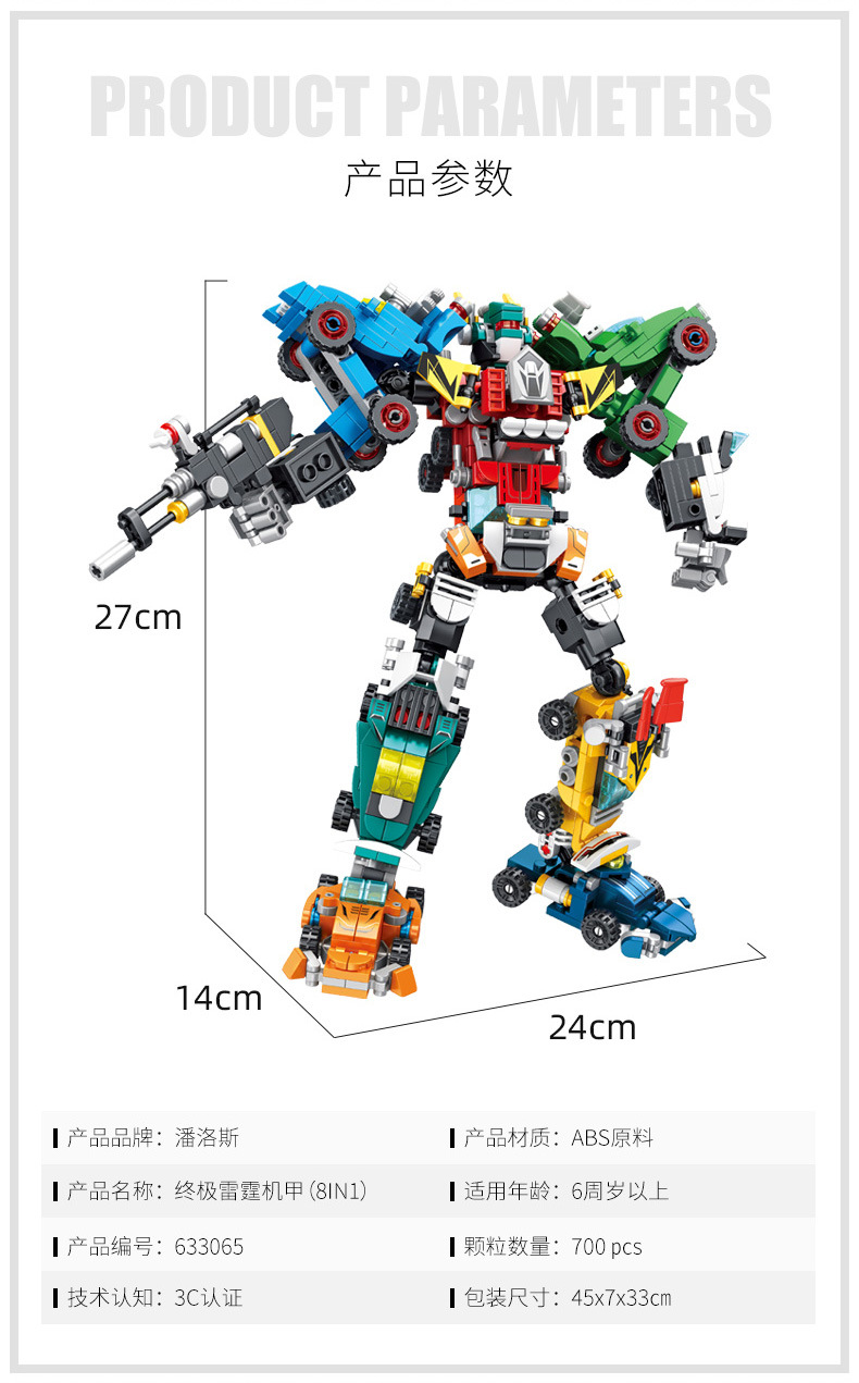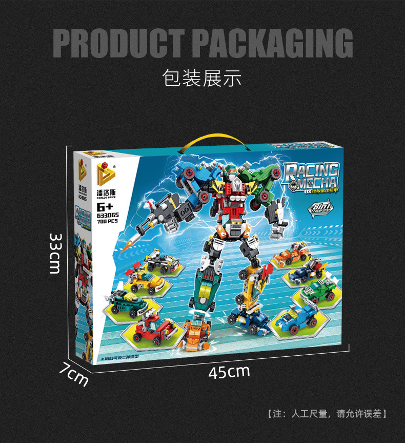 描述:3C配置类别:14岁以下的塑胶玩具,材质:塑料/塑胶,品牌:PANLOS BRICK/潘洛斯,货号:633065,产地:汕头,规格:45*33*7cm,是否电动:否,是否多功能:否,是否能够DIY:是,包装方式:彩盒,加工定制:否,是否外贸:否,塑料材质分类:ABS,塑料积木类型:小颗粒,积木粒(片)数:400-800粒(片),积木净重:1.5,是否有动漫形象:否,是否有导购视频:否,多米诺类型:标准多米诺,是否专供外贸:否,商品3C认证码:2018152203021563,颜色:雷霆赛车机甲633065,主要下游平台:ebay,亚马逊,wish,速卖通,独立站,LAZADA,主要销售地区:非洲,欧洲,南美,东南亚,北美,东北亚,中东,有可授权的自有品牌:是,是否跨境出口专供货源:是,适用年龄:少年(7-14岁),