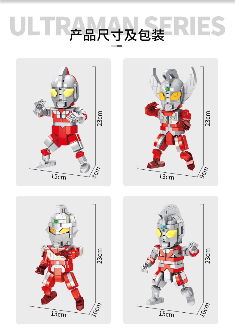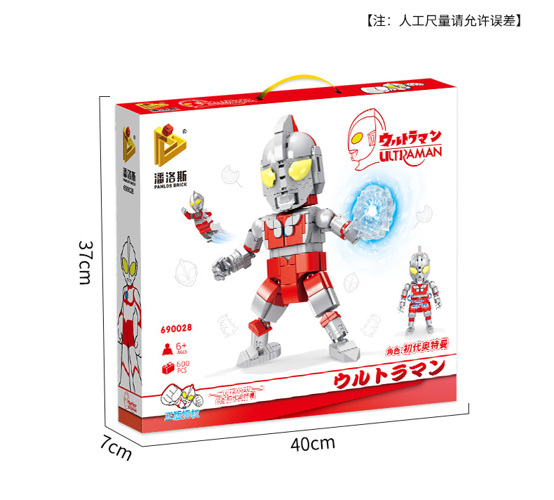 描述:3C配置类别:14岁以下的塑胶玩具,材质:塑料/塑胶,品牌:PANLOS BRICK/潘洛斯,货号:690028-31,产地:汕头,规格:40*7*37 CM,是否电动:否,是否多功能:否,是否能够DIY:否,包装方式:彩盒,加工定制:否,是否外贸:否,塑料材质分类:ABS,塑料积木类型:小颗粒,积木粒(片)数:400-800粒(片),积木净重:0.85KG,是否有动漫形象:否,是否有导购视频:否,多米诺类型:标准多米诺,是否专供外贸:否,商品3C认证码:2018152203021563,颜色:初代奥特曼大公仔690028,泰罗奥特曼大公仔690029,泰文奥特曼大公仔690030,艾斯奥特曼大公仔690031,主要下游平台:ebay,亚马逊,wish,速卖通,独立站,LAZADA,主要销售地区:非洲,欧洲,南美,东南亚,北美,东北亚,中东,有可授权的自有品牌:是,是否跨境出口专供货源:是,适用年龄:少年(7-14岁),
