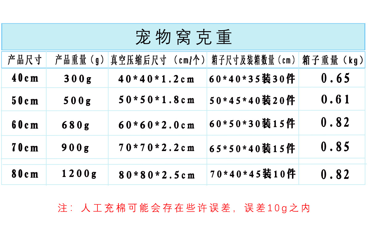 描述:材质:长毛绒,产地:浙江,是否进口:否,产品类别:宠物窝,货号:宠物窝,品牌:妙犬,是否专利货源:否,颜色:浅灰色,深灰色,皮粉色,咖啡色,牛油果绿,杏色,规格:直径 40CM,直径50CM,直径60CM,直径 70CM,直径80CM,主要下游平台:ebay,亚马逊,wish,速卖通,独立站,LAZADA,主要销售地区:非洲,欧洲,南美,东南亚,北美,东北亚,中东,有可授权的自有品牌:否,是否跨境出口专供货源:是,是否属于礼品:否,是否IP授权:否,