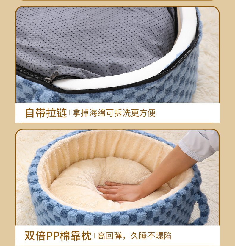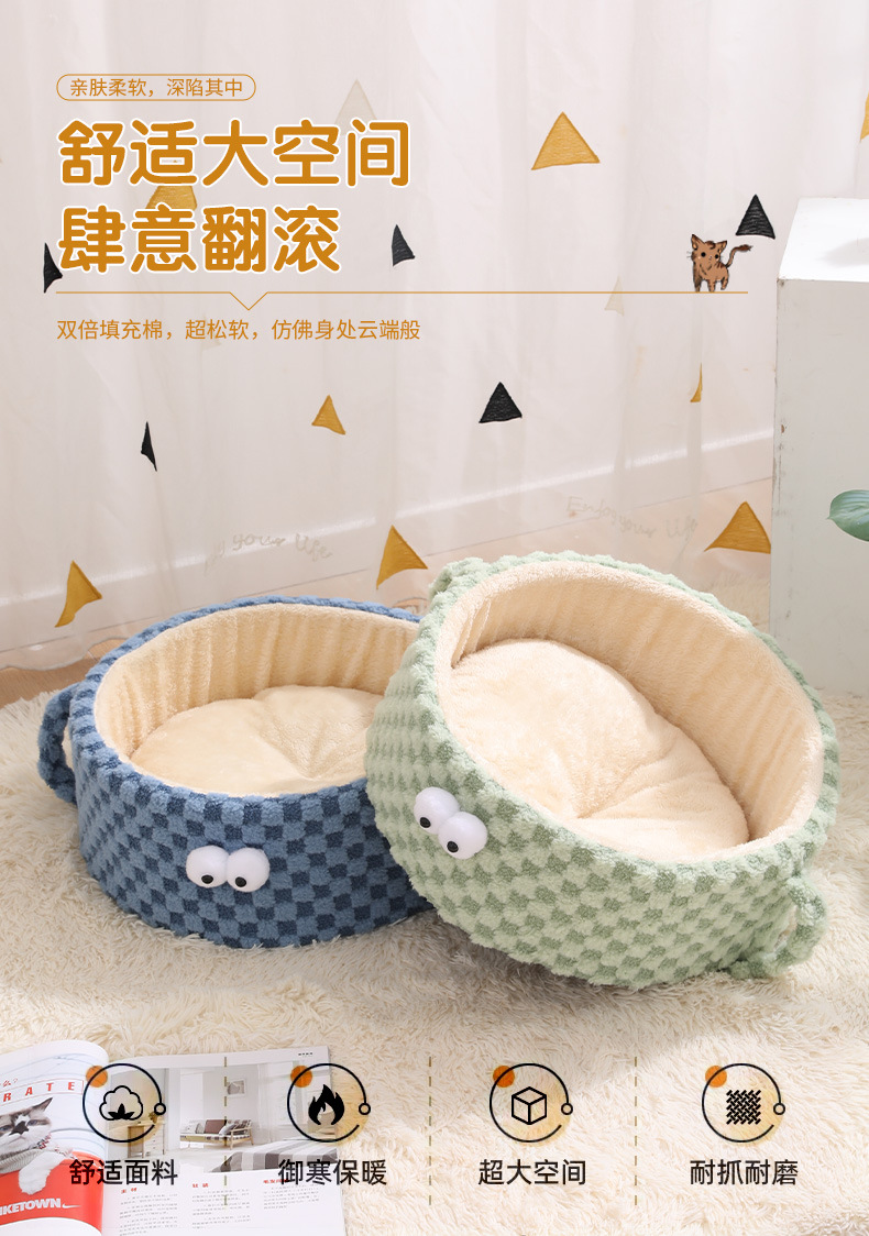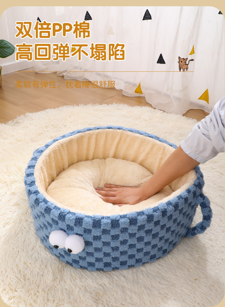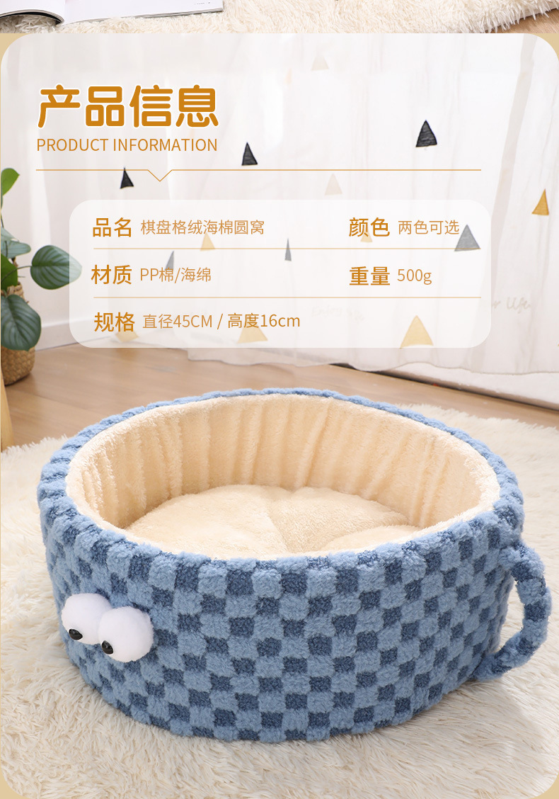 标题:新款可拆洗大眼仔棋盘格绒海棉圆窝猫咪狗窝狗垫子冬季保暖宠物窝