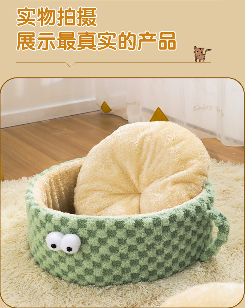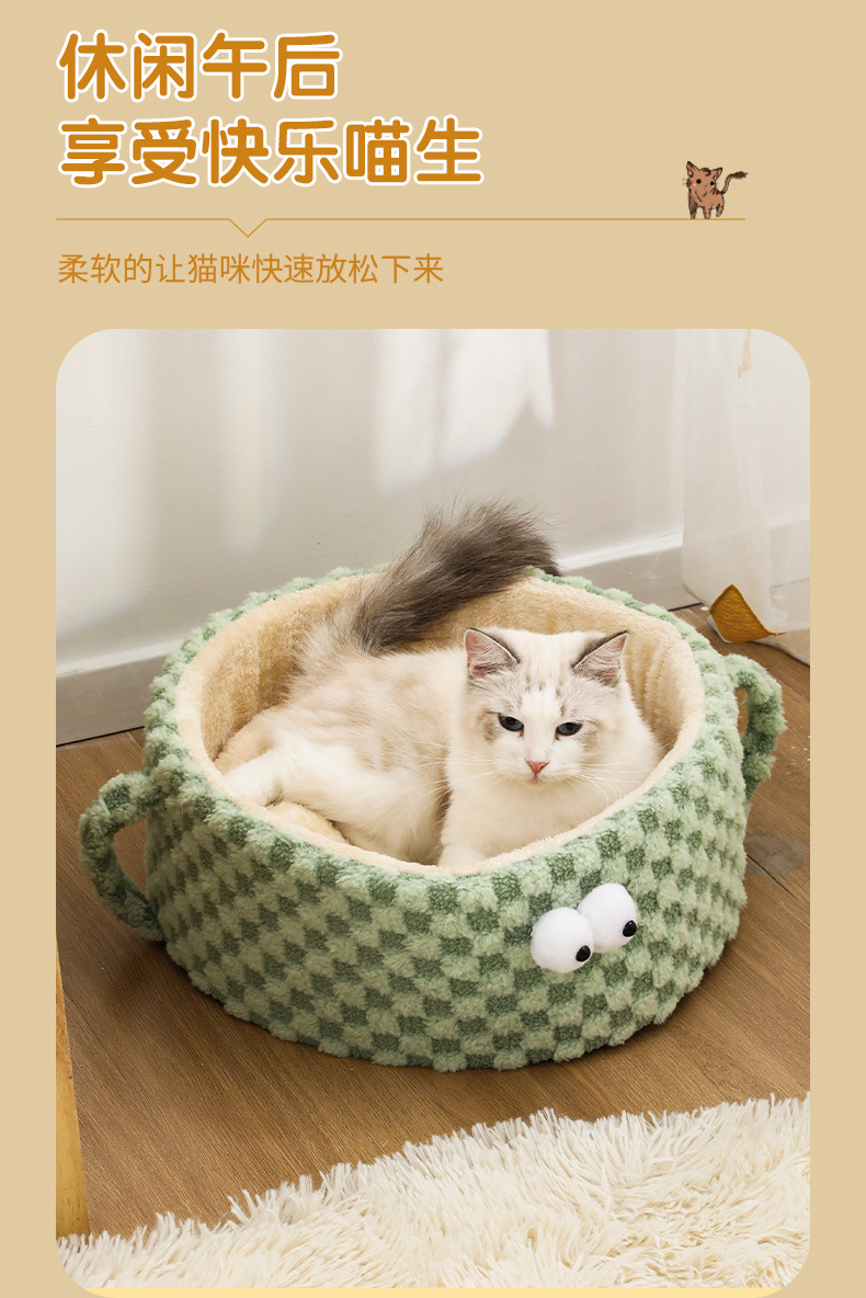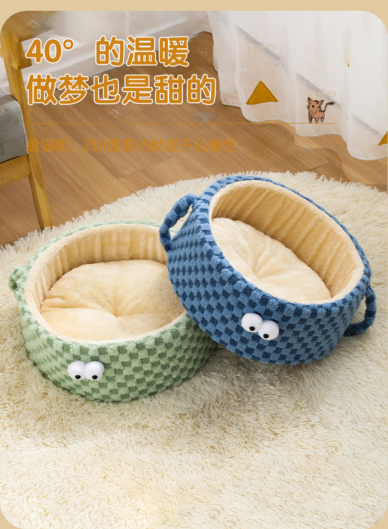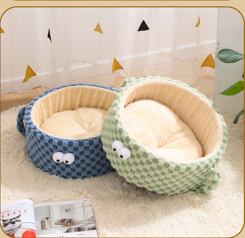 标题:新款可拆洗大眼仔棋盘格绒海棉圆窝猫咪狗窝狗垫子冬季保暖宠物窝