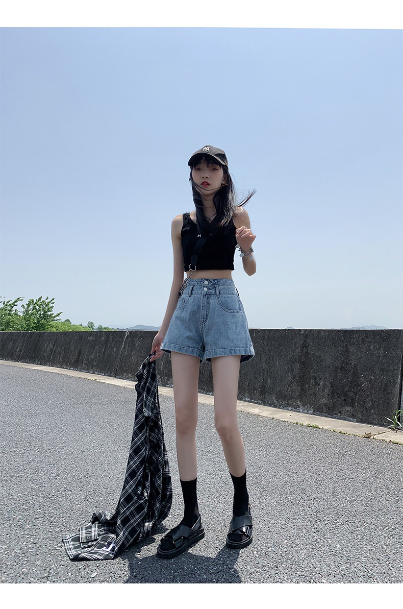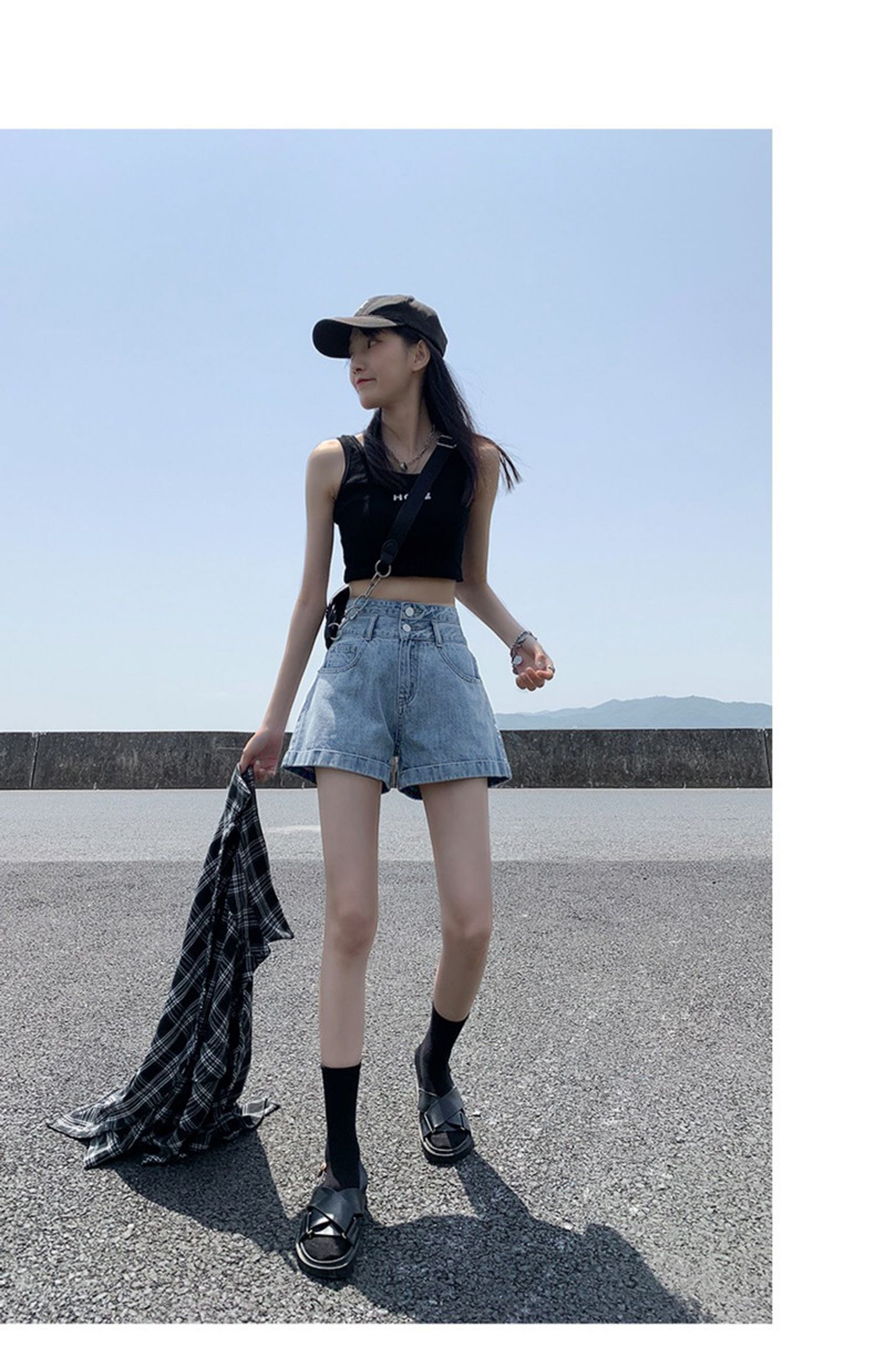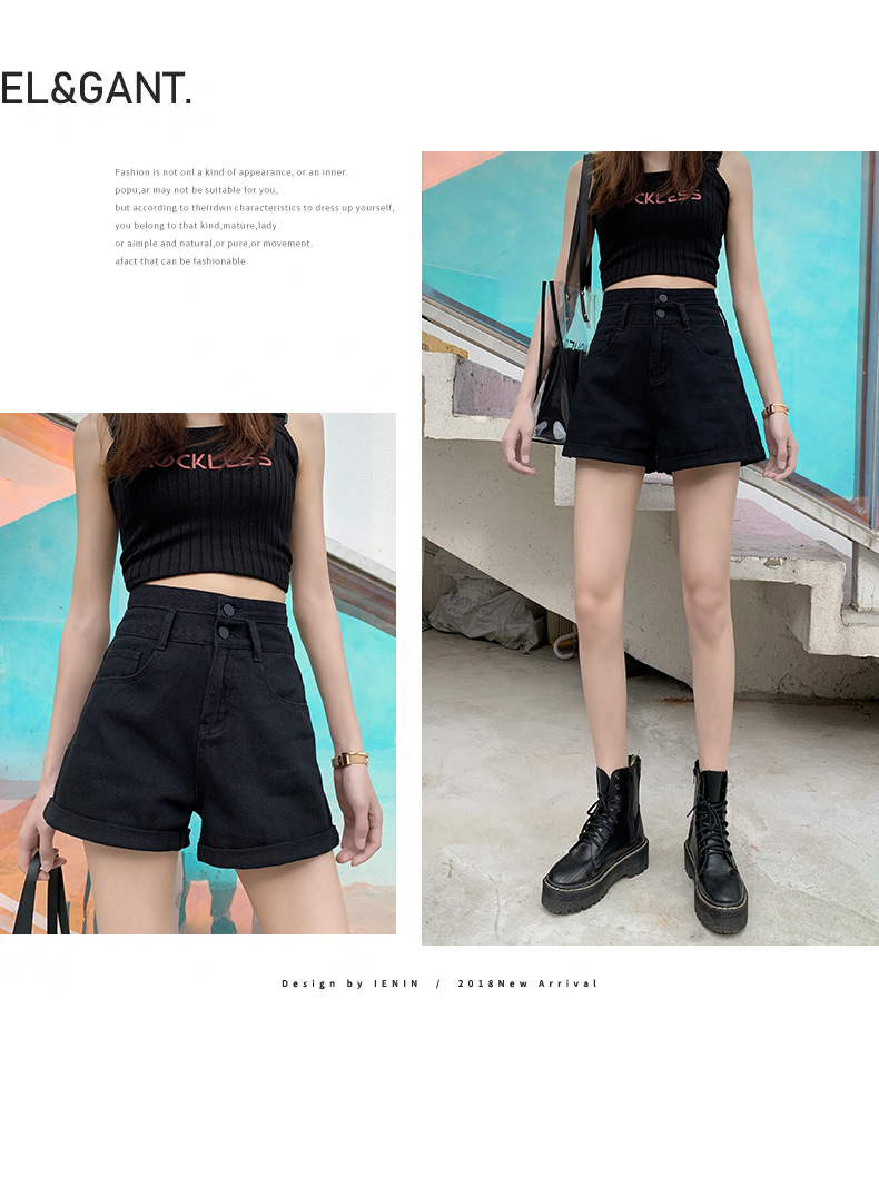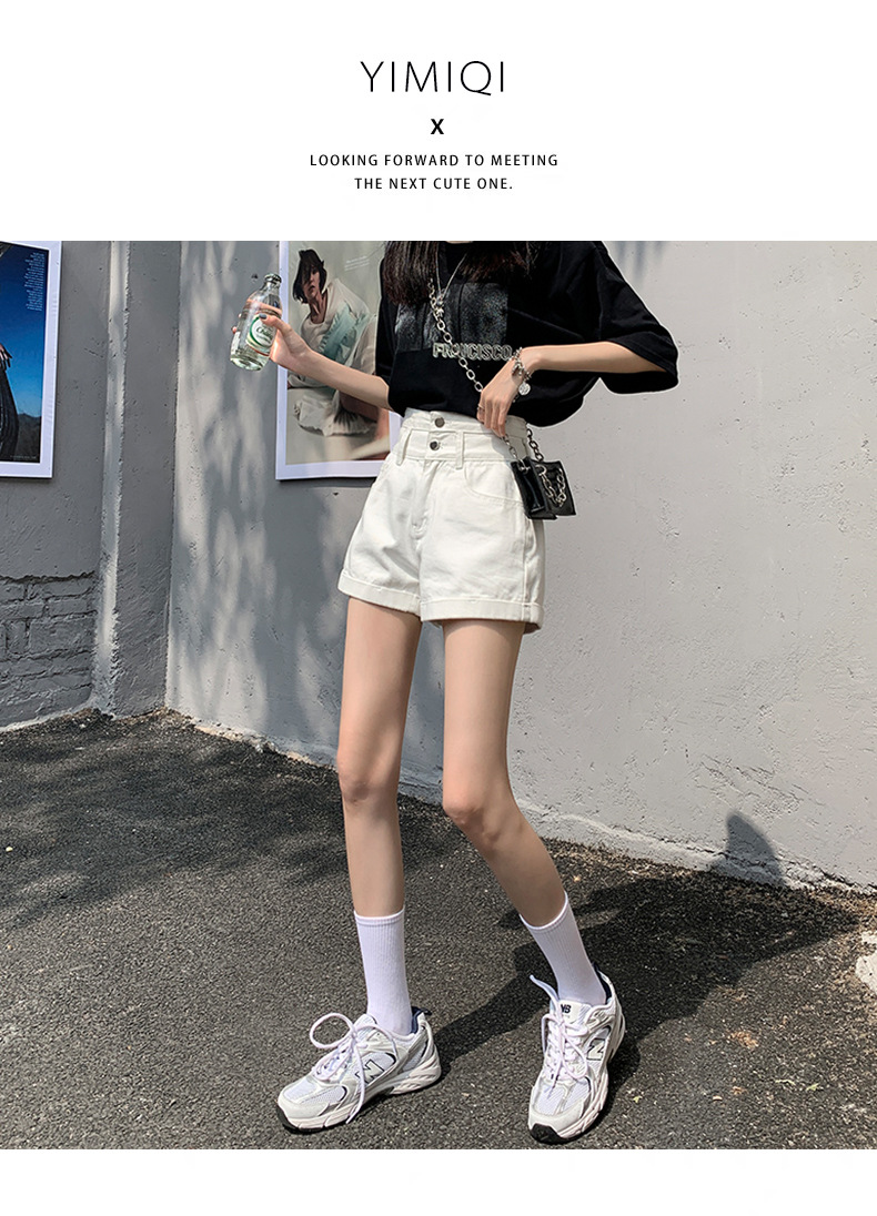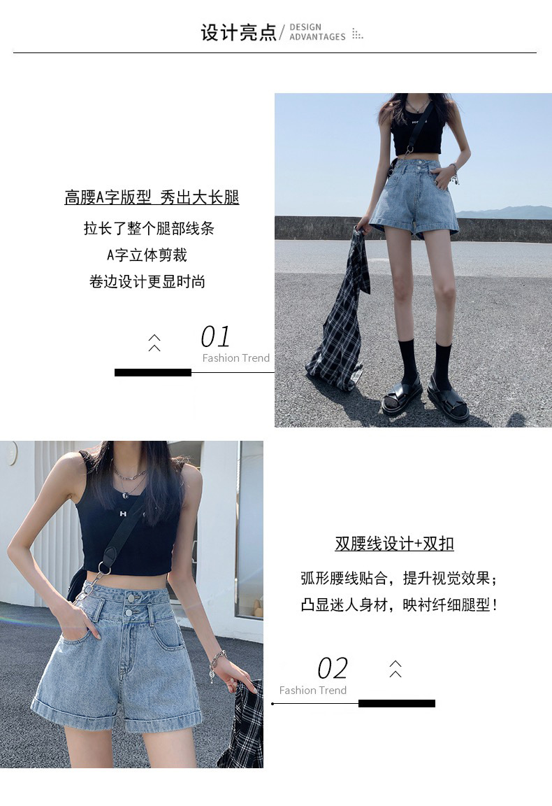 标题:超高腰牛仔短裤女夏季薄款ins显瘦双扣小个子a字直筒卷边阔腿热裤