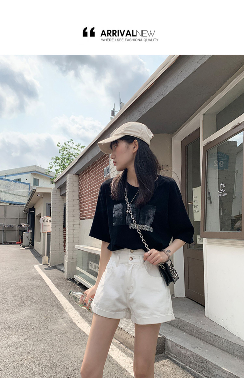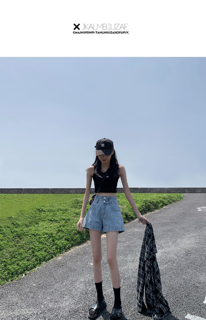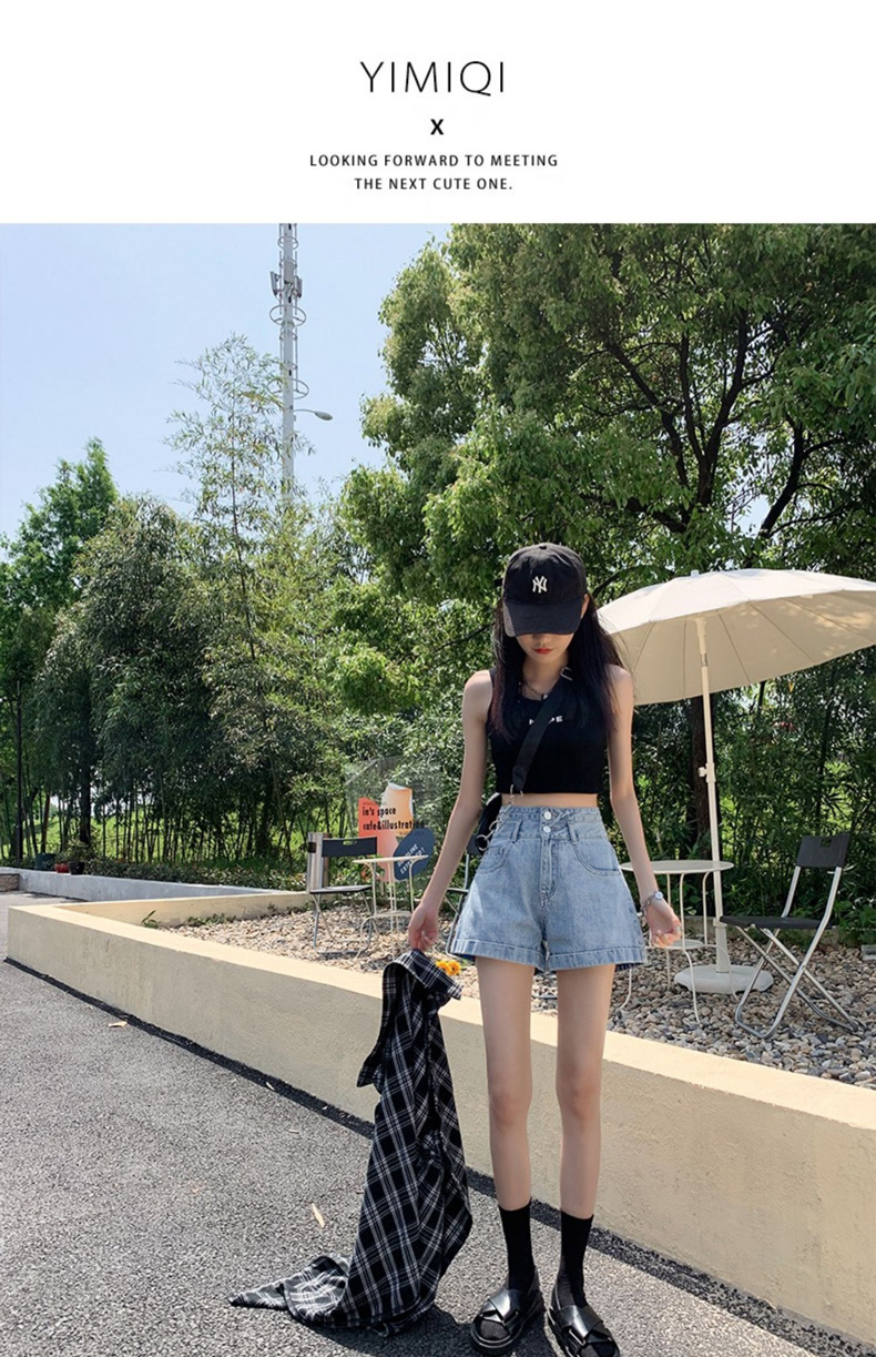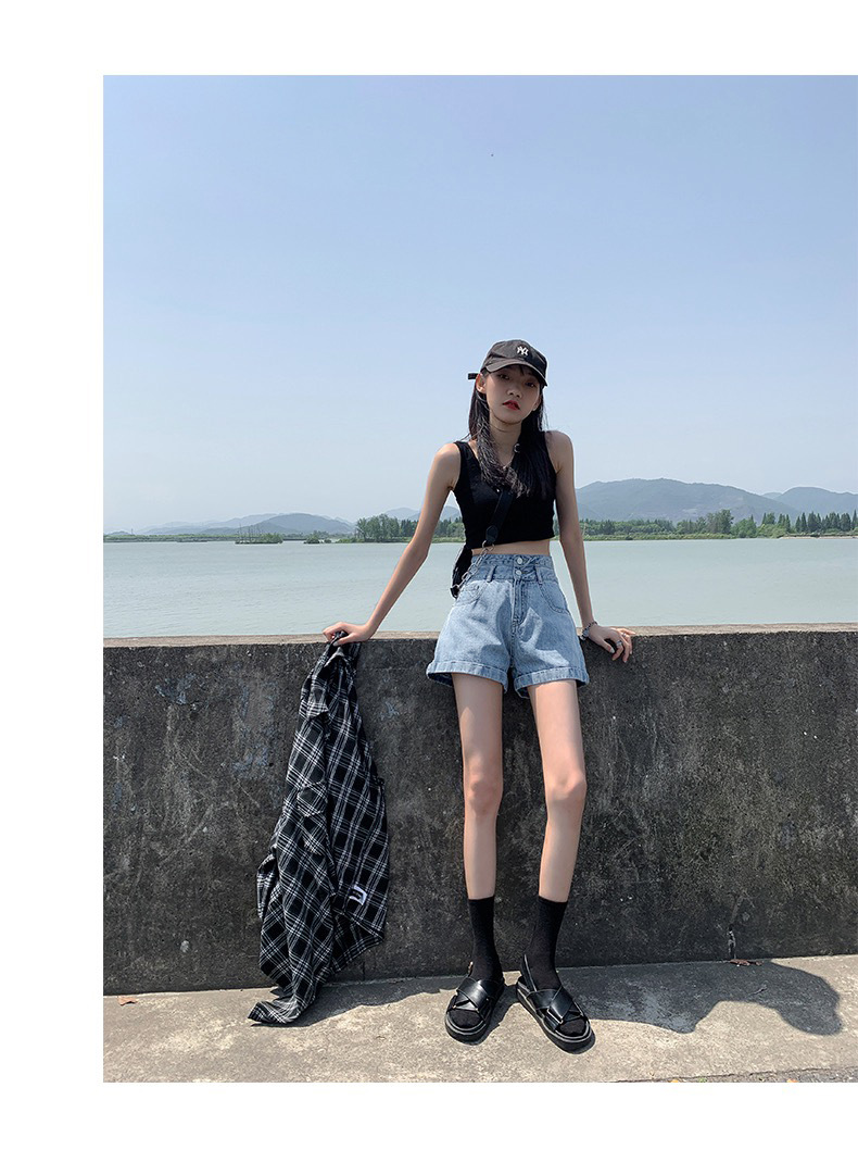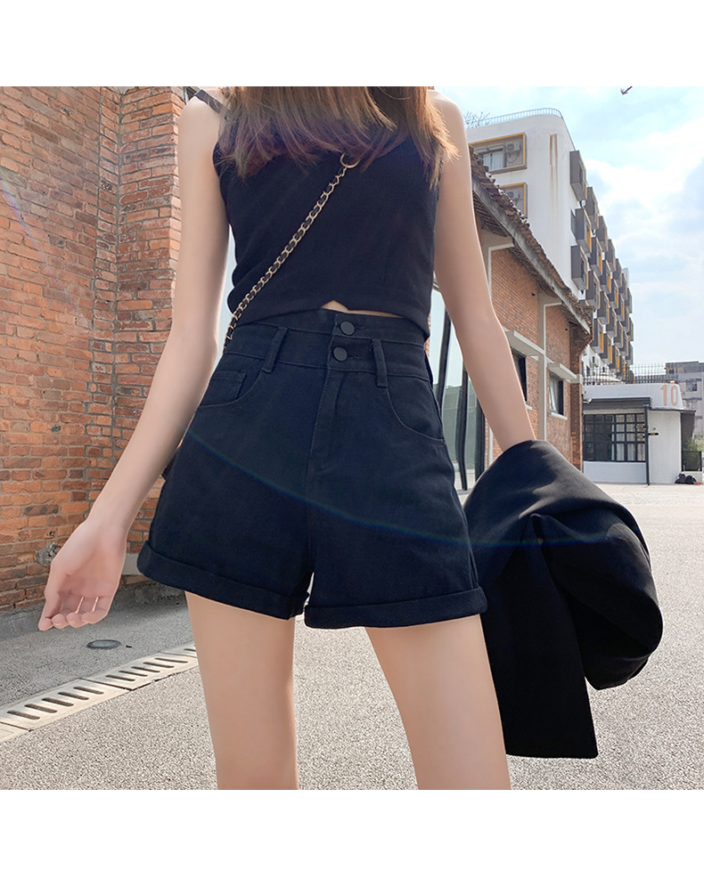 标题:超高腰牛仔短裤女夏季薄款ins显瘦双扣小个子a字直筒卷边阔腿热裤