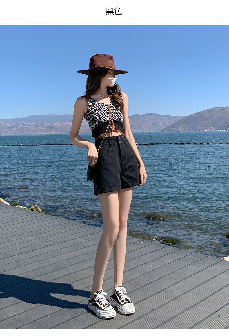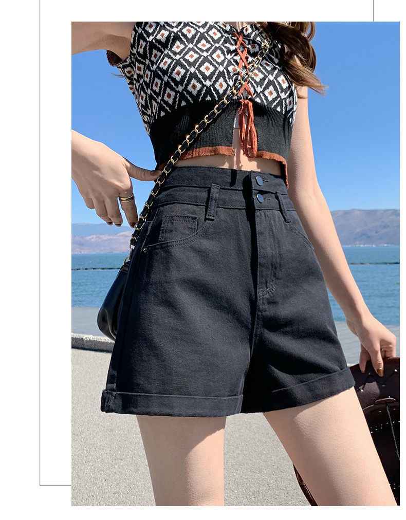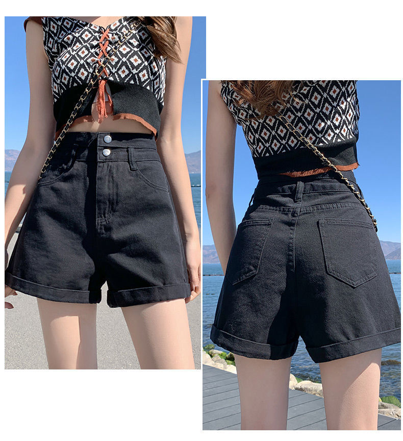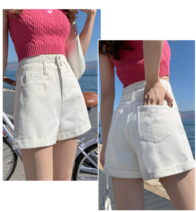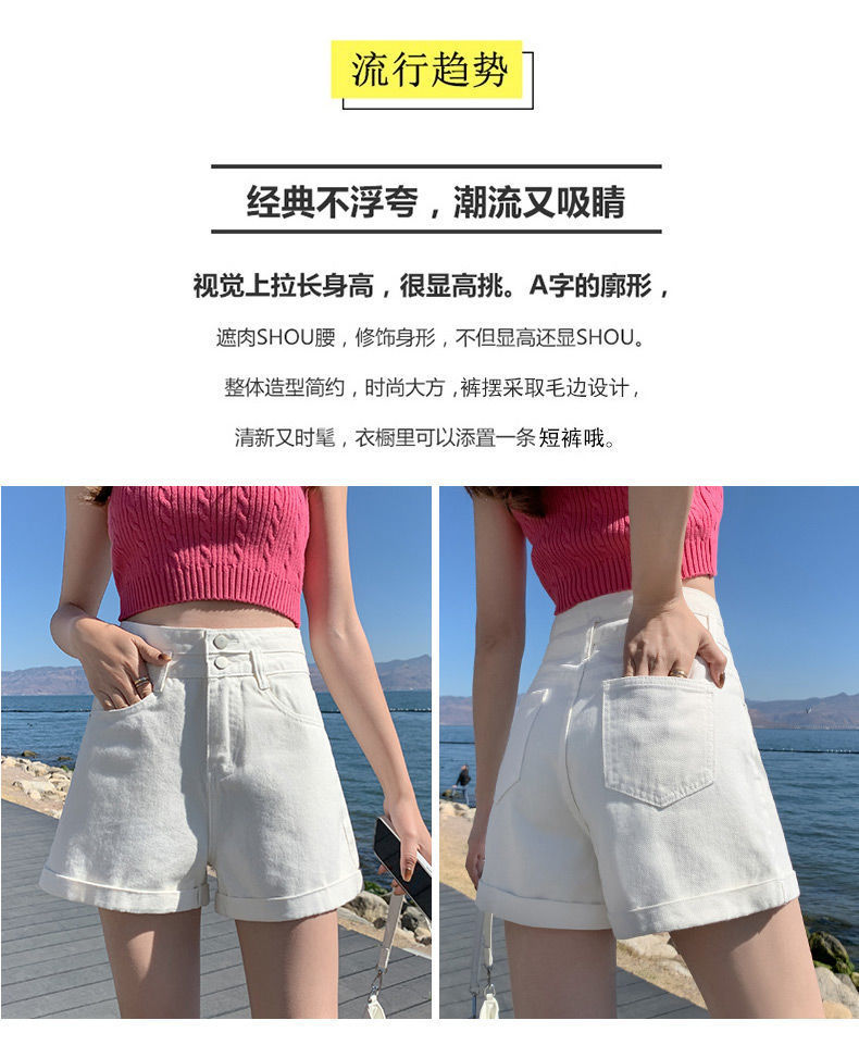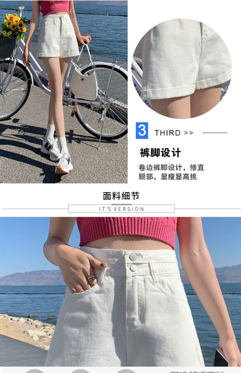 描述:货号:508,面料名称:全棉牛仔布,主面料成分:棉,款式:阔腿裤,裤长:短裤,腰型:高腰,风格:通勤,厚薄:普通,流行元素:翻边,水洗,纽扣,上市年份/季节:2022年夏季,颜色:白色,黑色,浅蓝色,黑灰色,尺码:S,M,L,XL,2XL,风格类型:气质通勤,