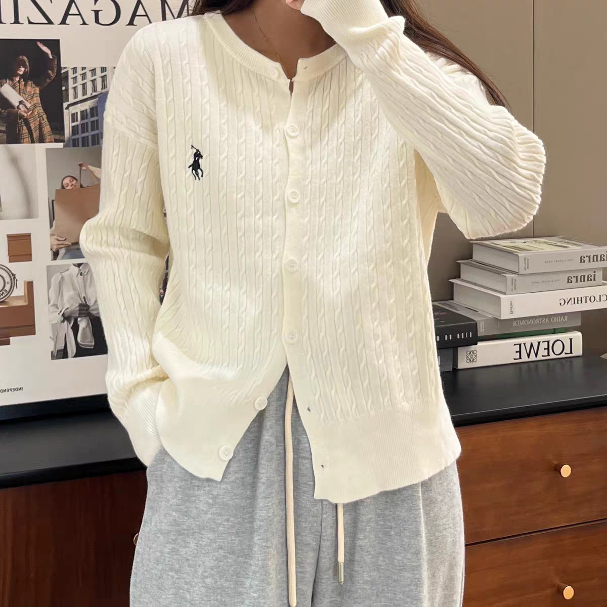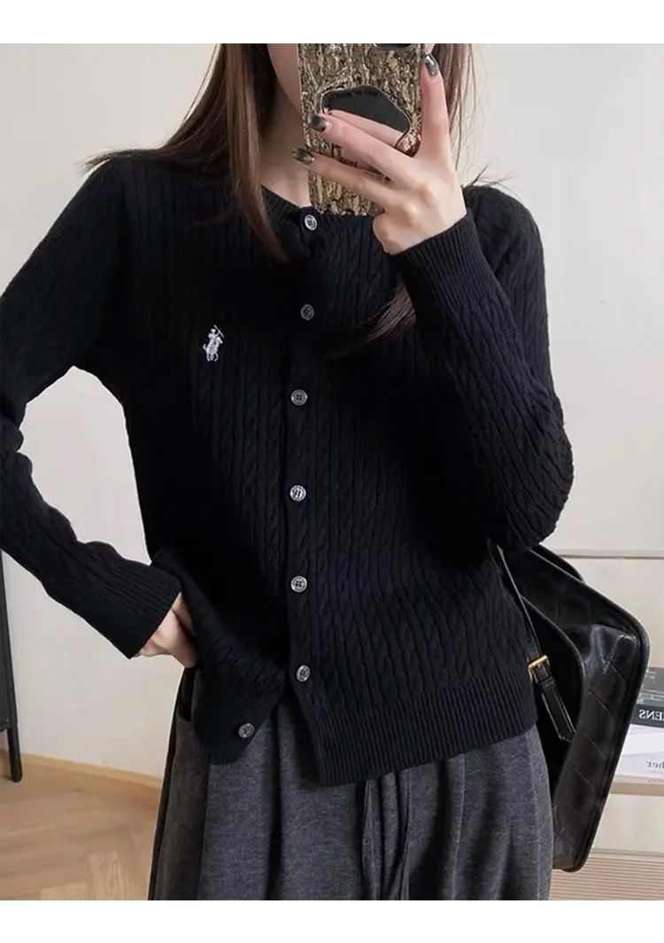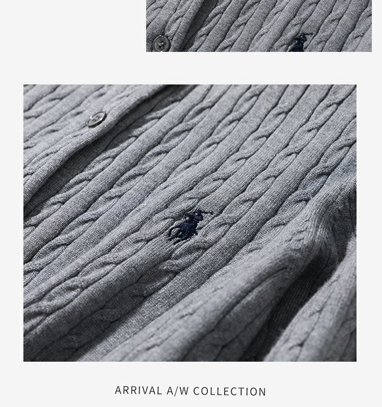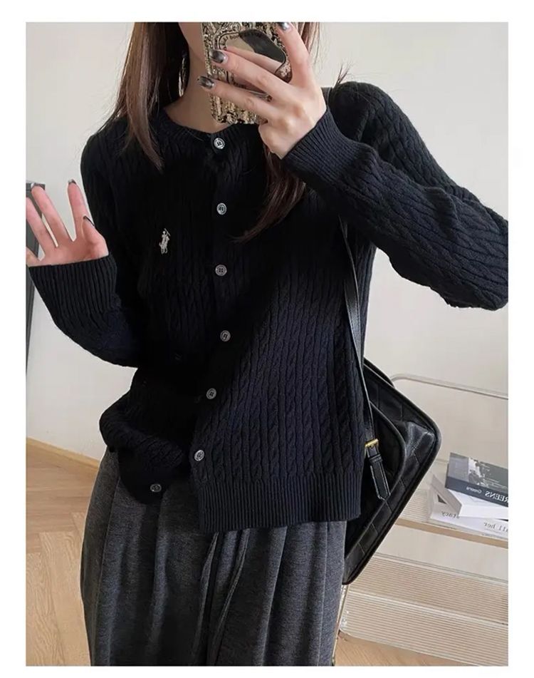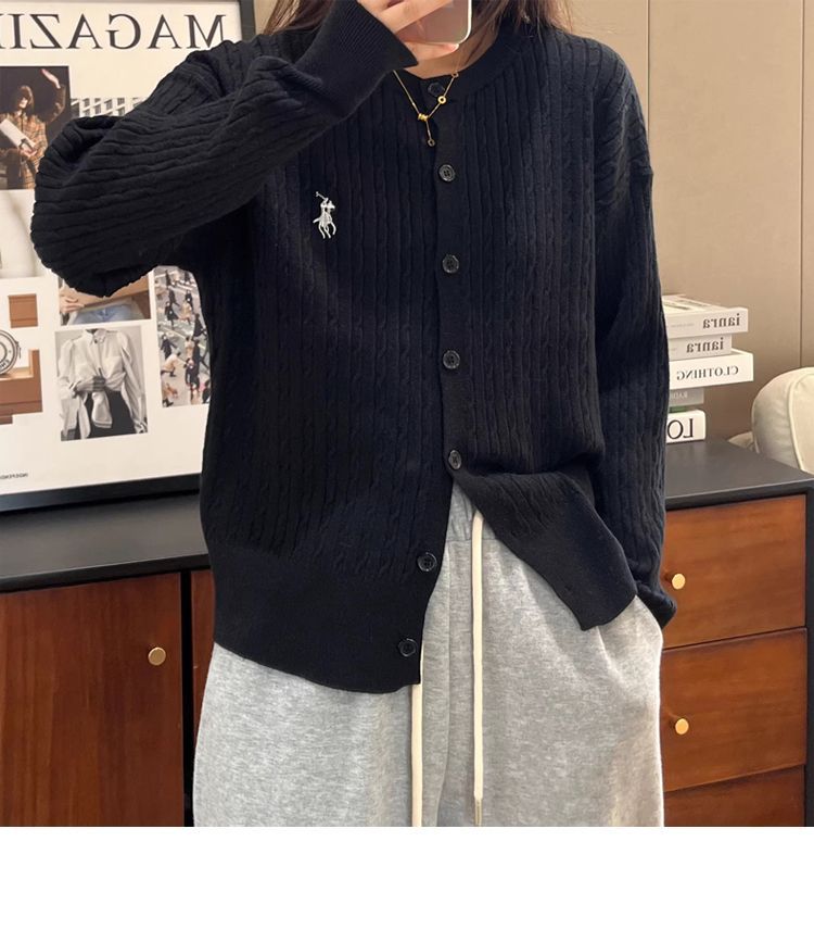 标题:三股纱小马刺绣麻花针织衫开衫毛衣女秋冬早春复古圆领外套上衣