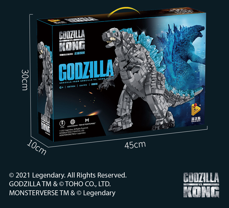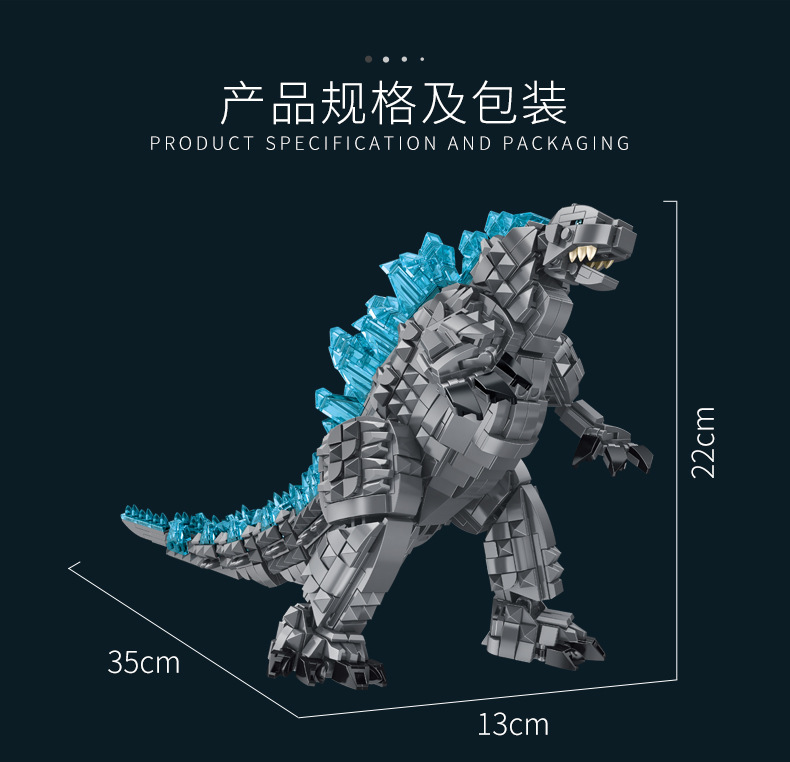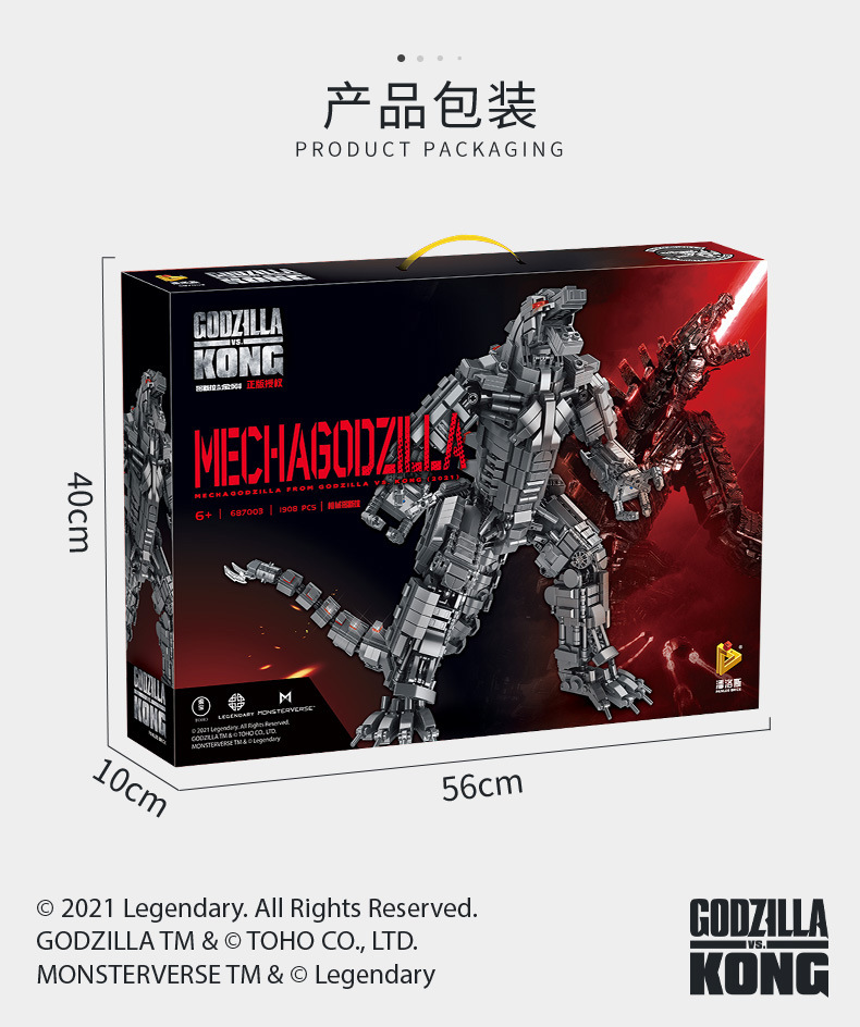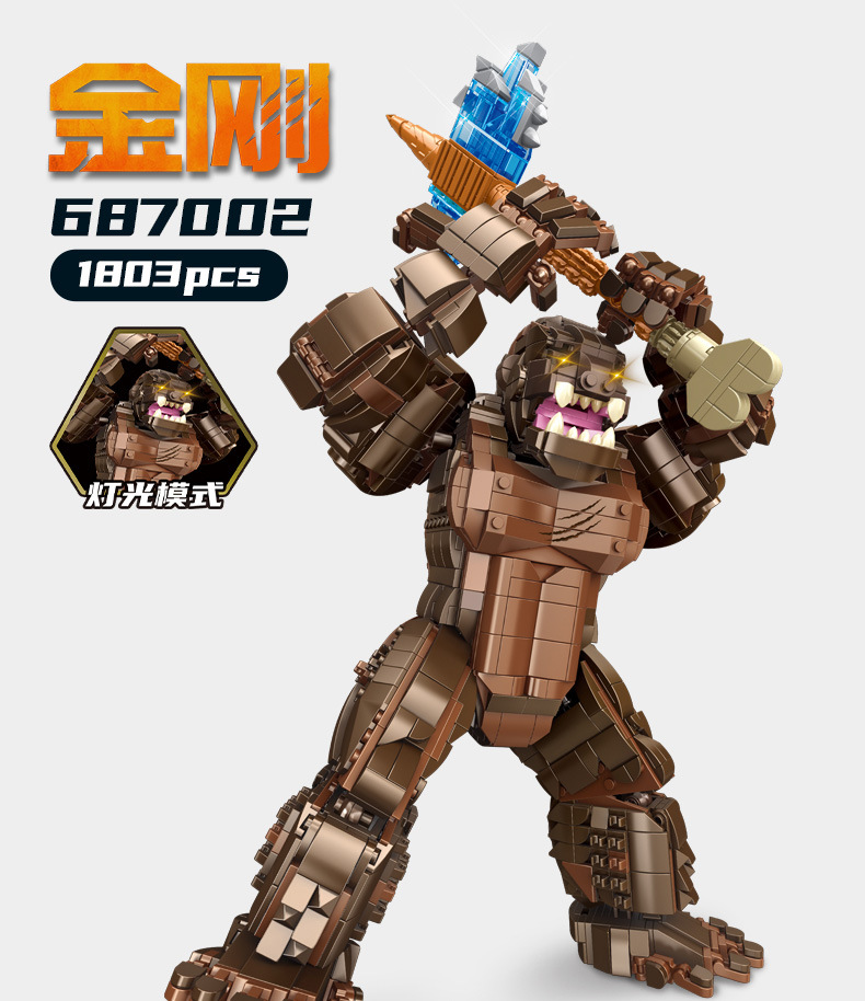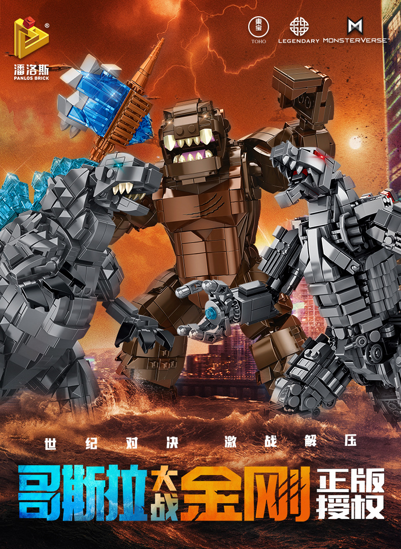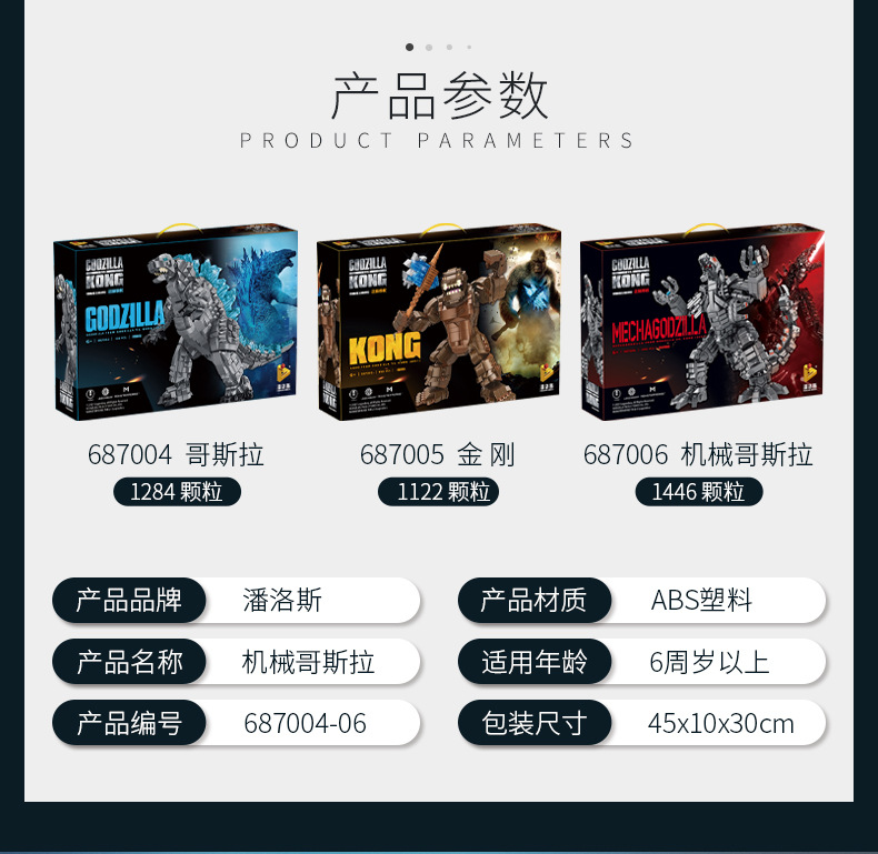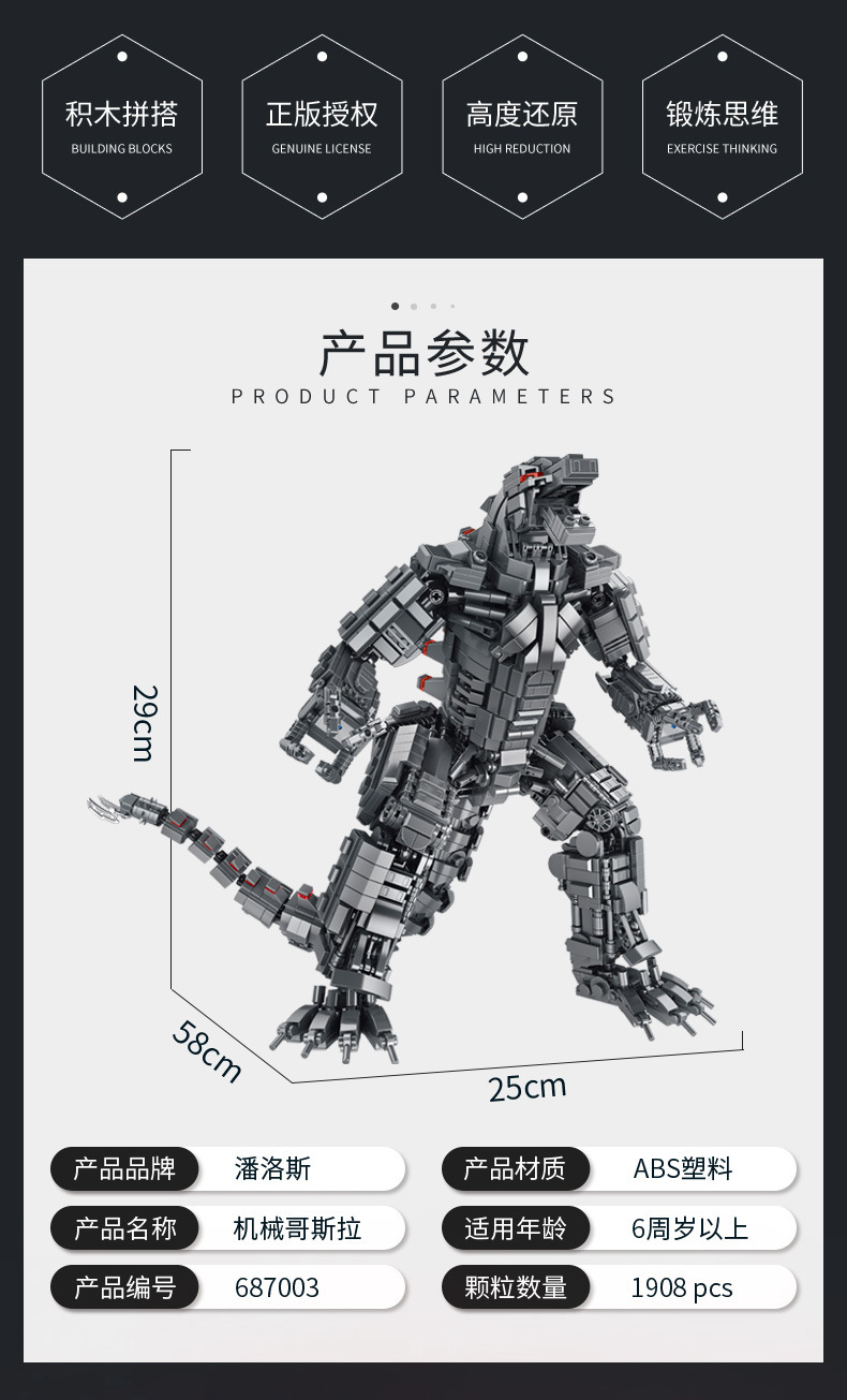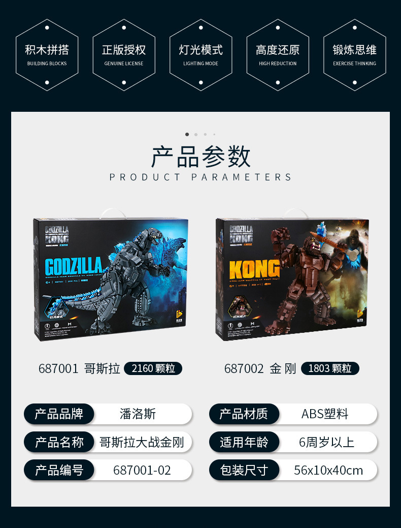 描述:3C配置类别:14岁以下的塑胶玩具,材质:塑料/塑胶,品牌:PANLOS BRICK/潘洛斯,货号:687001 687002 687003,产地:汕头,规格:56*40*10,是否电动:否,是否多功能:否,是否能够DIY:是,包装方式:彩盒,加工定制:否,是否外贸:否,塑料材质分类:ABS,塑料积木类型:小颗粒,积木粒(片)数:800粒(片)以上,积木净重:2.7KG,是否有动漫形象:否,是否有导购视频:否,多米诺类型:标准多米诺,是否专供外贸:否,商品3C认证码:2018152203021563,颜色:大型哥斯拉687001,大型金刚687002,大型机械哥斯拉 687003,中号哥斯拉 687004,中号金刚 687005,中号机械哥斯拉 687006,主要下游平台:ebay,亚马逊,wish,速卖通,独立站,LAZADA,主要销售地区:非洲,欧洲,南美,东南亚,北美,东北亚,中东,有可授权的自有品牌:是,是否跨境出口专供货源:是,适用年龄:少年(7-14岁),