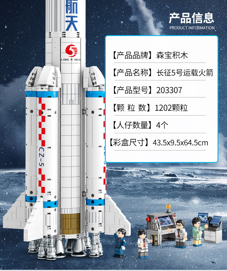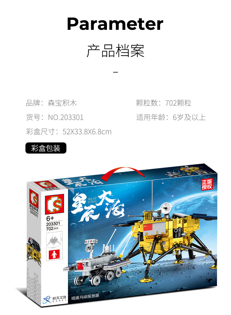 描述:3C配置类别:14岁以下的塑胶玩具,材质:塑料/塑胶,品牌:森宝积木,货号:203301 203304 203307,产地:汕头,规格:37.5*56*8CM,是否电动:否,是否多功能:否,是否能够DIY:是,包装方式:彩盒,加工定制:否,是否外贸:否,塑料材质分类:ABS,塑料积木类型:小颗粒,积木粒(片)数:800粒(片)以上,积木净重:1.5KG,是否有动漫形象:否,是否有导购视频:否,多米诺类型:标准多米诺,是否专供外贸:否,商品3C认证码:2018152203022778,颜色:月球探测器 203301,载人飞船 203304,运载火箭 203307,主要下游平台:ebay,亚马逊,wish,速卖通,独立站,LAZADA,主要销售地区:非洲,欧洲,南美,东南亚,北美,东北亚,中东,有可授权的自有品牌:是,是否跨境出口专供货源:是,适用年龄:少年(7-14岁),
