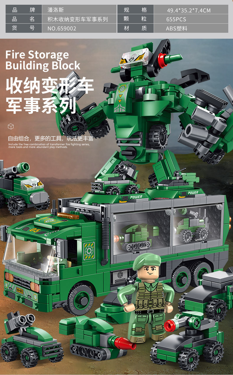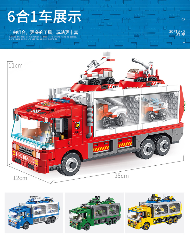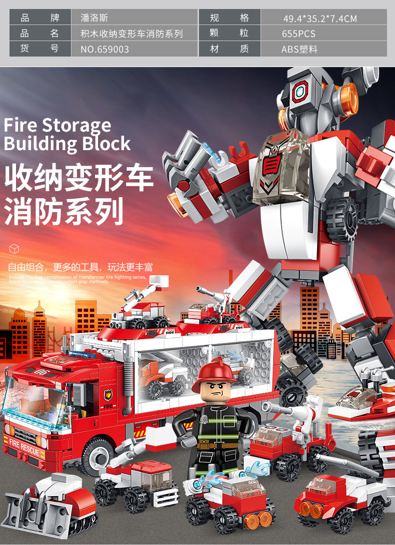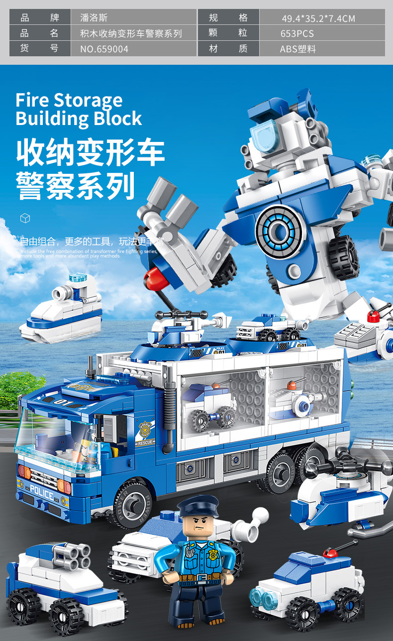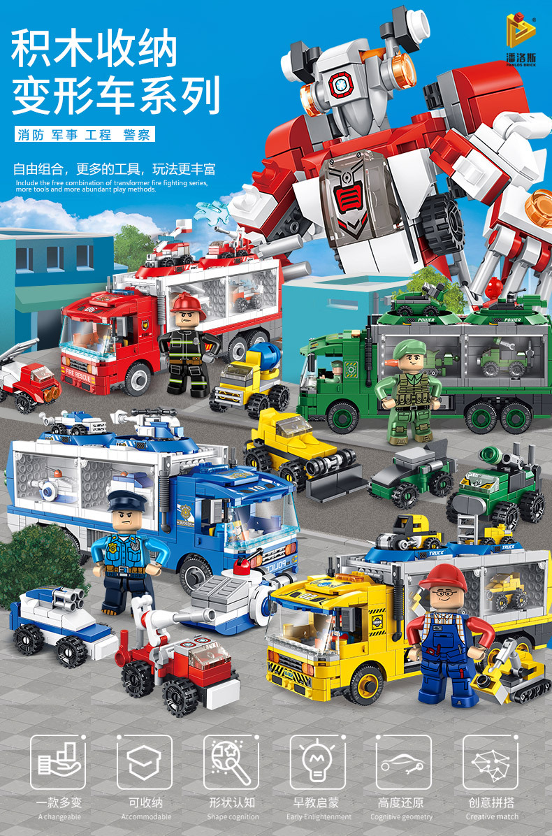标题:潘洛斯工程消防警察军事积木变形收纳车兼容乐高男孩拼装积木玩具