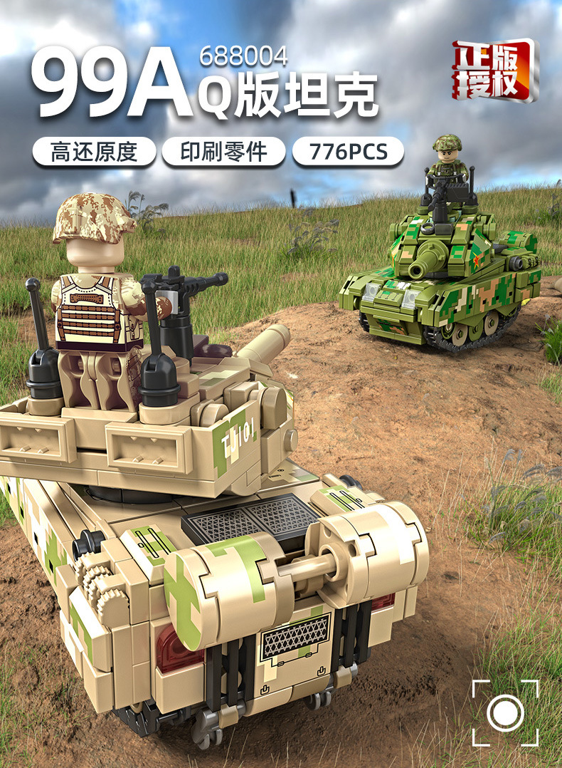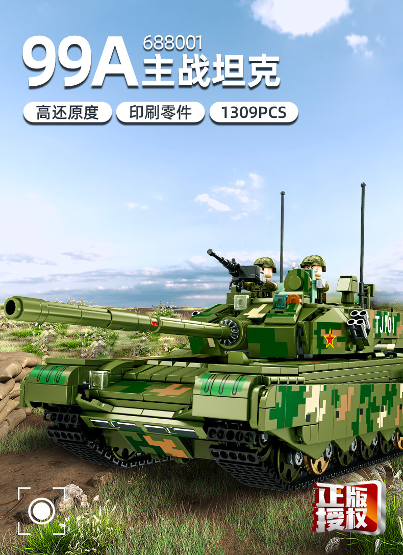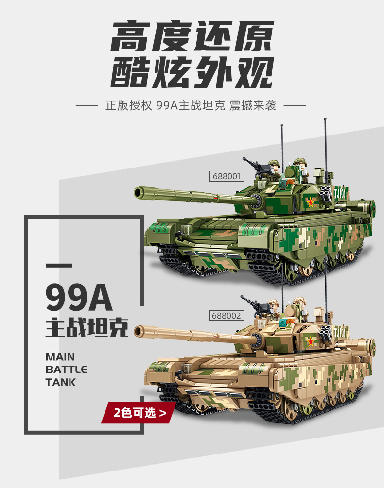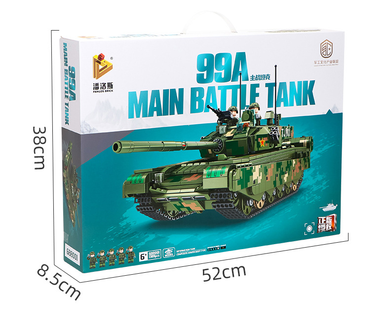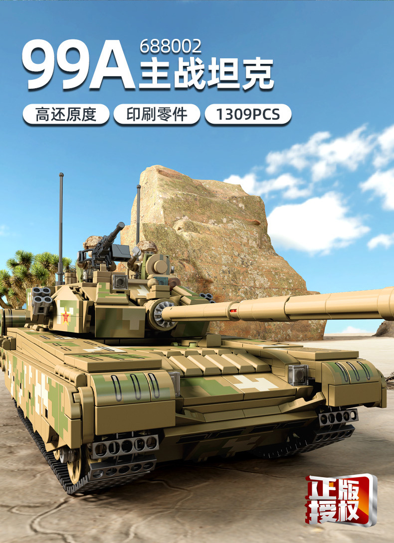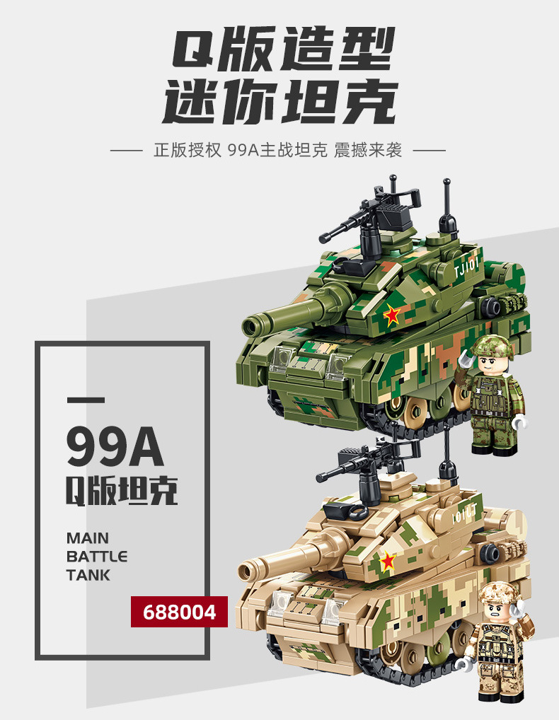 描述:3C配置类别:14岁以下的塑胶玩具,材质:塑料/塑胶,品牌:PANLOS BRICK/潘洛斯,货号:688001-688010,产地:汕头,规格:52*38*8.5,是否电动:否,是否多功能:否,是否能够DIY:否,包装方式:彩盒,加工定制:否,是否外贸:否,塑料材质分类:ABS,塑料积木类型:小颗粒,积木粒(片)数:800粒(片)以上,积木净重:3KG,是否有动漫形象:否,是否有导购视频:否,多米诺类型:标准多米诺,是否专供外贸:否,商品3C认证码:2018152203021563,颜色:99A主战坦克-绿色 688001,99A主战坦克-沙色 688002,99A坦克运输 688003,99AQ版坦克 688004,0609式履带自行高炮-绿色 688005,0609式履带自行高炮-沙色 688006,155自行火炮-绿色 688007,155自行火炮-绿色 688008,胶龙号潜水器 688009,深海科考船 688010,主要下游平台:ebay,亚马逊,wish,速卖通,独立站,LAZADA,主要销售地区:非洲,欧洲,南美,东南亚,北美,东北亚,中东,有可授权的自有品牌:是,是否跨境出口专供货源:是,适用年龄:少年(7-14岁),