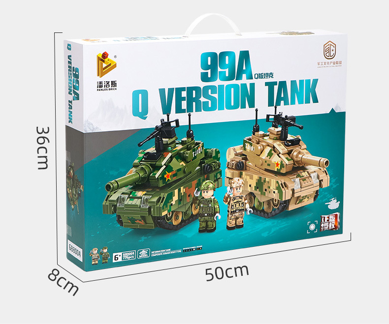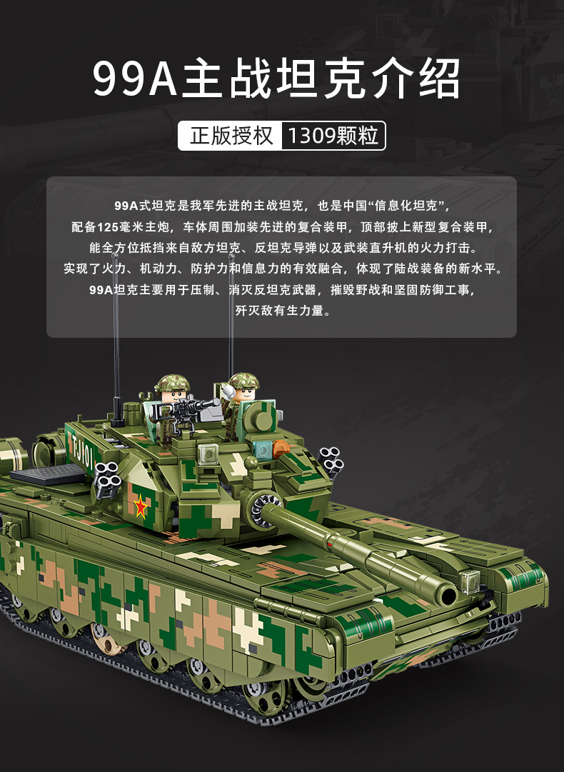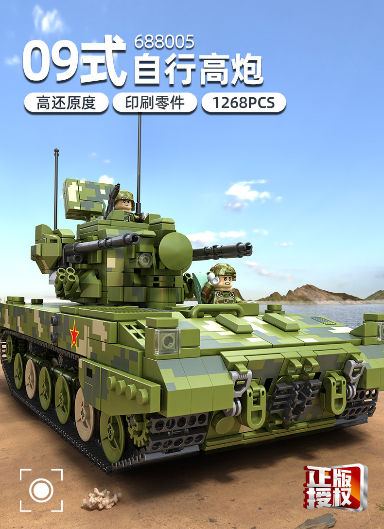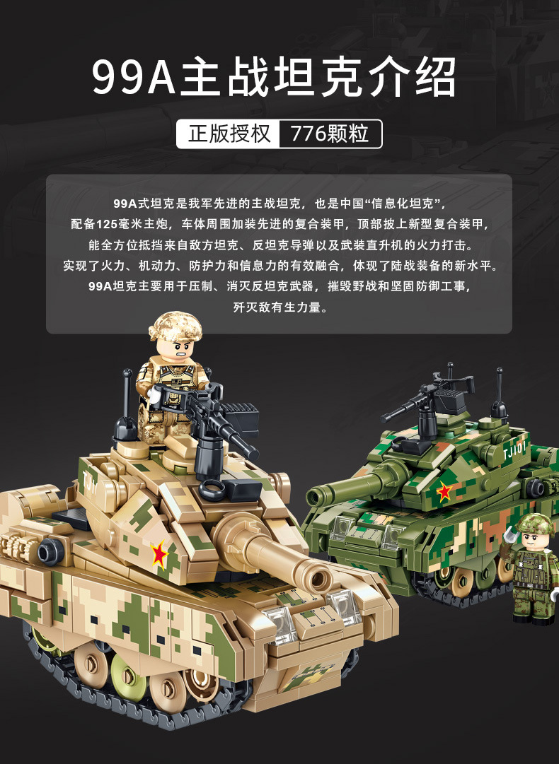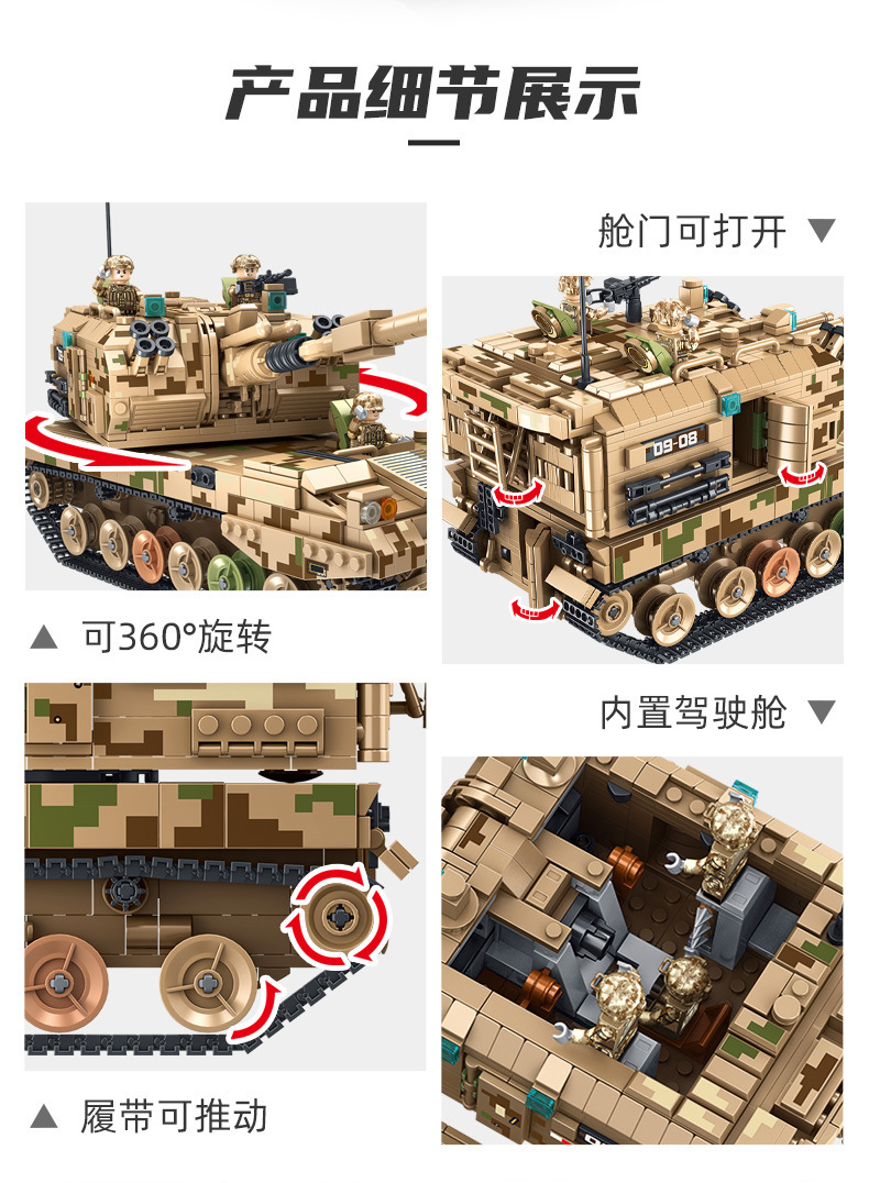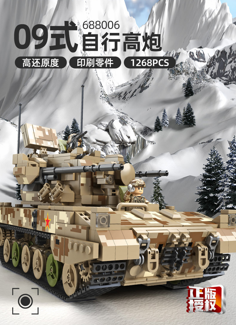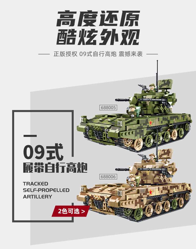 描述:3C配置类别:14岁以下的塑胶玩具,材质:塑料/塑胶,品牌:PANLOS BRICK/潘洛斯,货号:688001-688010,产地:汕头,规格:52*38*8.5,是否电动:否,是否多功能:否,是否能够DIY:否,包装方式:彩盒,加工定制:否,是否外贸:否,塑料材质分类:ABS,塑料积木类型:小颗粒,积木粒(片)数:800粒(片)以上,积木净重:3KG,是否有动漫形象:否,是否有导购视频:否,多米诺类型:标准多米诺,是否专供外贸:否,商品3C认证码:2018152203021563,颜色:99A主战坦克-绿色 688001,99A主战坦克-沙色 688002,99A坦克运输 688003,99AQ版坦克 688004,0609式履带自行高炮-绿色 688005,0609式履带自行高炮-沙色 688006,155自行火炮-绿色 688007,155自行火炮-绿色 688008,胶龙号潜水器 688009,深海科考船 688010,主要下游平台:ebay,亚马逊,wish,速卖通,独立站,LAZADA,主要销售地区:非洲,欧洲,南美,东南亚,北美,东北亚,中东,有可授权的自有品牌:是,是否跨境出口专供货源:是,适用年龄:少年(7-14岁),
