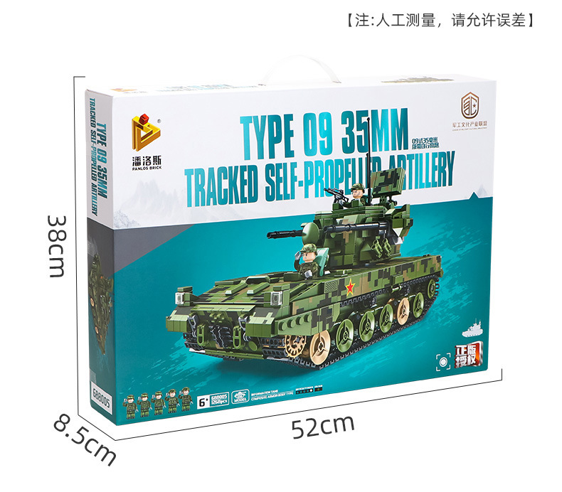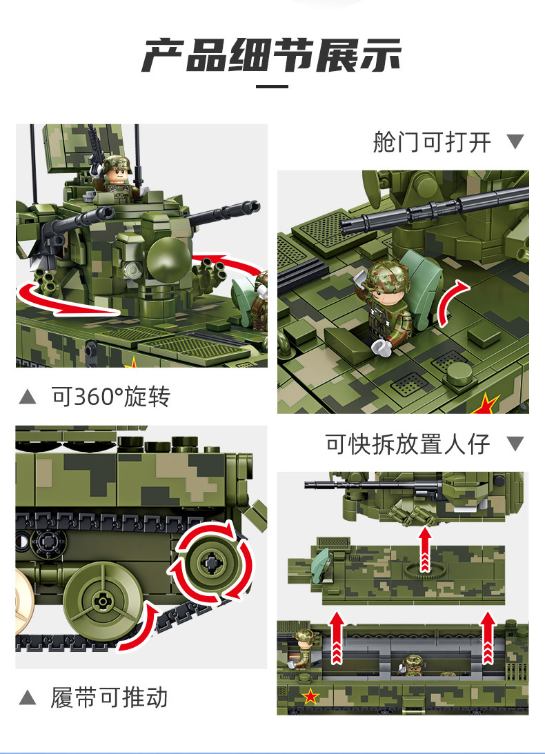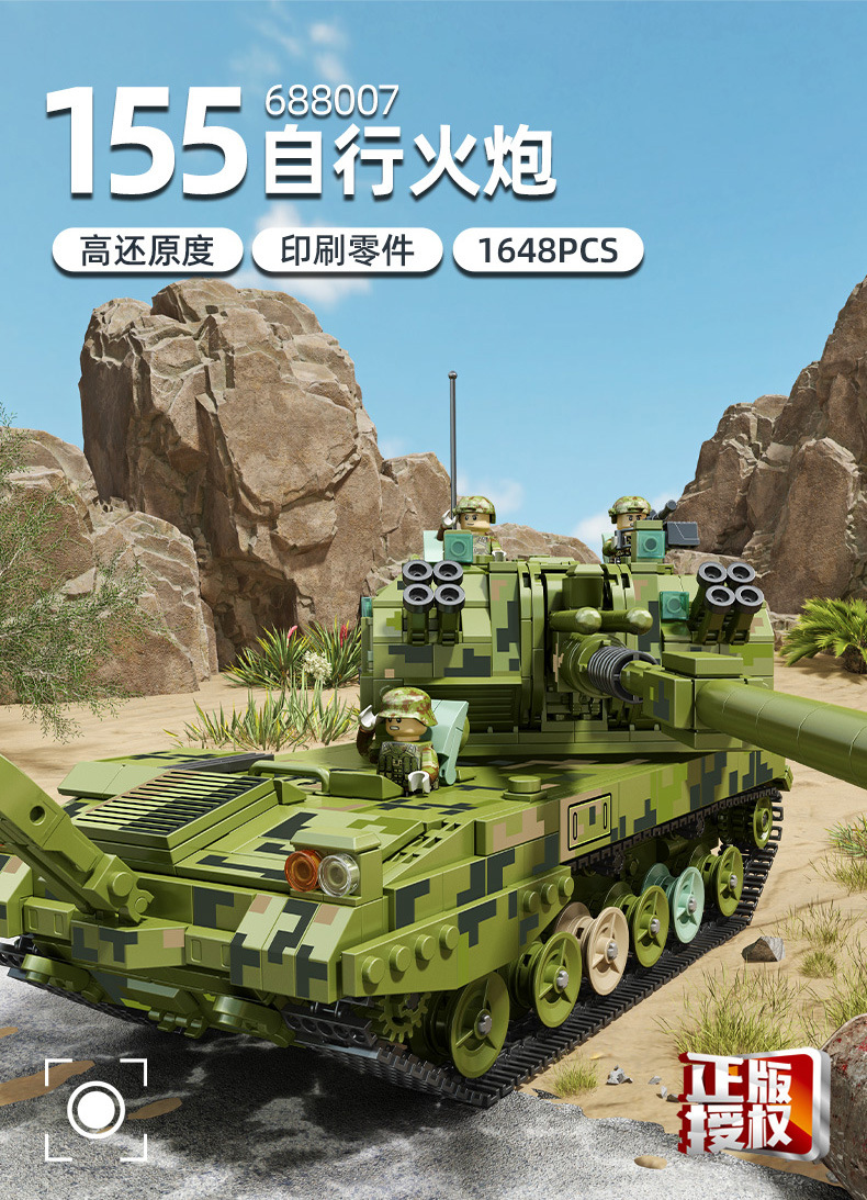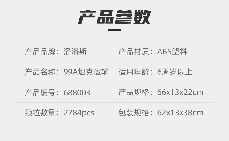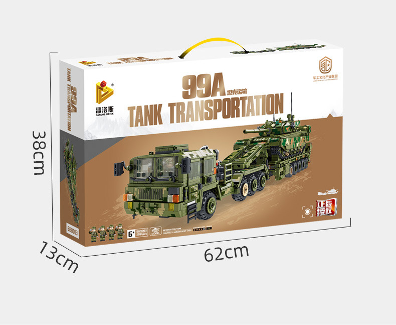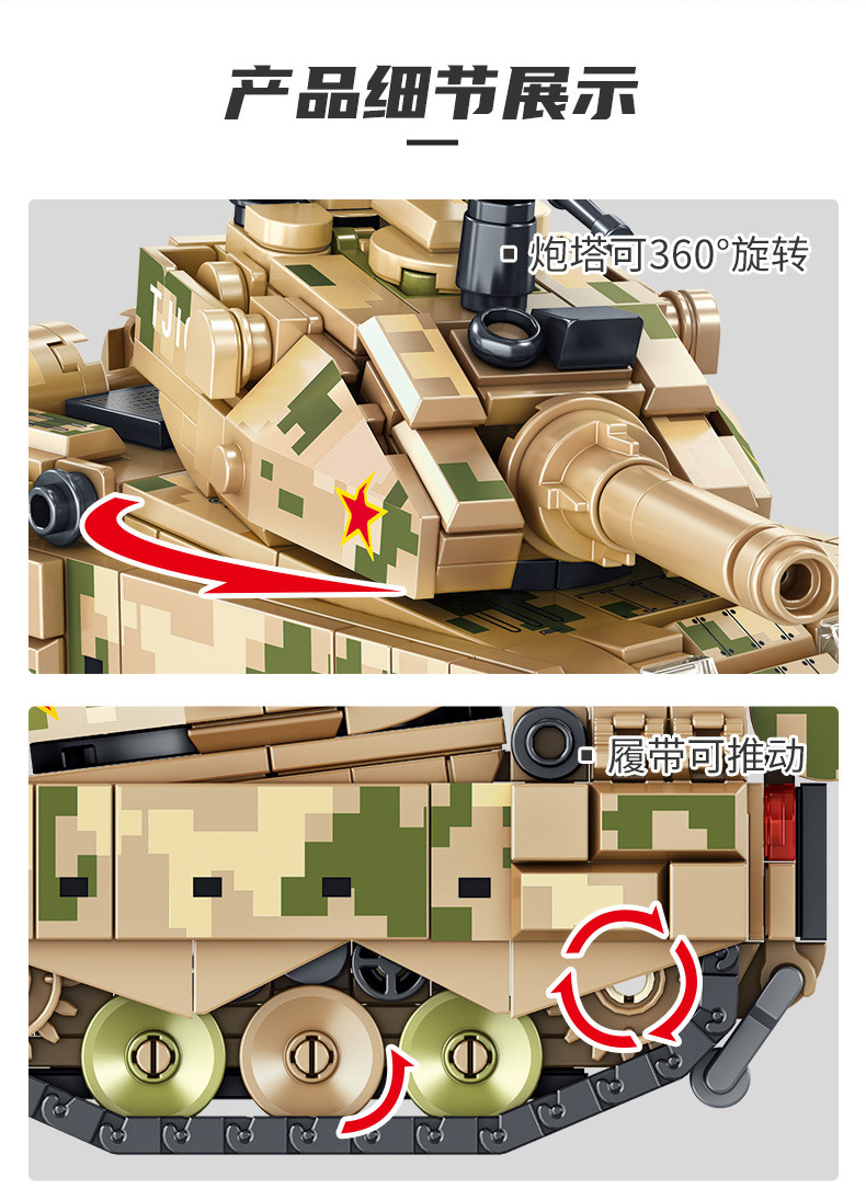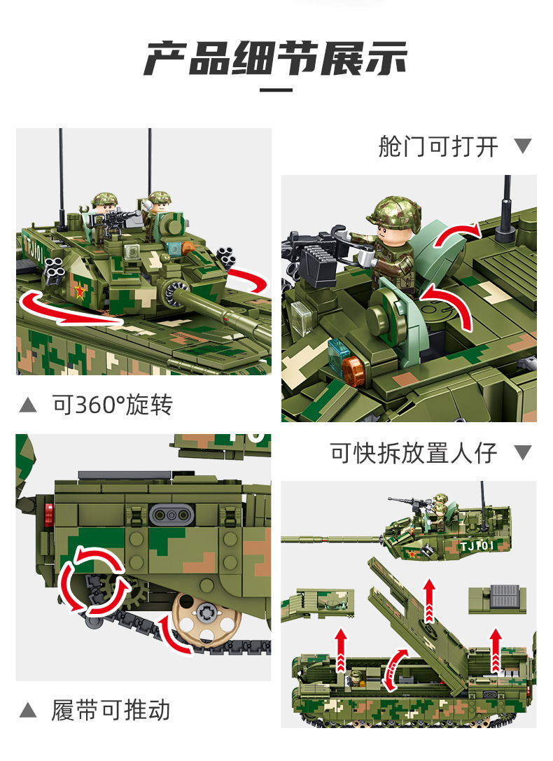 描述:3C配置类别:14岁以下的塑胶玩具,材质:塑料/塑胶,品牌:PANLOS BRICK/潘洛斯,货号:688001-688010,产地:汕头,规格:52*38*8.5,是否电动:否,是否多功能:否,是否能够DIY:否,包装方式:彩盒,加工定制:否,是否外贸:否,塑料材质分类:ABS,塑料积木类型:小颗粒,积木粒(片)数:800粒(片)以上,积木净重:3KG,是否有动漫形象:否,是否有导购视频:否,多米诺类型:标准多米诺,是否专供外贸:否,商品3C认证码:2018152203021563,颜色:99A主战坦克-绿色 688001,99A主战坦克-沙色 688002,99A坦克运输 688003,99AQ版坦克 688004,0609式履带自行高炮-绿色 688005,0609式履带自行高炮-沙色 688006,155自行火炮-绿色 688007,155自行火炮-绿色 688008,胶龙号潜水器 688009,深海科考船 688010,主要下游平台:ebay,亚马逊,wish,速卖通,独立站,LAZADA,主要销售地区:非洲,欧洲,南美,东南亚,北美,东北亚,中东,有可授权的自有品牌:是,是否跨境出口专供货源:是,适用年龄:少年(7-14岁),