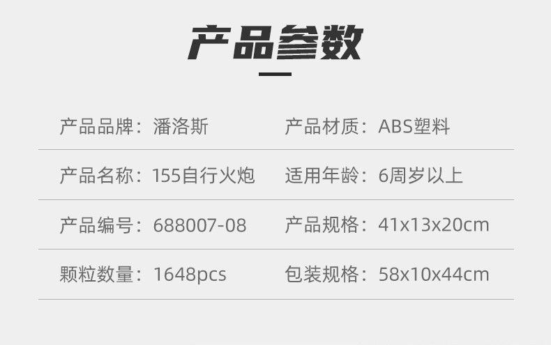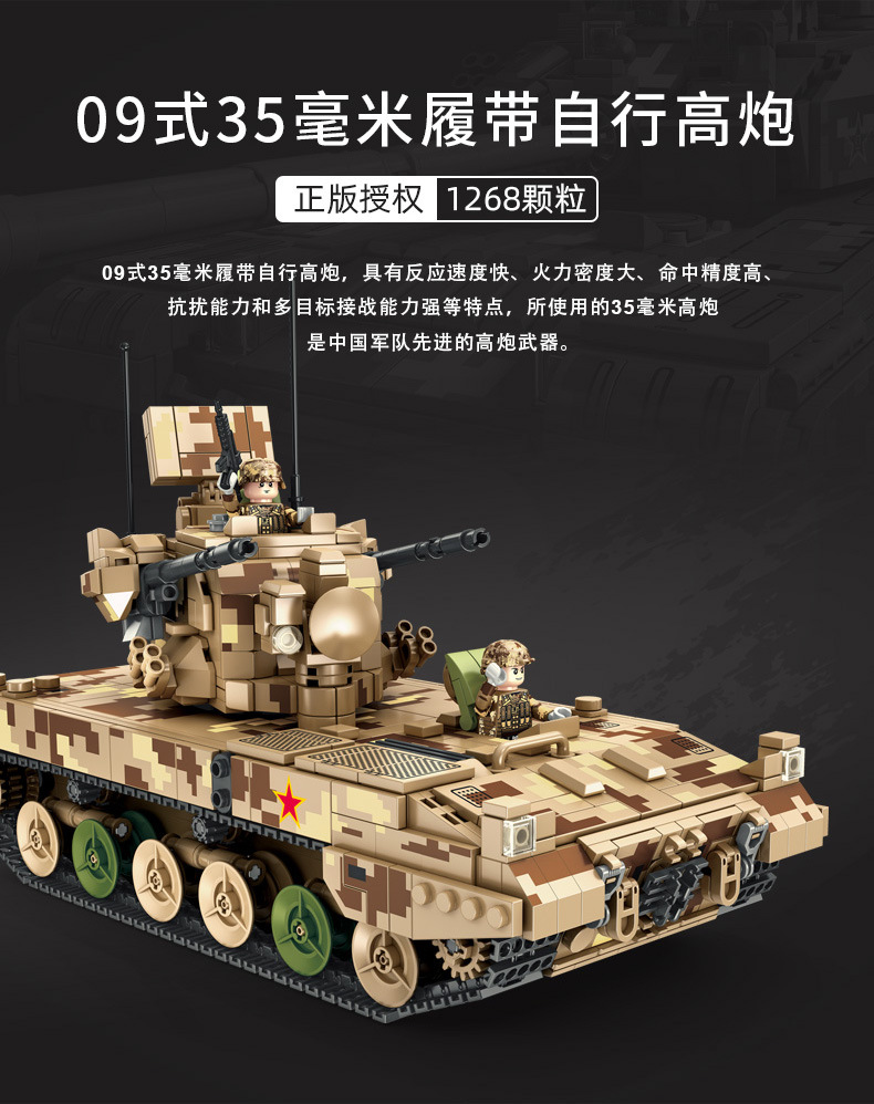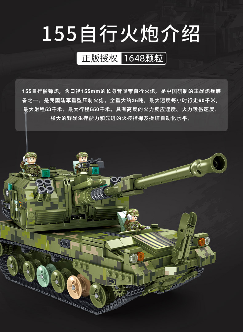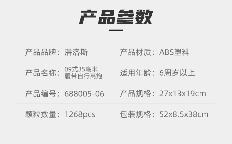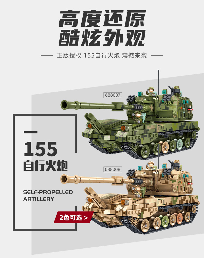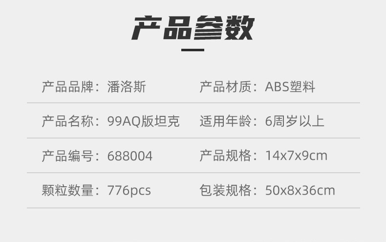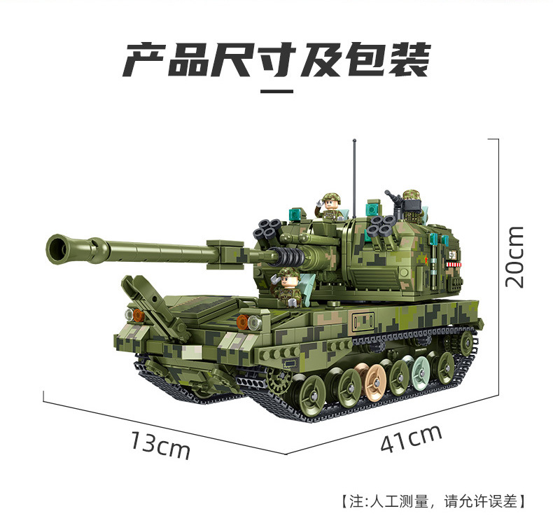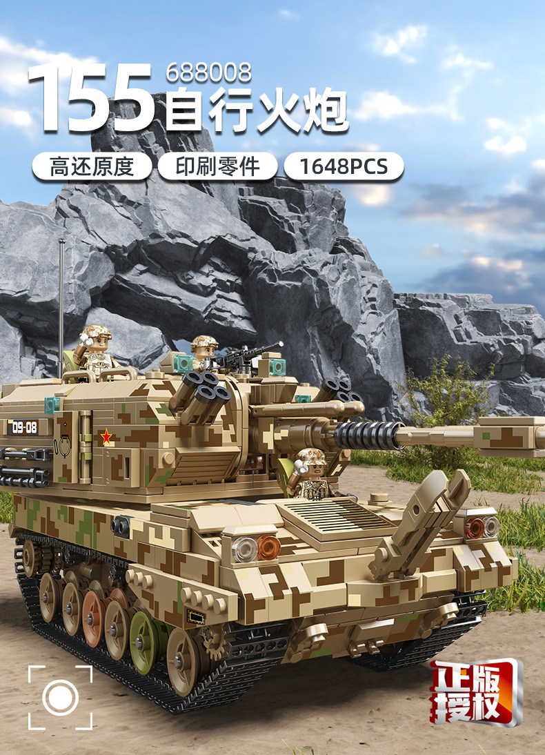 描述:3C配置类别:14岁以下的塑胶玩具,材质:塑料/塑胶,品牌:PANLOS BRICK/潘洛斯,货号:688001-688010,产地:汕头,规格:52*38*8.5,是否电动:否,是否多功能:否,是否能够DIY:否,包装方式:彩盒,加工定制:否,是否外贸:否,塑料材质分类:ABS,塑料积木类型:小颗粒,积木粒(片)数:800粒(片)以上,积木净重:3KG,是否有动漫形象:否,是否有导购视频:否,多米诺类型:标准多米诺,是否专供外贸:否,商品3C认证码:2018152203021563,颜色:99A主战坦克-绿色 688001,99A主战坦克-沙色 688002,99A坦克运输 688003,99AQ版坦克 688004,0609式履带自行高炮-绿色 688005,0609式履带自行高炮-沙色 688006,155自行火炮-绿色 688007,155自行火炮-绿色 688008,胶龙号潜水器 688009,深海科考船 688010,主要下游平台:ebay,亚马逊,wish,速卖通,独立站,LAZADA,主要销售地区:非洲,欧洲,南美,东南亚,北美,东北亚,中东,有可授权的自有品牌:是,是否跨境出口专供货源:是,适用年龄:少年(7-14岁),