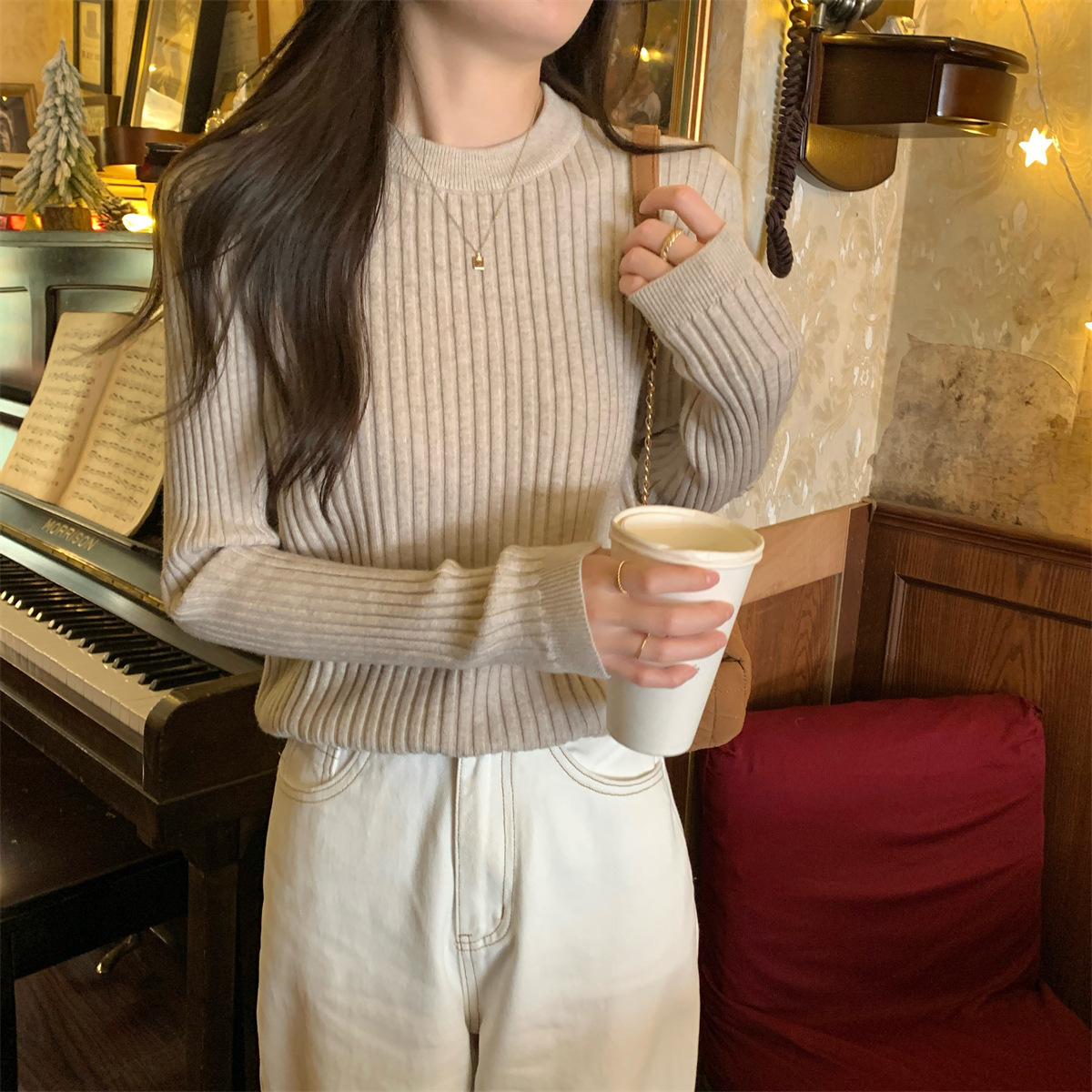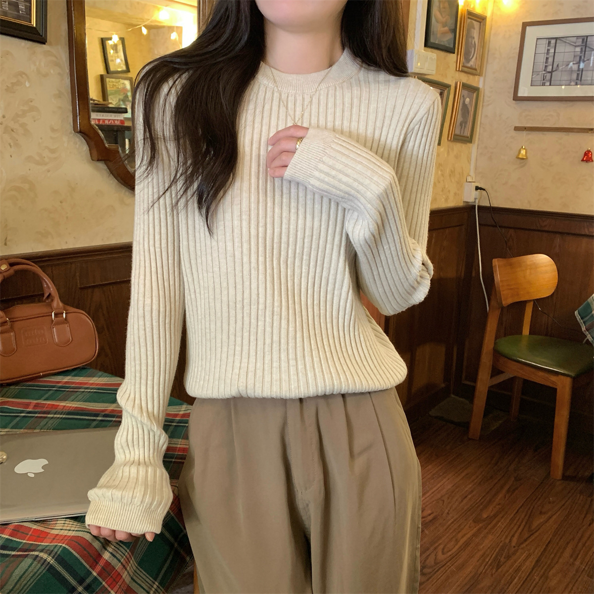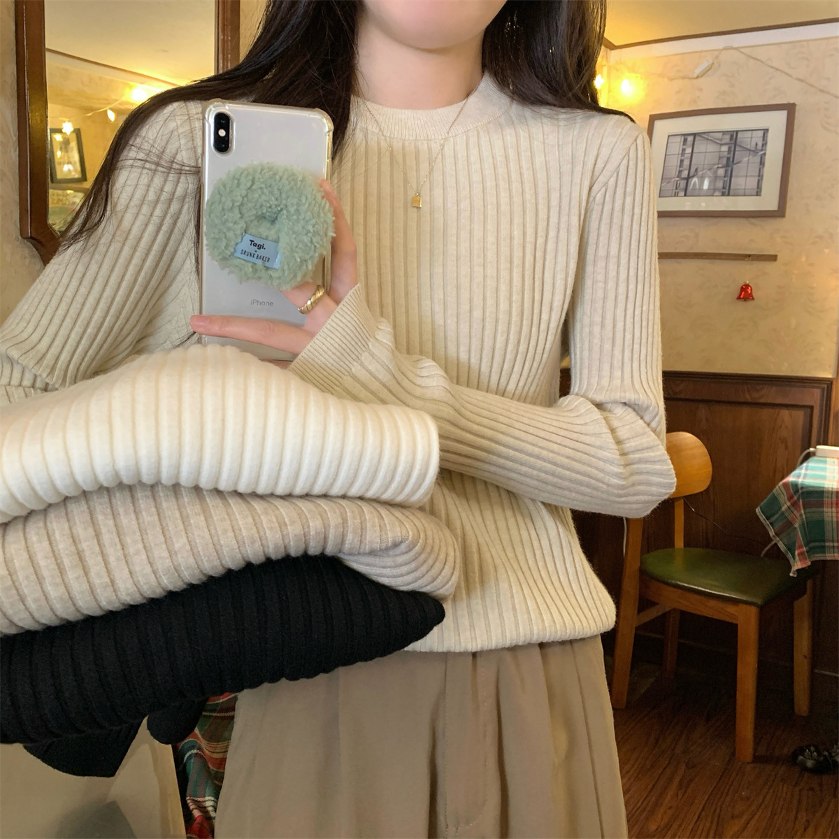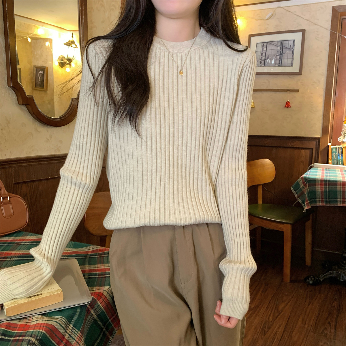 标题:ロンT ラウンドネックソリッドカラーインナースリムニットボトムシャツ秋冬2025新品の韓国語版